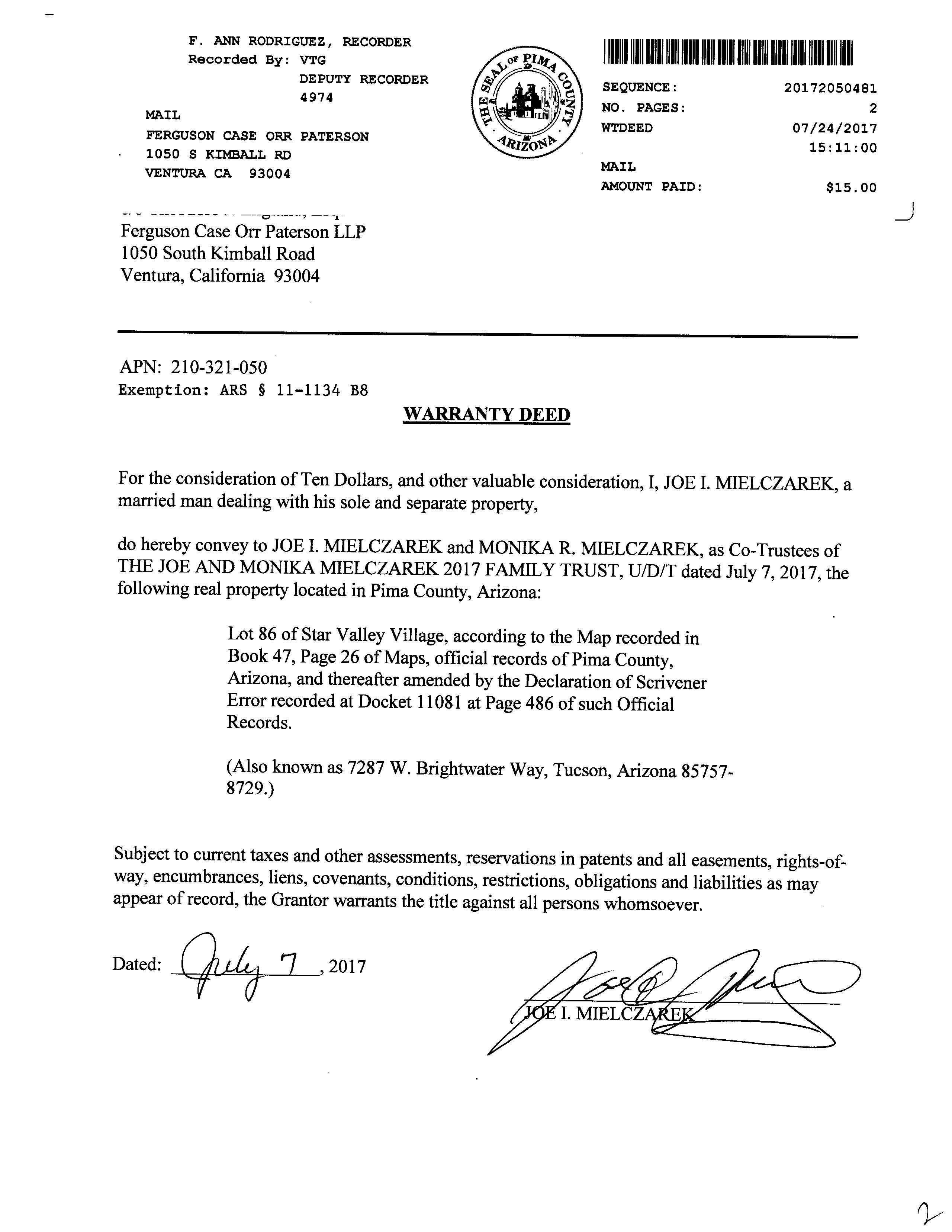 Subject Property : 7287 W Brightwater Way Tucson AZ 85757 Owner Information Owner Name : Mielczarek 2017 Family Tr Mailing Address : 7910 Liveoak Ave, Santa Paula CA 93060-9731 R001 Vesting Codes : / / Trust Owner OccupiedIndicator : A Location Information Legal Description : Star Valley Village Lot 86 County : Pima, Az APN : 210-32-1050 Census Tract / Block : 43.39 / 3 Subdivision : Star Valley Village Township-Range- Sect : 15S-12E-16 Map Reference : 16-15S-12E Legal Book/Page : 47-26 School District : Tucson Unified Legal Lot : 86 Munic/Township : Tucson Unified Market Area : 311 Owner Transfer Information Recording/Sale Date : 07/24/2017 / 07/07/2017 Deed Type : Warranty Deed Document # : 2050481 Last Market Sale Information Recording/Sale Date : 06/14/2002 / 06/00/2002 1st Mtg Int. Rate/Type : / Fixed Rate Loan Sale Price : $141,990 1st Mtg Document # : 11821-2894 Document # : 11821-2893 1st Mtg Term : 30 Deed Type : Warranty Deed Price Per SqFt : $81.70 1st Mtg Amount/Type : $100,000 / Cnv Title Company : Fidelity National Title Lender : Universal American Mtg Co Seller Name : U S Home Corporation Prior Sale Information Prior Rec/Sale Date : 01/02/2001 / 12/00/2000 Prior Doc Number : 11456-860 Prior Sale Price : $179,200 Prior Deed Type : Joint Tenancy Deed Customer Name : Lisa Mrazek Customer Company Name : First American Title Insurance Company Prepared On : 08/16/2022 © 2022 CoreLogic. All rights reserved