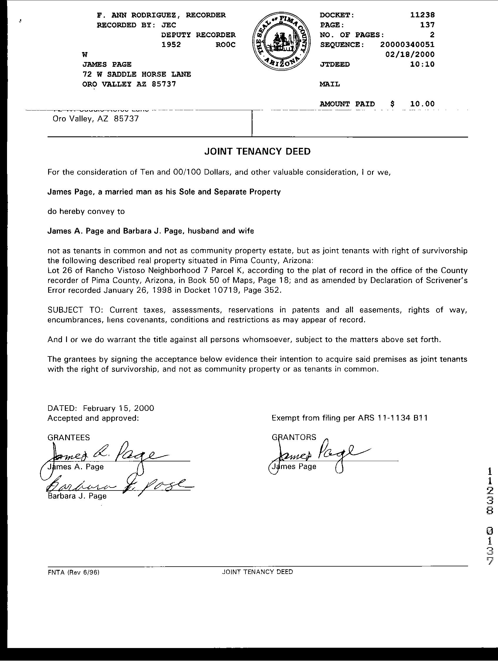 12820 N Camino Vieja Rancheria Oro Valley Az 85755 Owner Name: Plettner Ebenezer W /Campbell Kathryn M