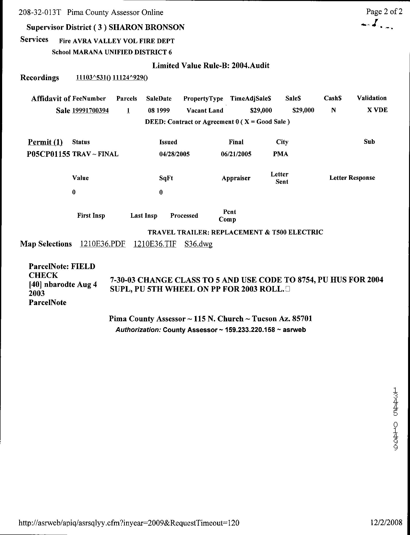 MAIL: 7581 N RAZORBACK RD MARANA AZ 85653-8643 LEGAL: AVRA VALLEY NO 4 PARCEL 103 & 122 R/S 3733/303 N2 S2 SW4 NW4 10 AC SEC 36-12-10