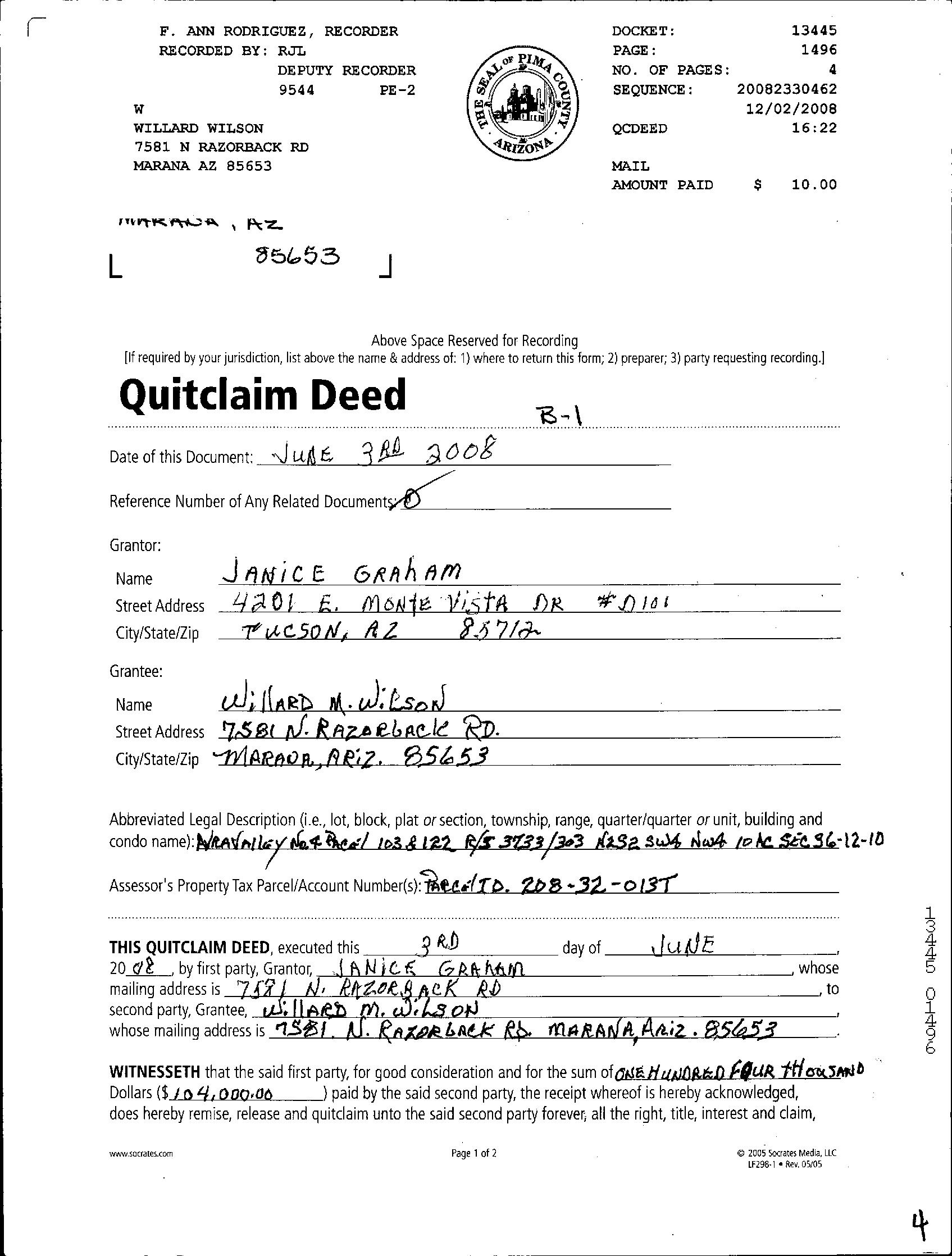 Recording/Sale Date : 12/02/2008 / 06/03/2008 Deed Type : Quit Claim Deed