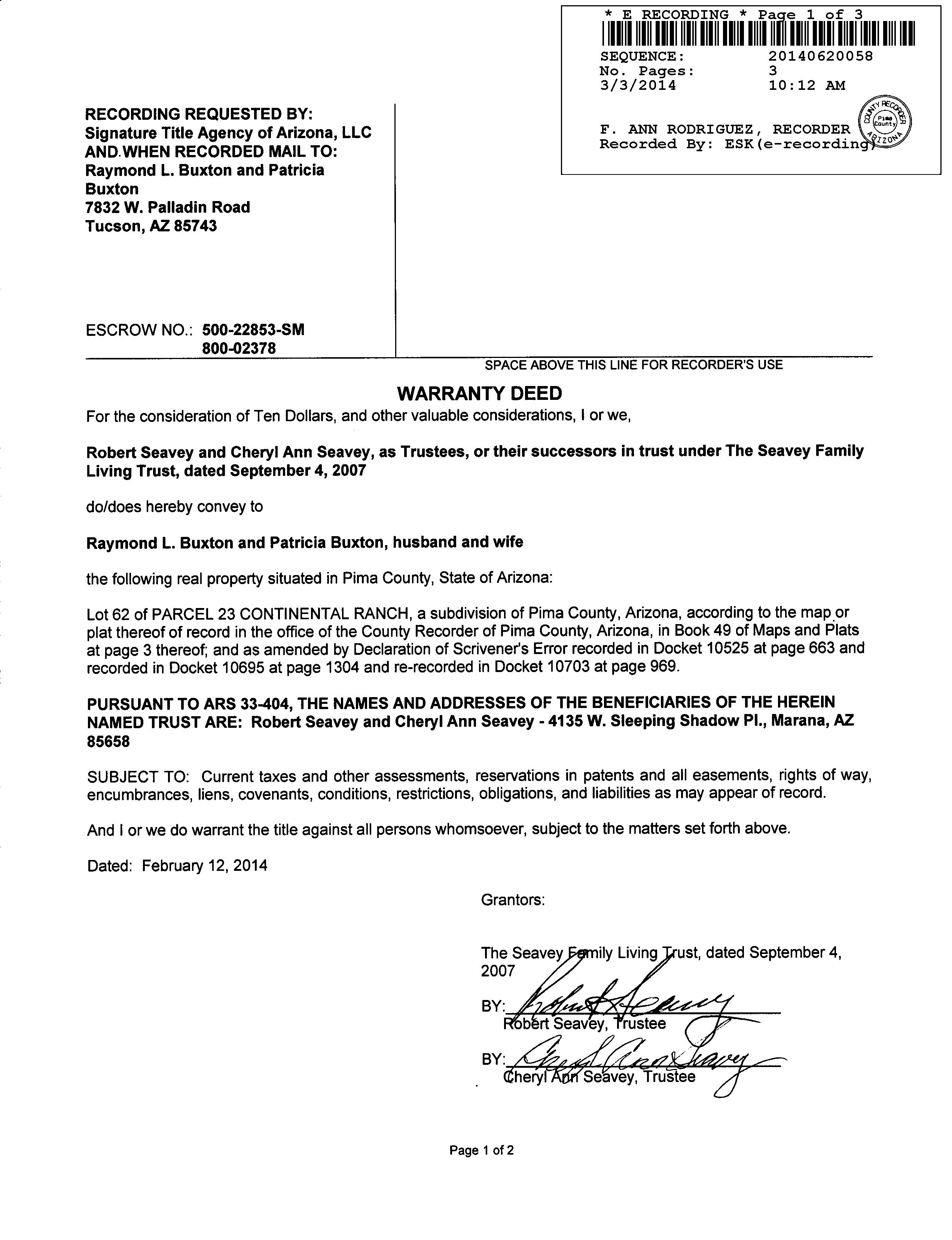 APN / Alternate APN: 226-10-0800 / Deed Type: Warranty Deed Land Use: Sfr Subdivision / Tract: Continental Ranch / Lot Size: 6,982 Year Built / Eff: 2000 / Rec. Date / Price: 03/03/2014 / $228,000 Living Area: 2,100 # of units: Document #: 620058 Bedrooms: Pool: Total Tax Value: $239,749 Bath(F/H): / #1 7781 W Peace Pipe Rd Tucson Az 85743