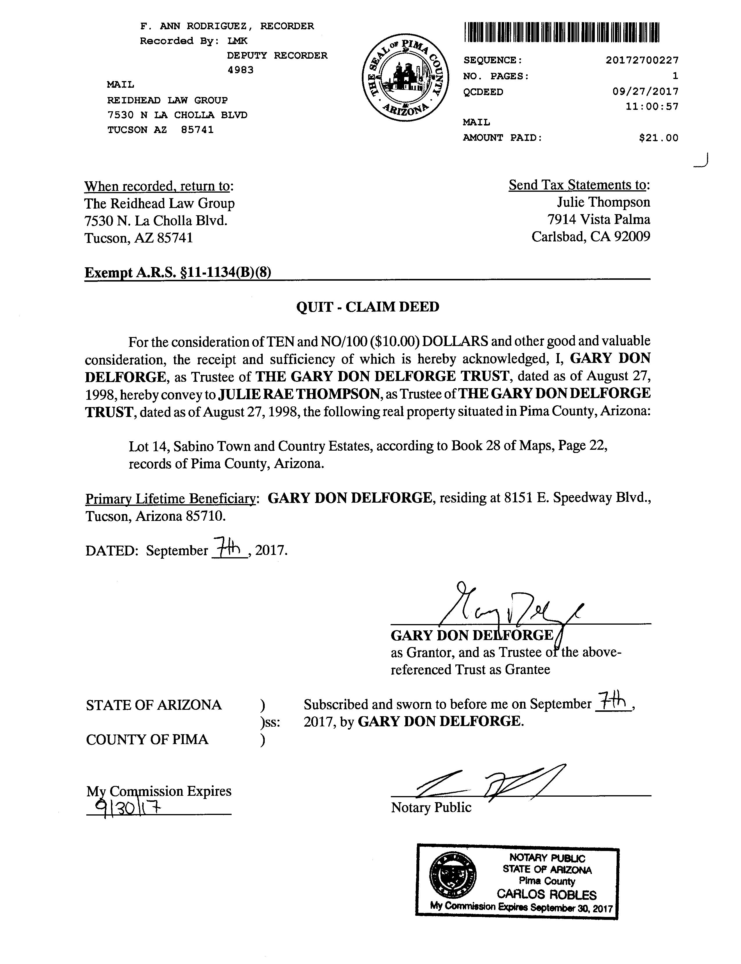 Legal Description : Sabino Town & Country Estates Lot 14 (9731/1522 10870/872)