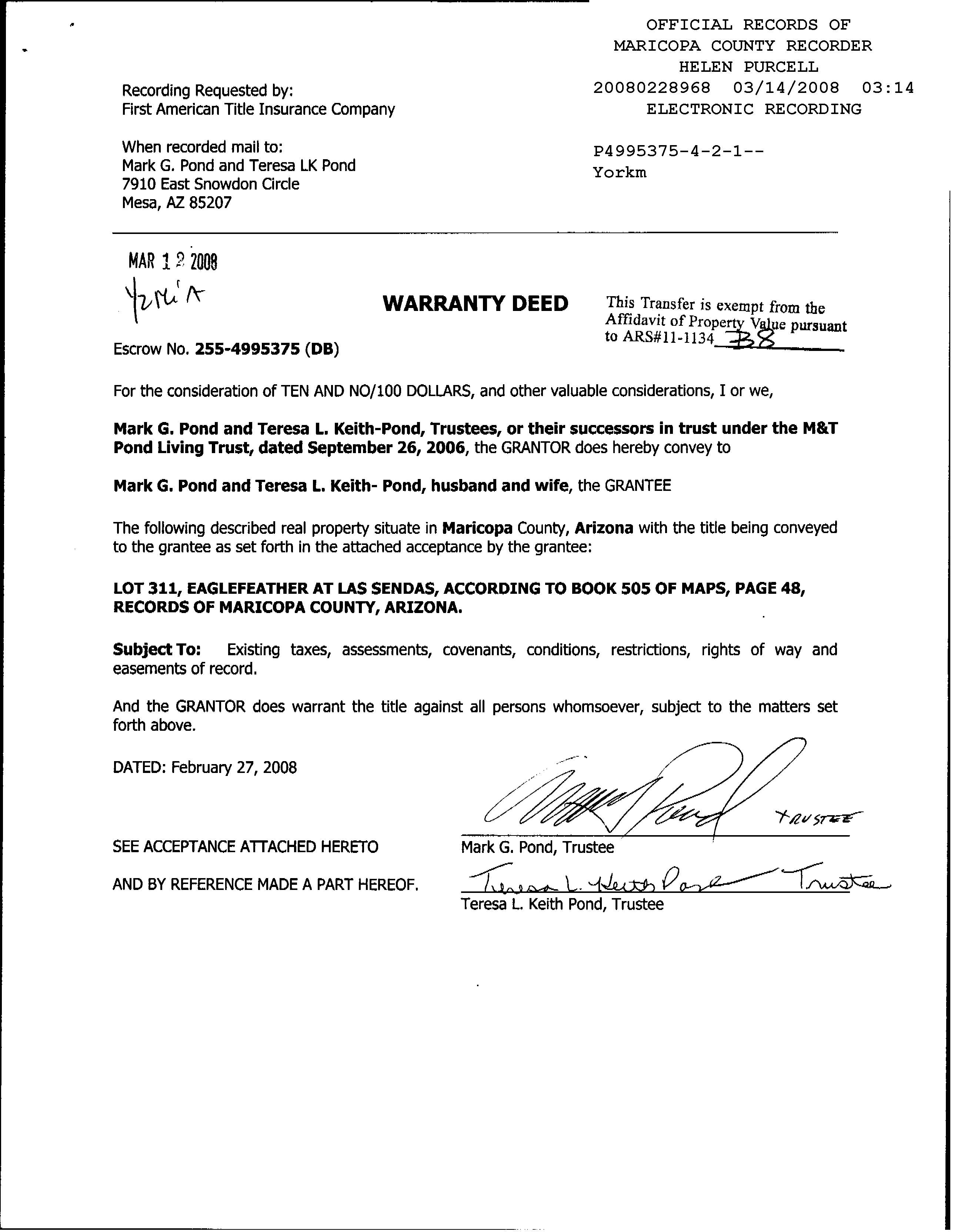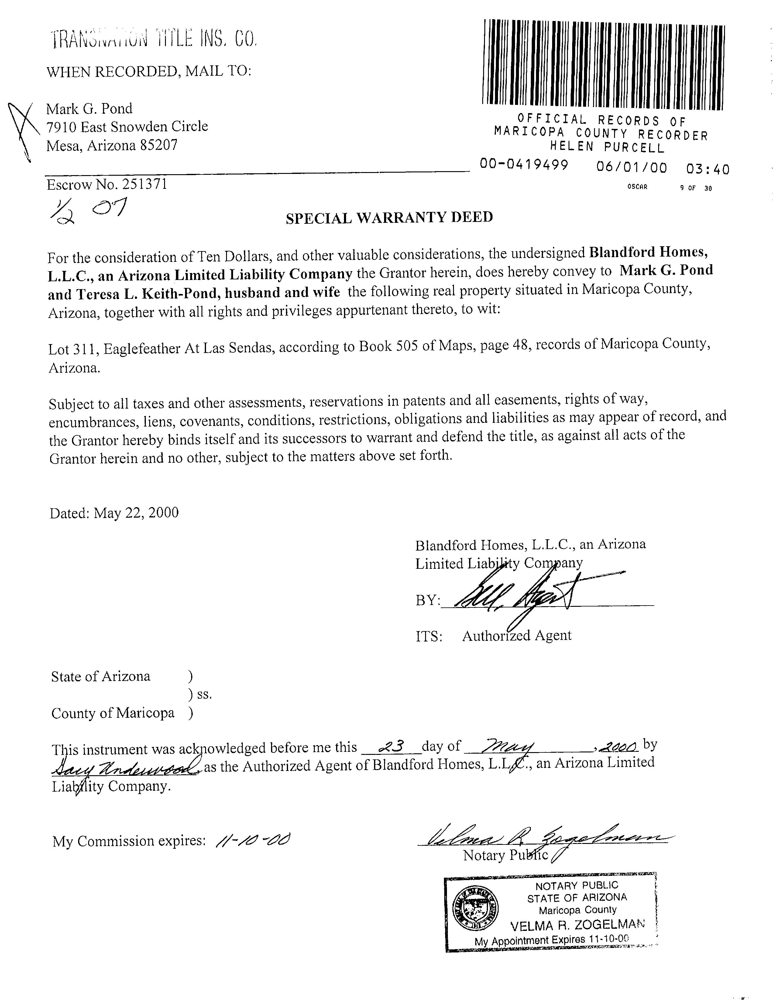 Legal Description : Lot 311 Eaglefeather At Las Sendas Mcr 505-48