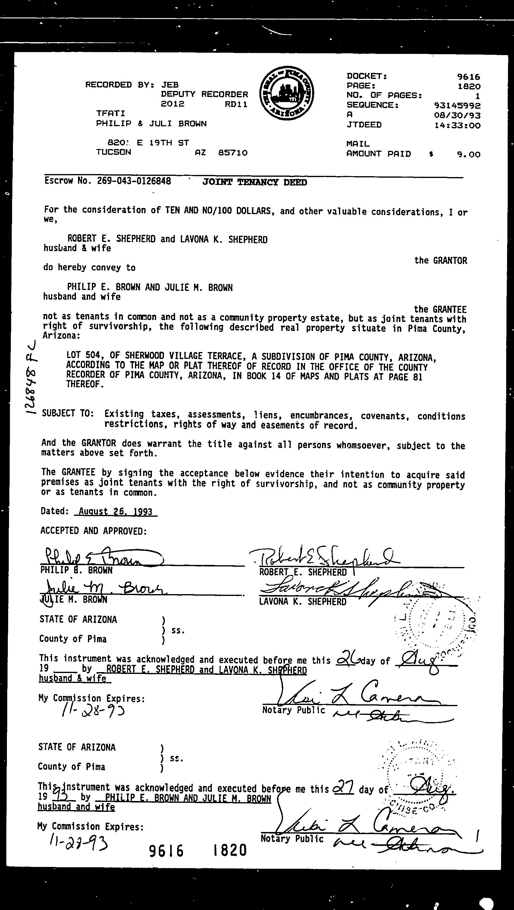 Deed Type: Joint Tenancy Deed Land Use: Sfr Subdivision / Tract: Sherwood Village Terrace / Lot Size: 9,935 Year Built / Eff: 1964 / Rec. Date / Price: 08/30/1993 / $85,500 Living Area: 2,037 # of units: Document #: 9616-1820 Bedrooms: Pool: Total Tax Value: $187,357 Bath(F/H): /