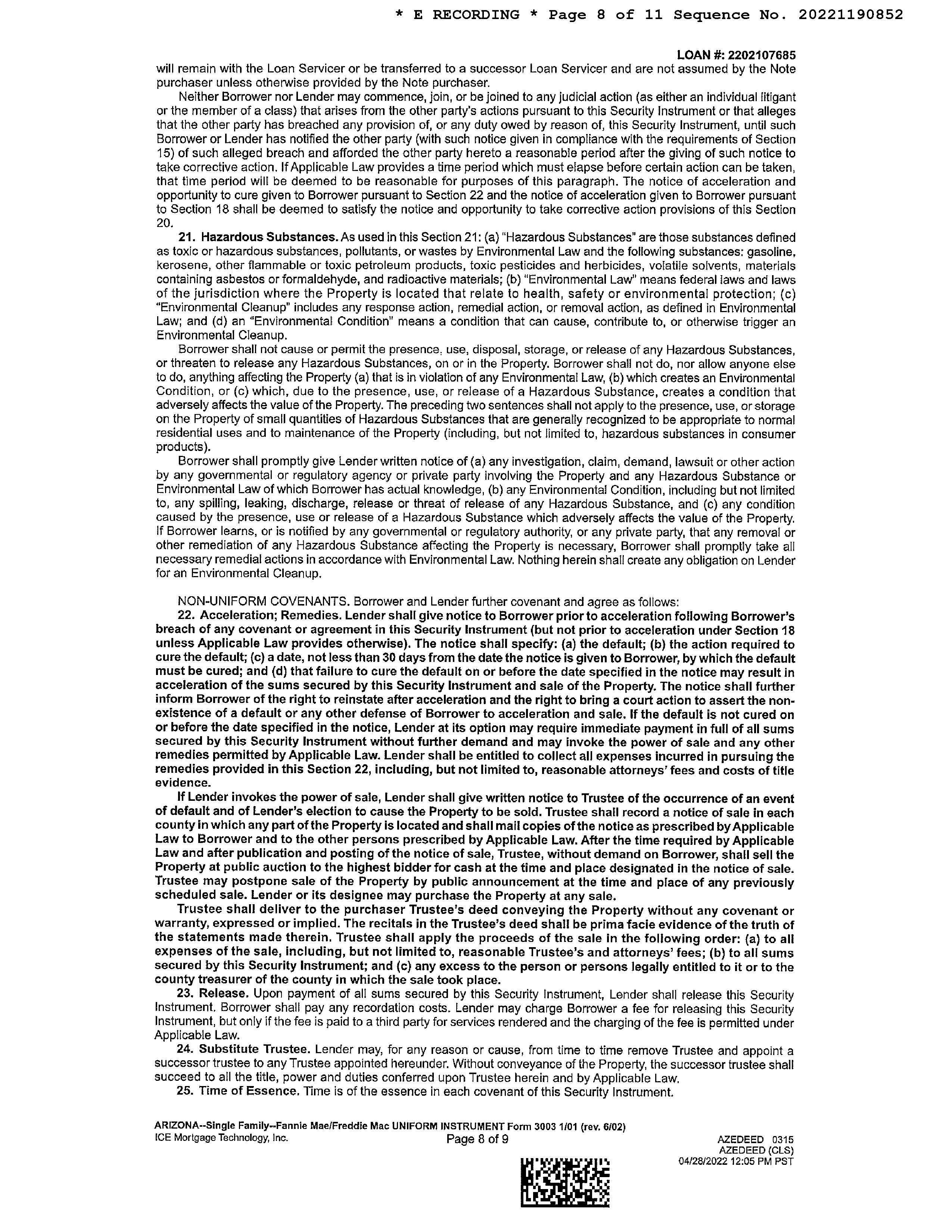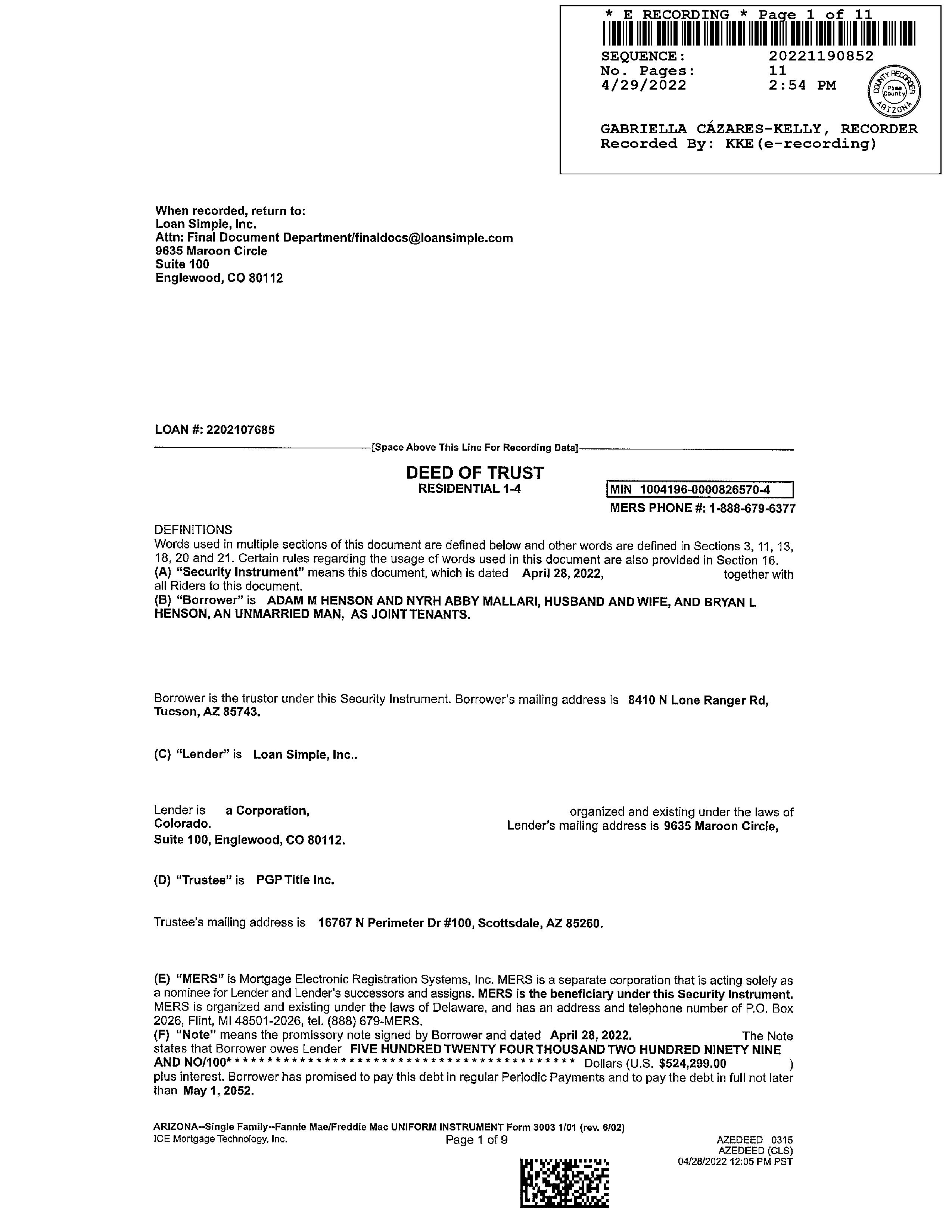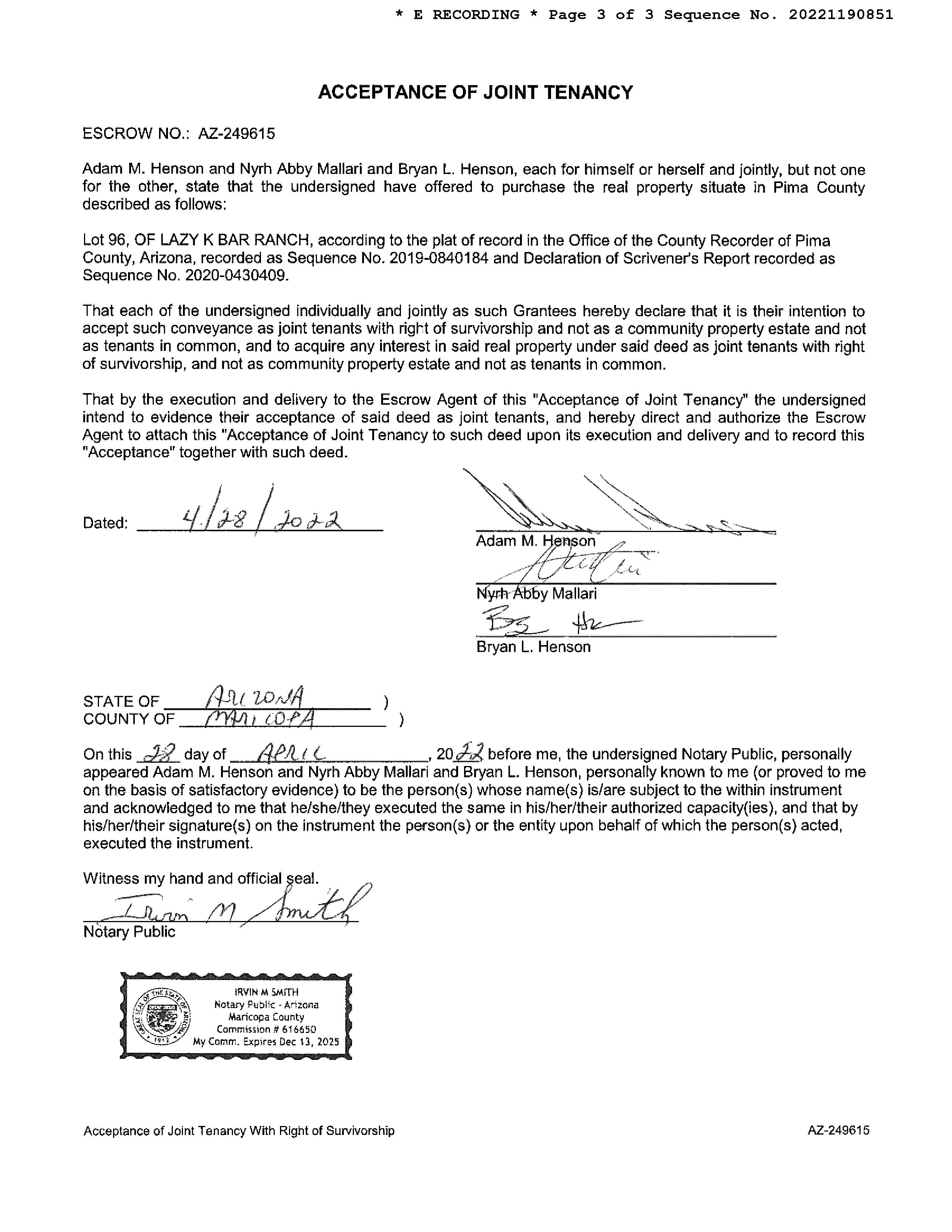 Subject Property : 8410 N Lone Ranger Rd Tucson AZ 85743 Owner Information Owner Name : Henson Adam M / Henson Bryan Mailing Address : 8410 N Lone Ranger Rd, Tucson AZ 85743 Vesting Codes : Unmarried Man / / Joint Tenants Owner OccupiedIndicator : O Location Information Legal Description : Lazy K Bar Ranch Sq20190840184 Lot 96 County : Pima, Az APN : 221-22-4760 Census Tract / Block : 44.23 / 1 Subdivision : Lazy K Bar Ranch Township-Range- Sect : 12S-12E-29 Map Reference : 29-12S-12E Legal Lot : 96 Last Market Sale Information Recording/Sale Date : 04/29/2022 / 04/22/2022 1st Mtg Amount/Type : $524,299 / Cnv Sale Price : $555,990 1st Mtg Document # : 1190852 Document # : 1190851 1st Mtg Term : 30 Deed Type : Special Warranty Deed Title Company : Pgp Title Seller Name : Trust 18300-t Prior Sale Information Prior Rec/Sale Date : 08/13/2020 / 08/11/2020 Prior Doc Number : 2260747 Prior Sale Price : $3,159,564 Prior Deed Type : Special Warranty Deed Property Information Land Use : Vacant Land (nec) Lot Acres : 0.14 State Use : Incomplete Subd Pcl-urb Subd County Use : Incomplete Subd Pcl-urb Subd Lot Size : 6,136 Customer Name : Jeremiah Stiffler Customer Company Name : First American Prepared On : 08/16/2022 © 2022 CoreLogic. All rights reserved