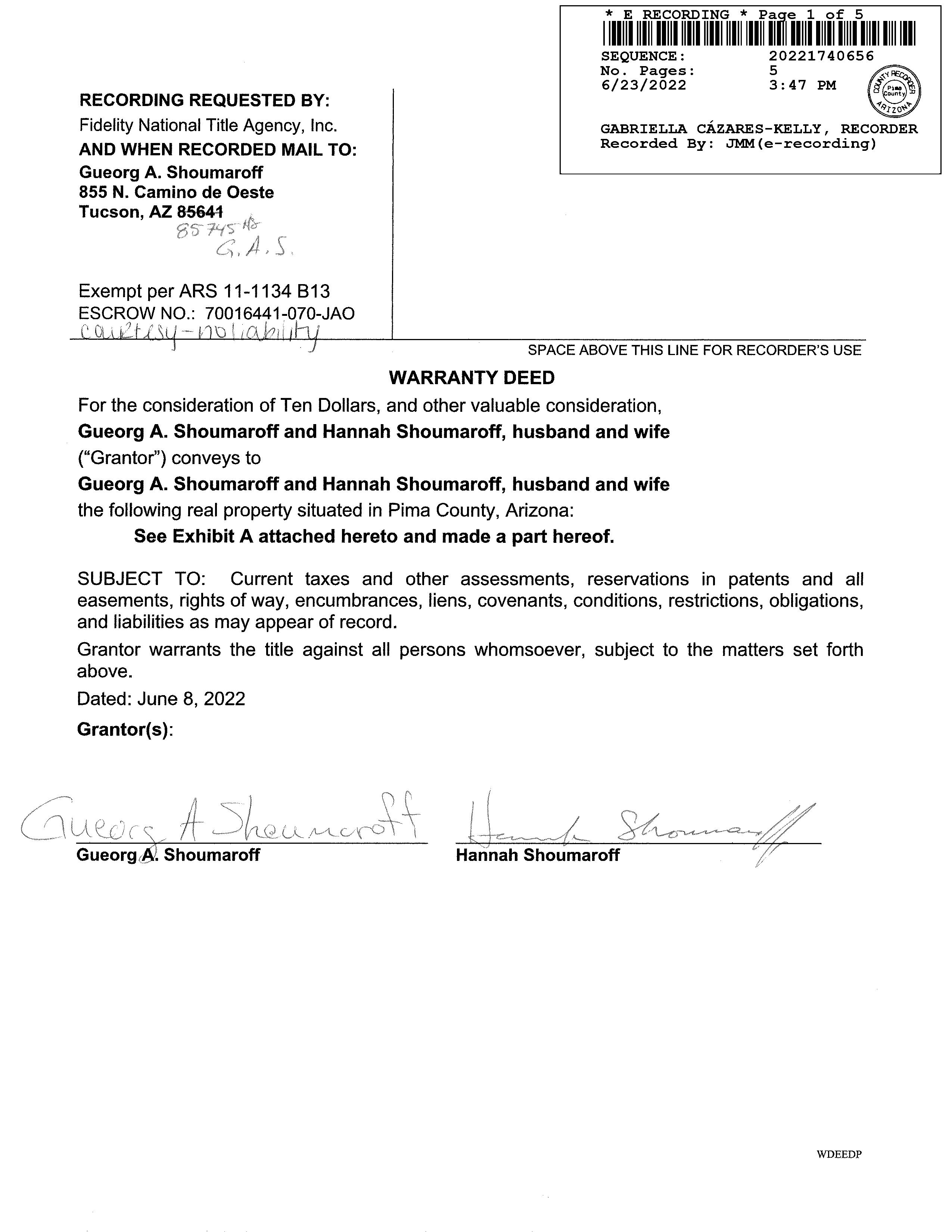 Information Owner Name : Shoumaroff Gueorg A / Shoumaroff Hannah Mailing Address : 855 N Camino De Oeste, Tucson AZ 85745 R064 Vesting Codes : / / Community Property Location Information Legal Description : Sely Ptn W630.16' E660.16' Nely 776.46' Ne4 Ne4 4.63 Ac Sec 12-14-14 County : Pima, Az Township-Range- Sect : 14-12E-12 Census Tract / Block : 44.22 / 5 APN : 212-11-014P Owner Transfer Information Recording/Sale Date : Year / Property Information Land Use : Residential Acreage Lot Size : 201,683 State Use : Vac-res-urban Non Subd Lot Acres : 4.63 Tax Information Assessed Year : 2023 Customer Name : Jeremiah Stiffler Customer Company Name : First American Prepared On : 04/23/2024 © 2024 CoreLogic. All rights reserved