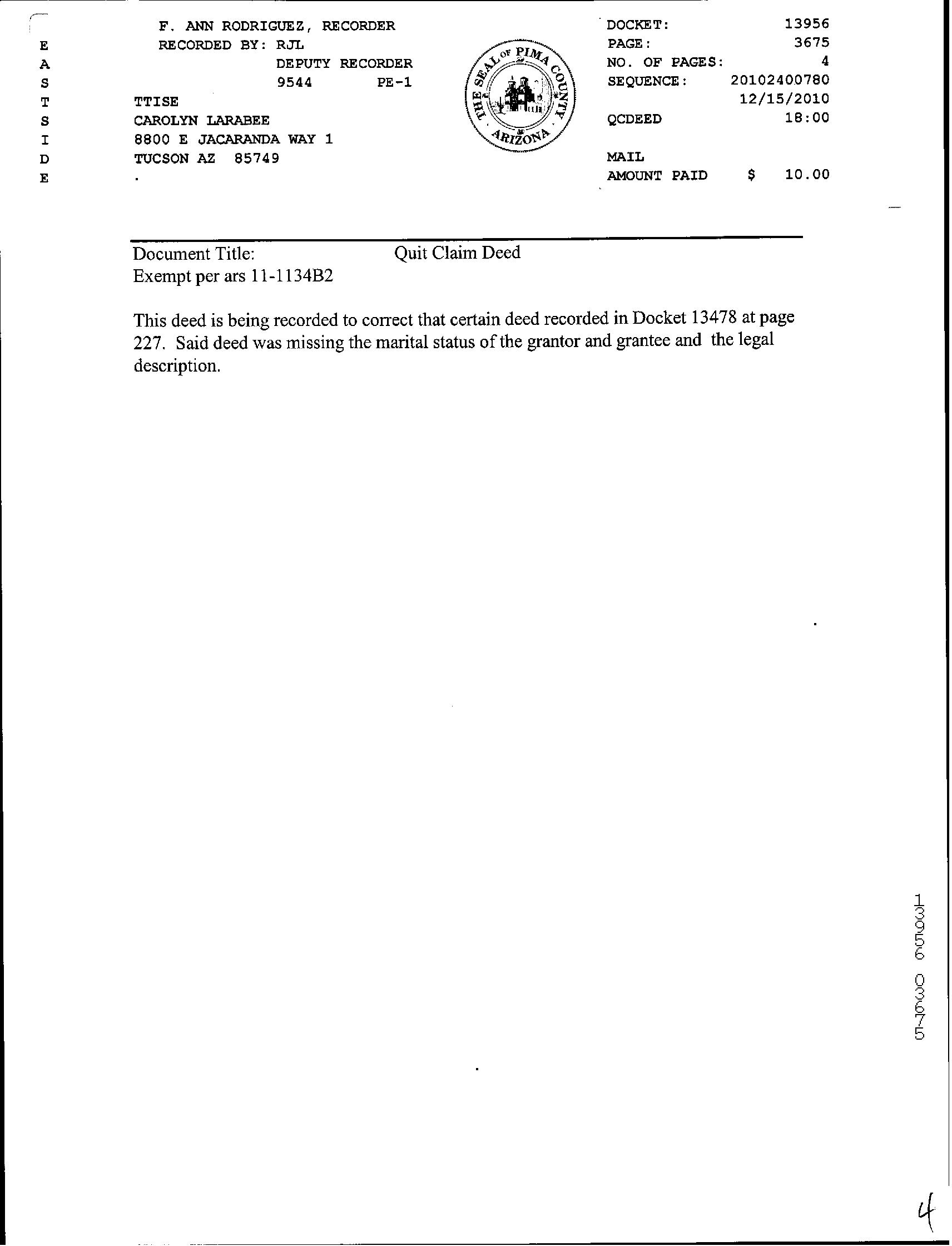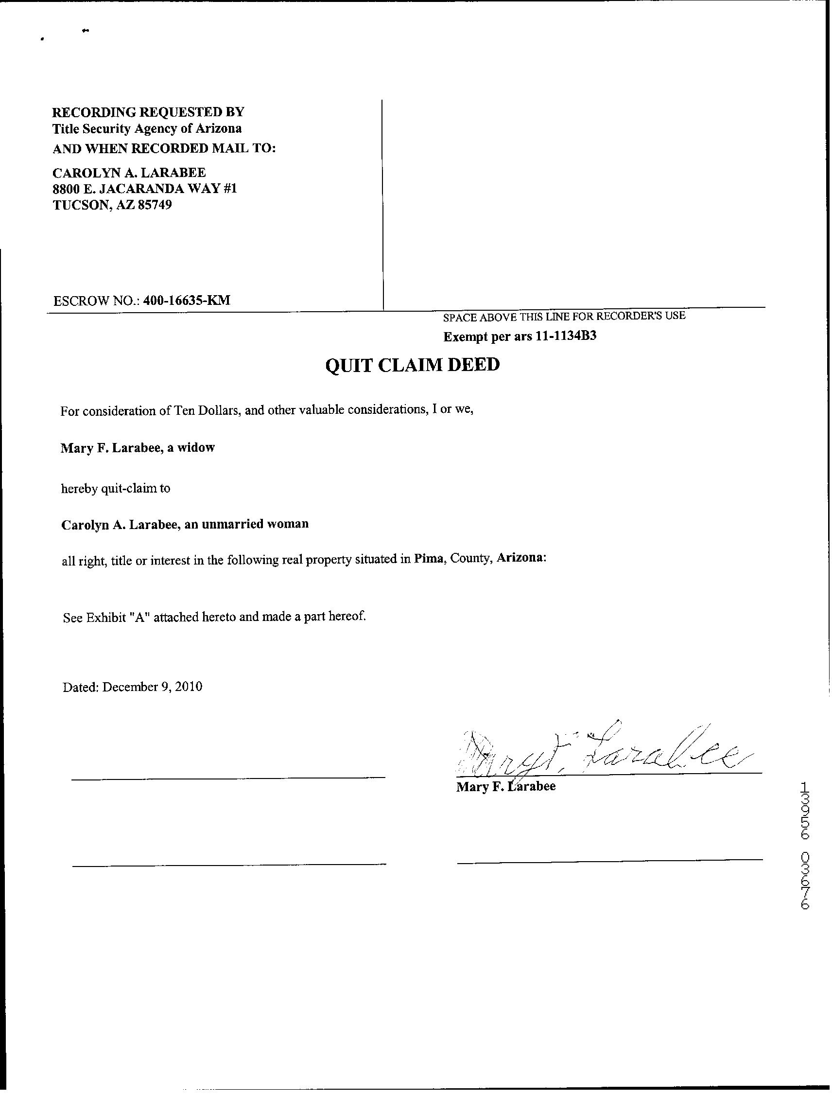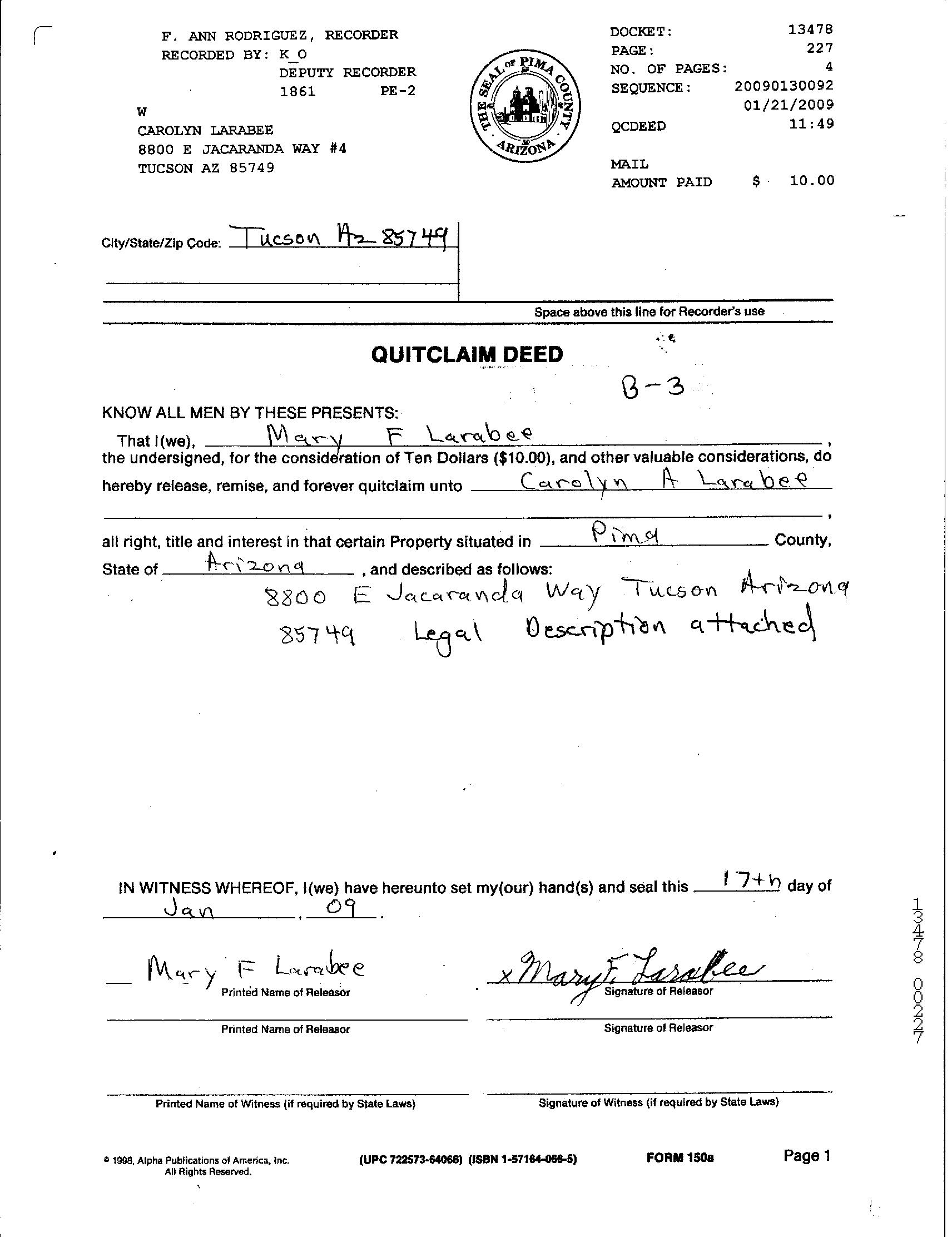 OWNER: LARABEE CAROLYN A 13478 227 01/21/2009 SITUS: 8800 E JACARANDA WY TUC MAIL: 8800 E JACARANDA WAY TUCSON, AZ 85749
