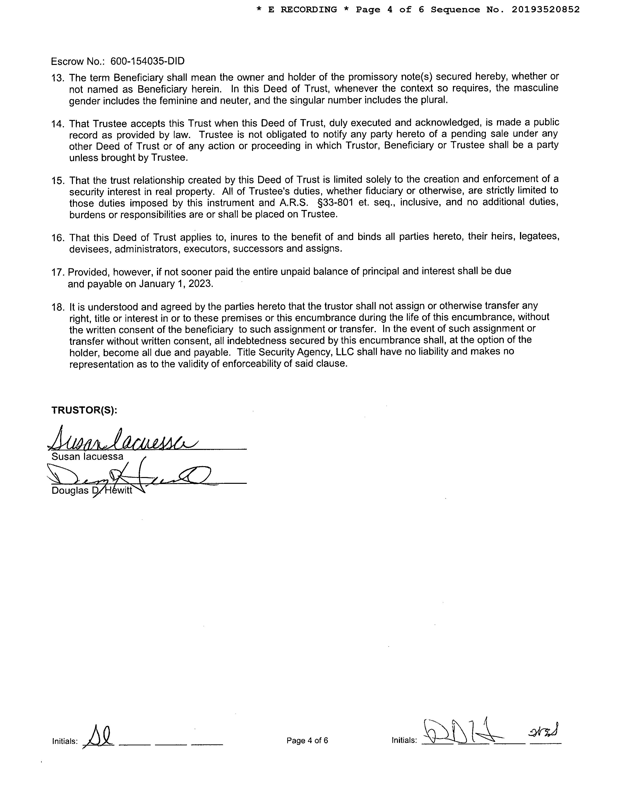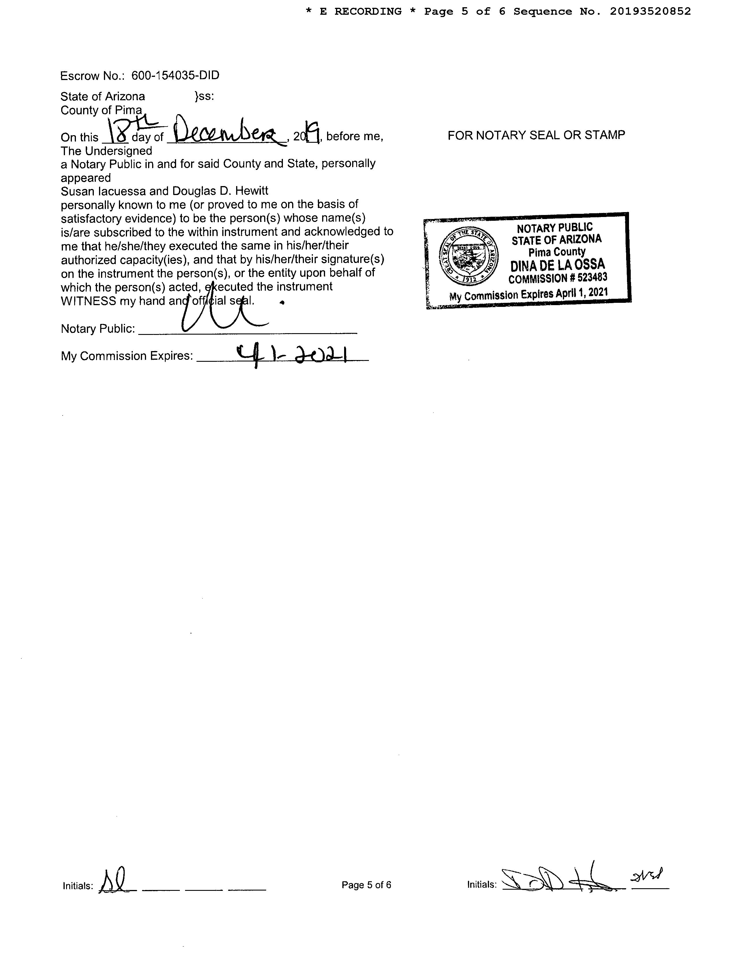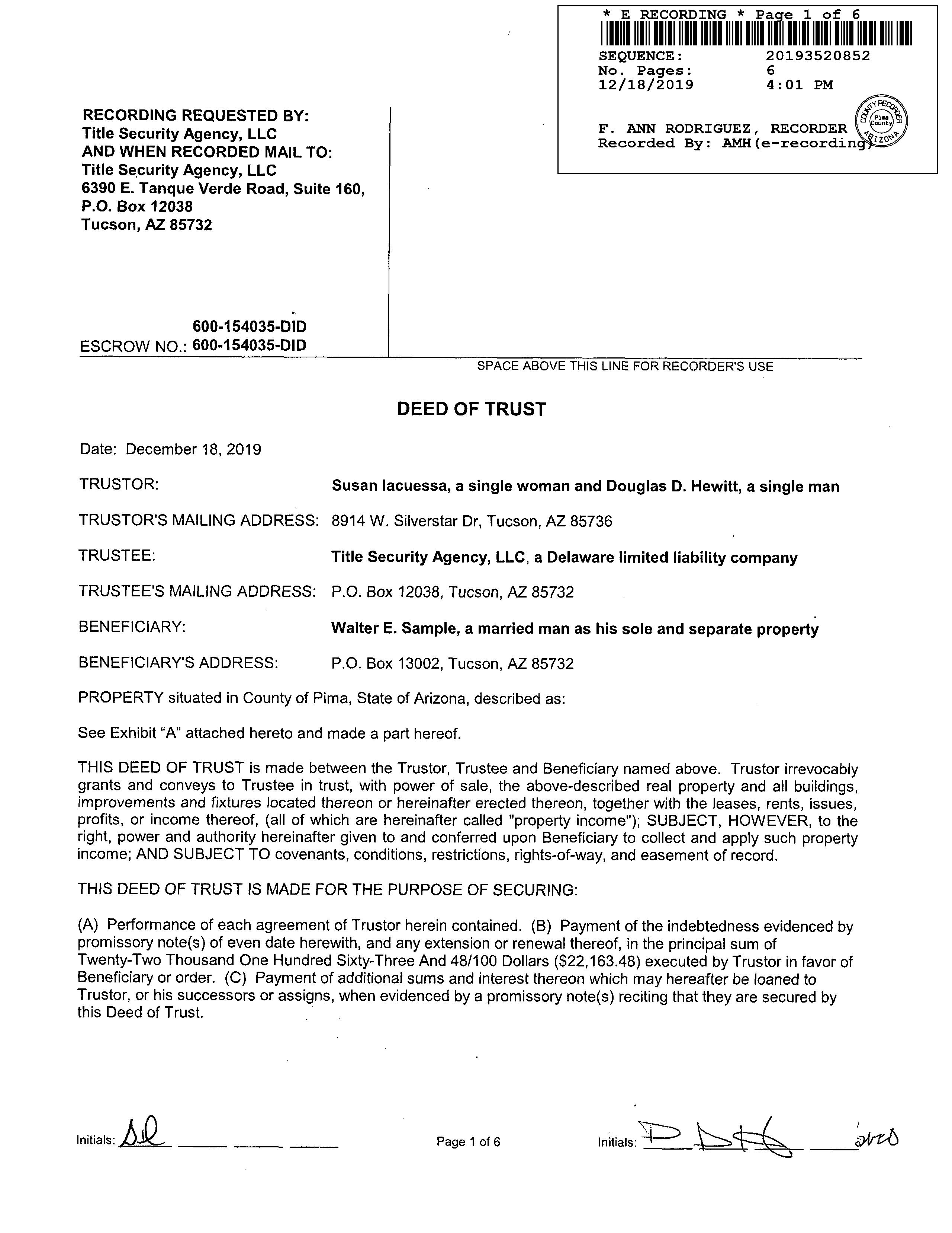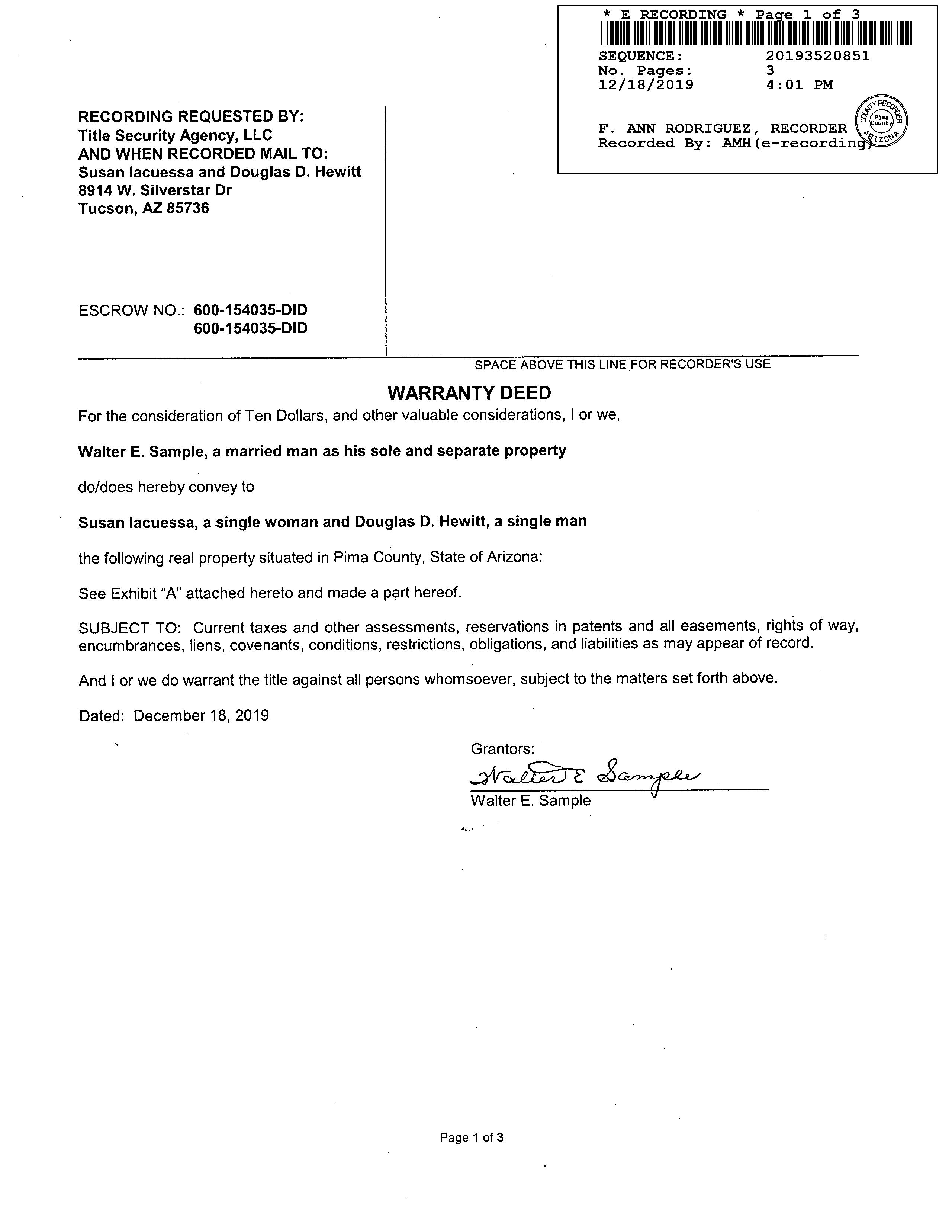 OWNER: LACUESSA SUSAN & HAWITT DOU AFFIDAVIT 2019 3520851 12/18/2019 SITUS: 8914 S SILVER STAR DR PC MAIL: 8914 S SILVER STAR DR TUCSON AZ 85735 LEGAL: N206.75' W328.1' M/L E1402' M/L OF NE4 1.56 AC SEC 34-15-10