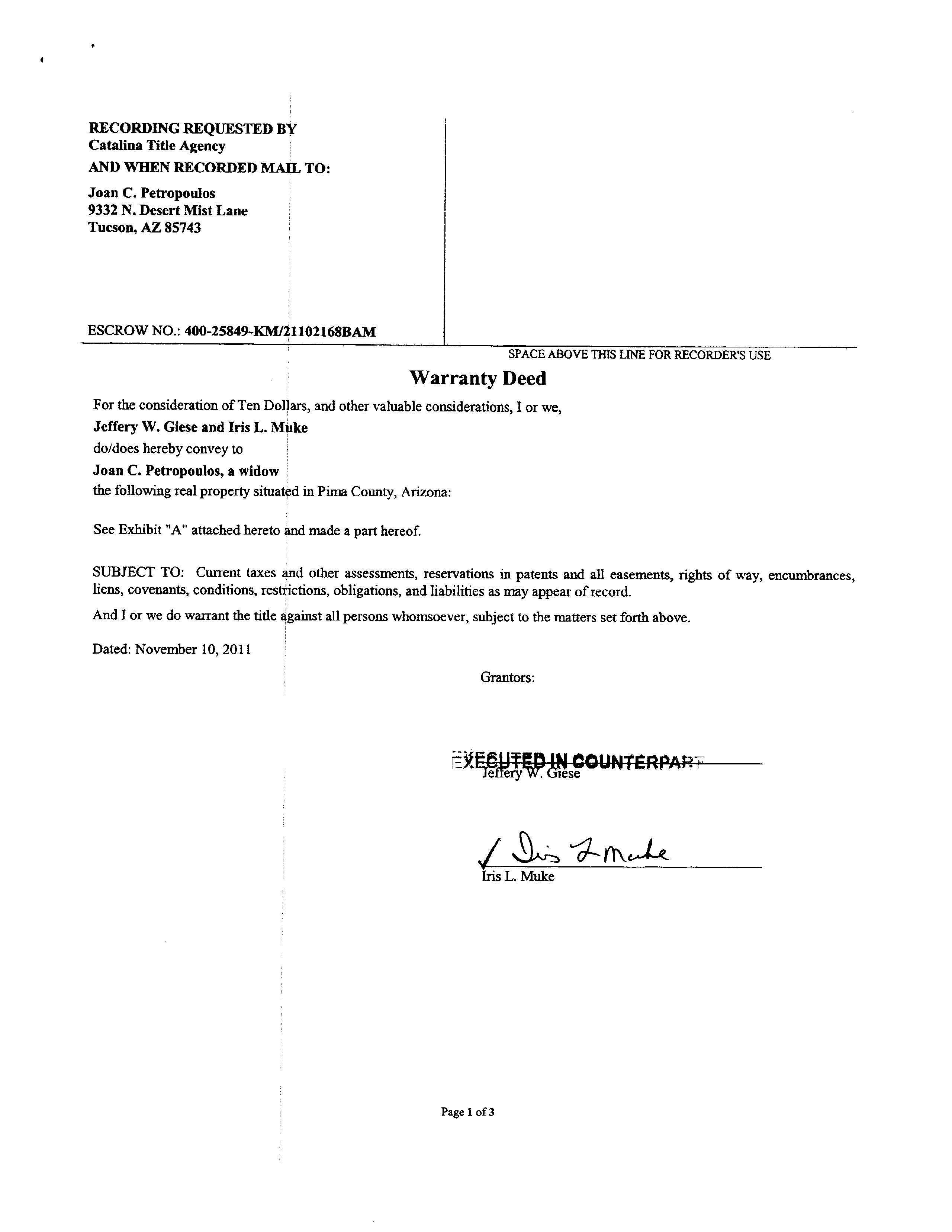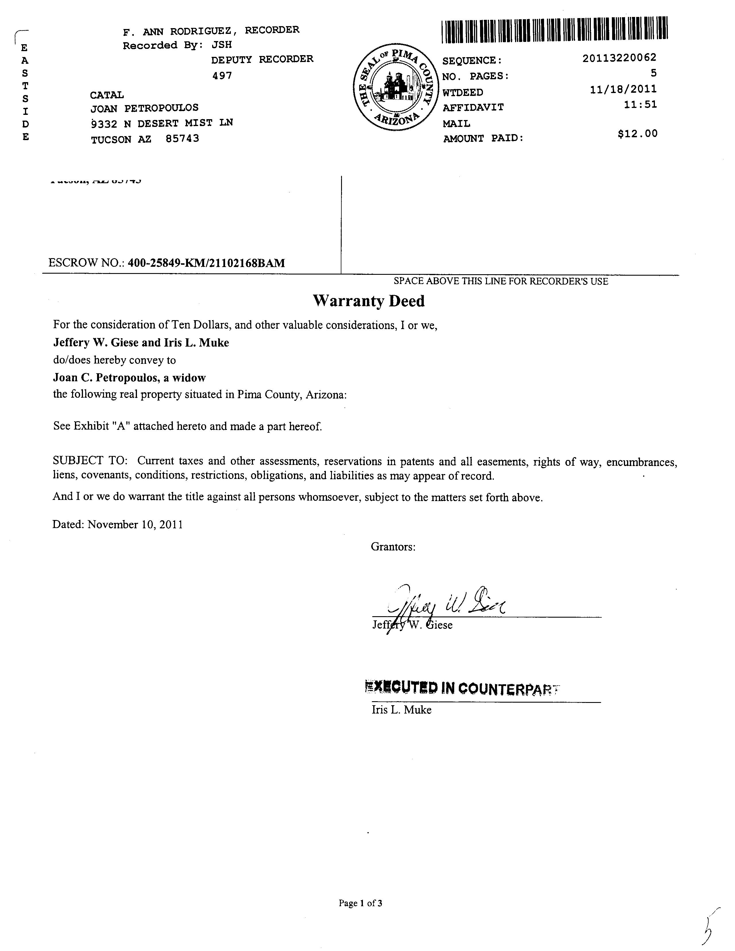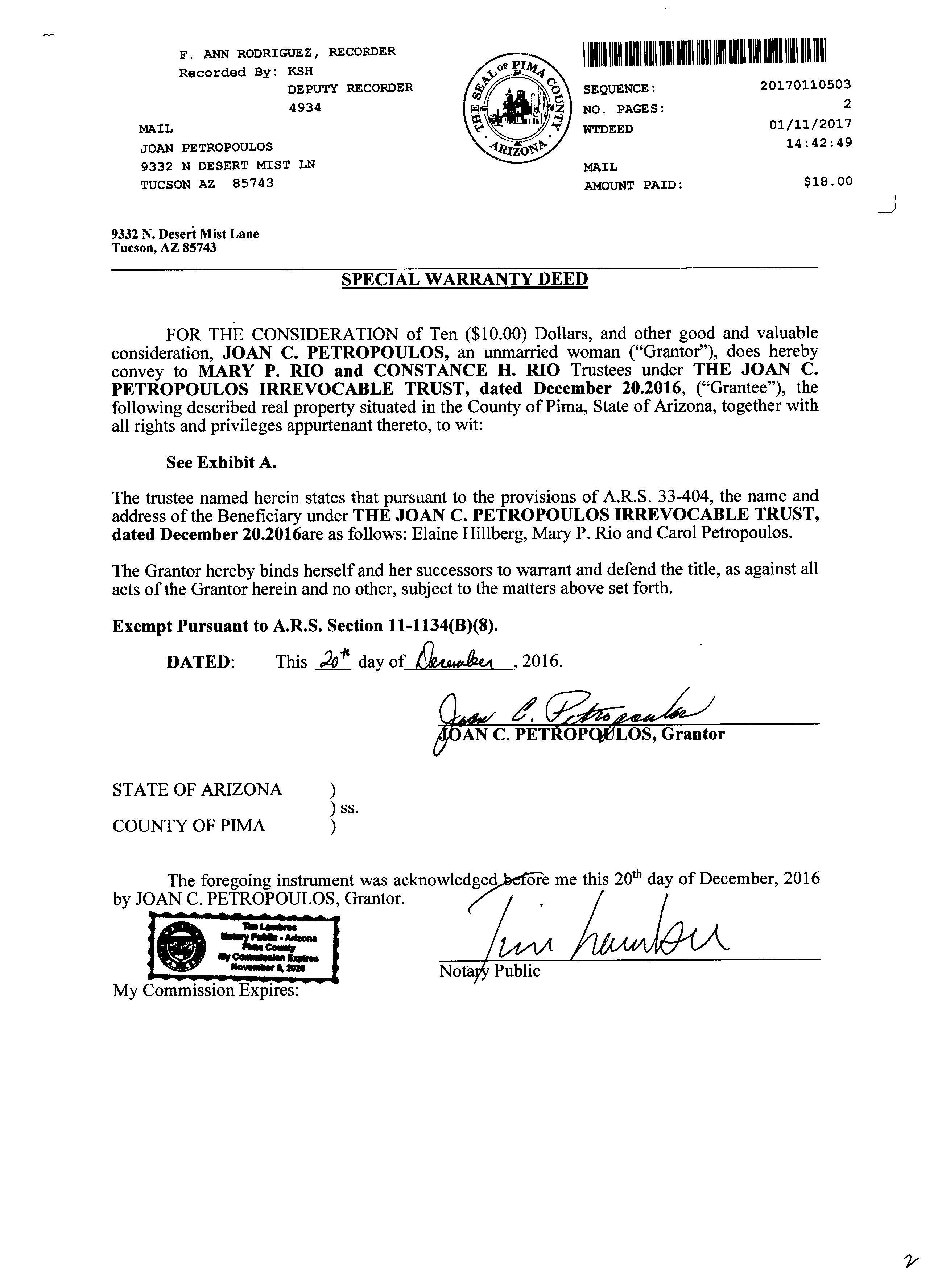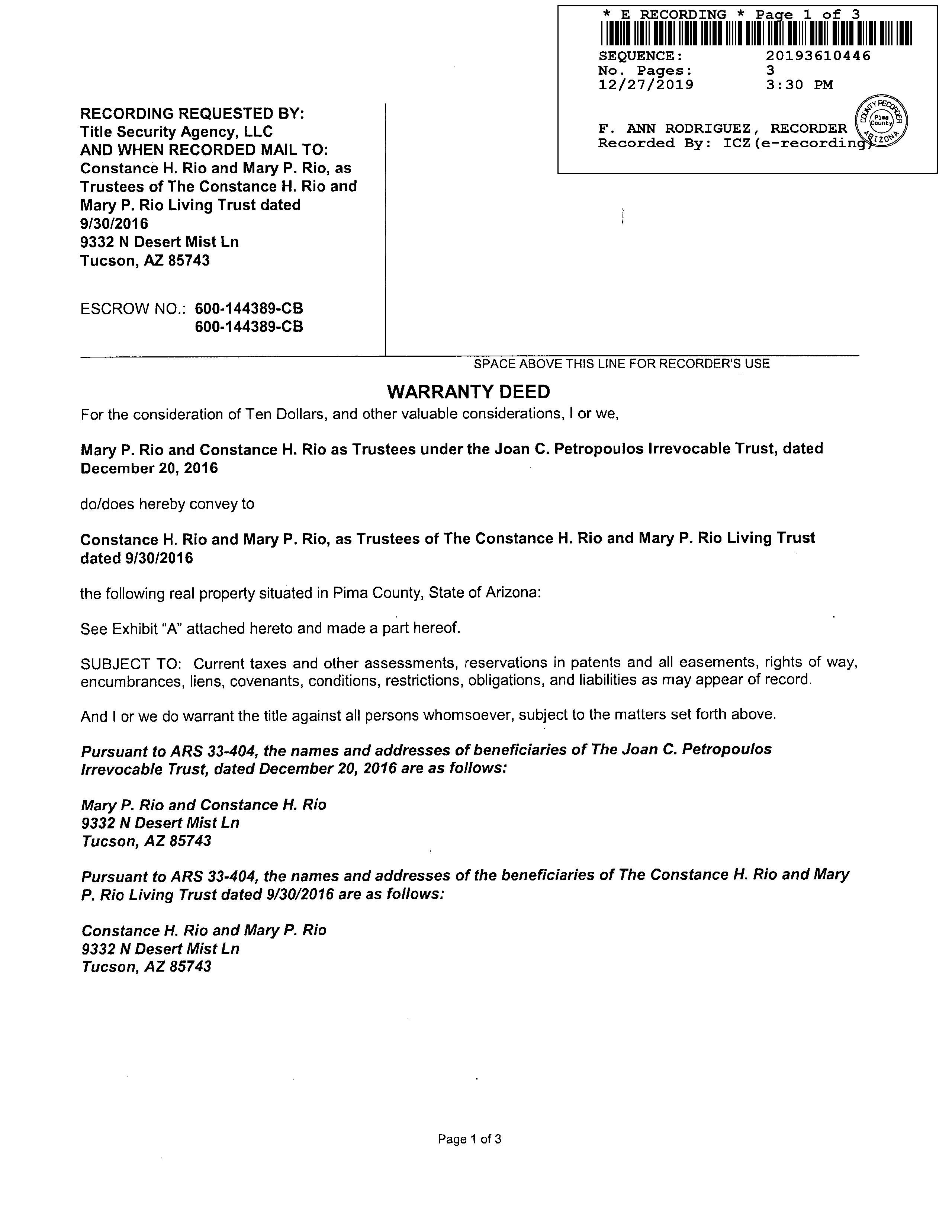 #20 9275 N Whispering Shadows Way Tucson Az 85743 Owner Name: Varon George M / APN / Alternate APN: 226-10-2000 / Deed Type: Warranty Deed Land Use: Sfr Subdivision / Tract: Continental Ranch Sunflower 03 / Lot Size: 4,725 Year Built / Eff: 2001 / Rec. Date / Price: 05/05/2022 / $327,000 Living Area: 1,156 # of units: Document #: 1250575 Bedrooms: Pool: Total Tax Value: $159,674 Bath(F/H): / Customer Name : Lisa Mrazek Customer Company Name : First American Title Insurance Company Prepared On : 09/01/2022 © 2022 CoreLogic. All rights reserved