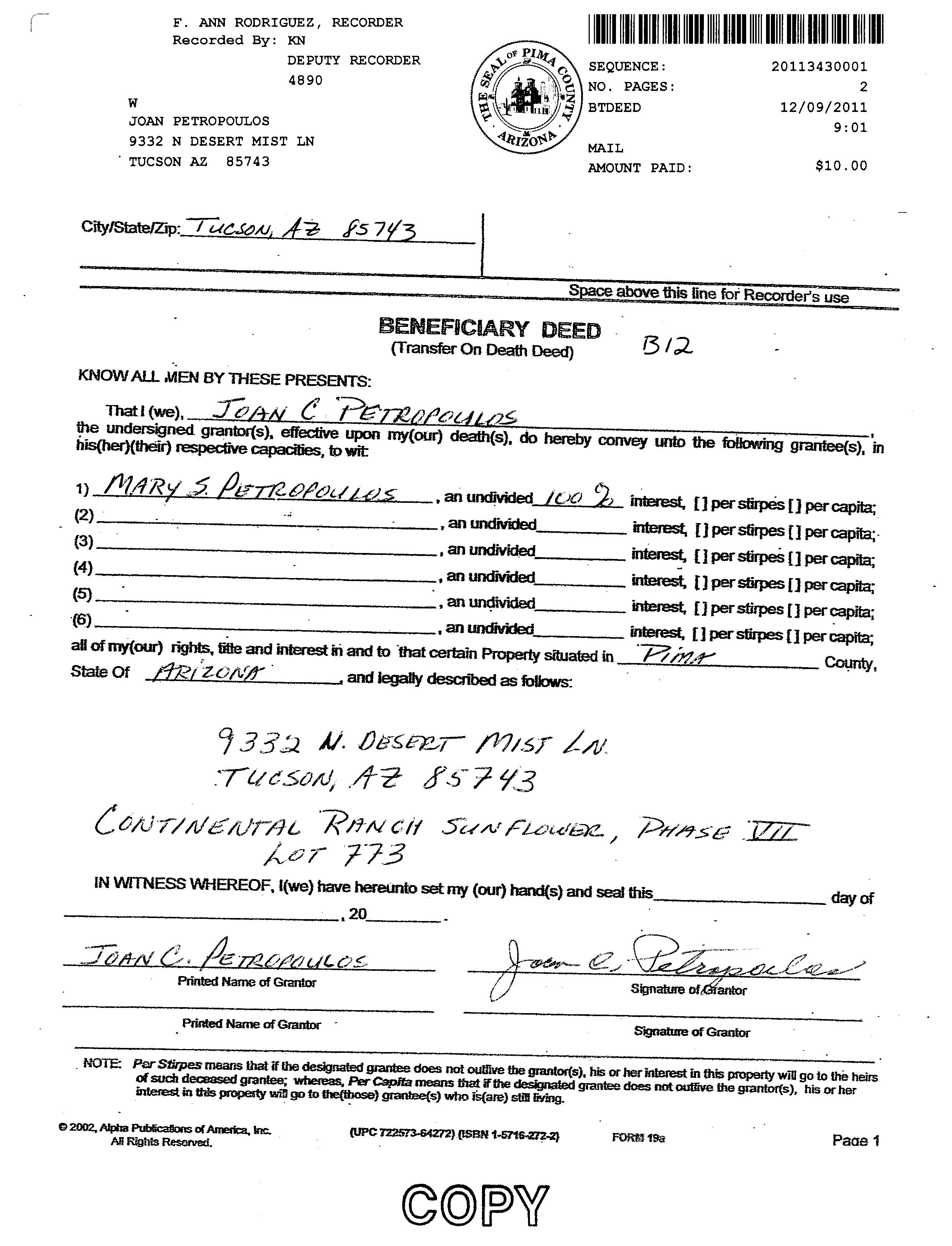 Owner Name: Galambos Robert S /Galambos Linda J APN / Alternate APN: 226-10-2270 / Deed Type: Warranty Deed Land Use: Sfr Subdivision / Tract: Continental Ranch Sunflower 03 / Lot Size: 4,726 Year Built / Eff: 2000 / Rec. Date / Price: 07/12/2022 / $330,000 Living Area: 1,156 # of units: Document #: 1930280 Bedrooms: Pool: Total Tax Value: $159,020 Bath(F/H): / #19 9315 N Whispering Shadows Way Tucson Az 85743