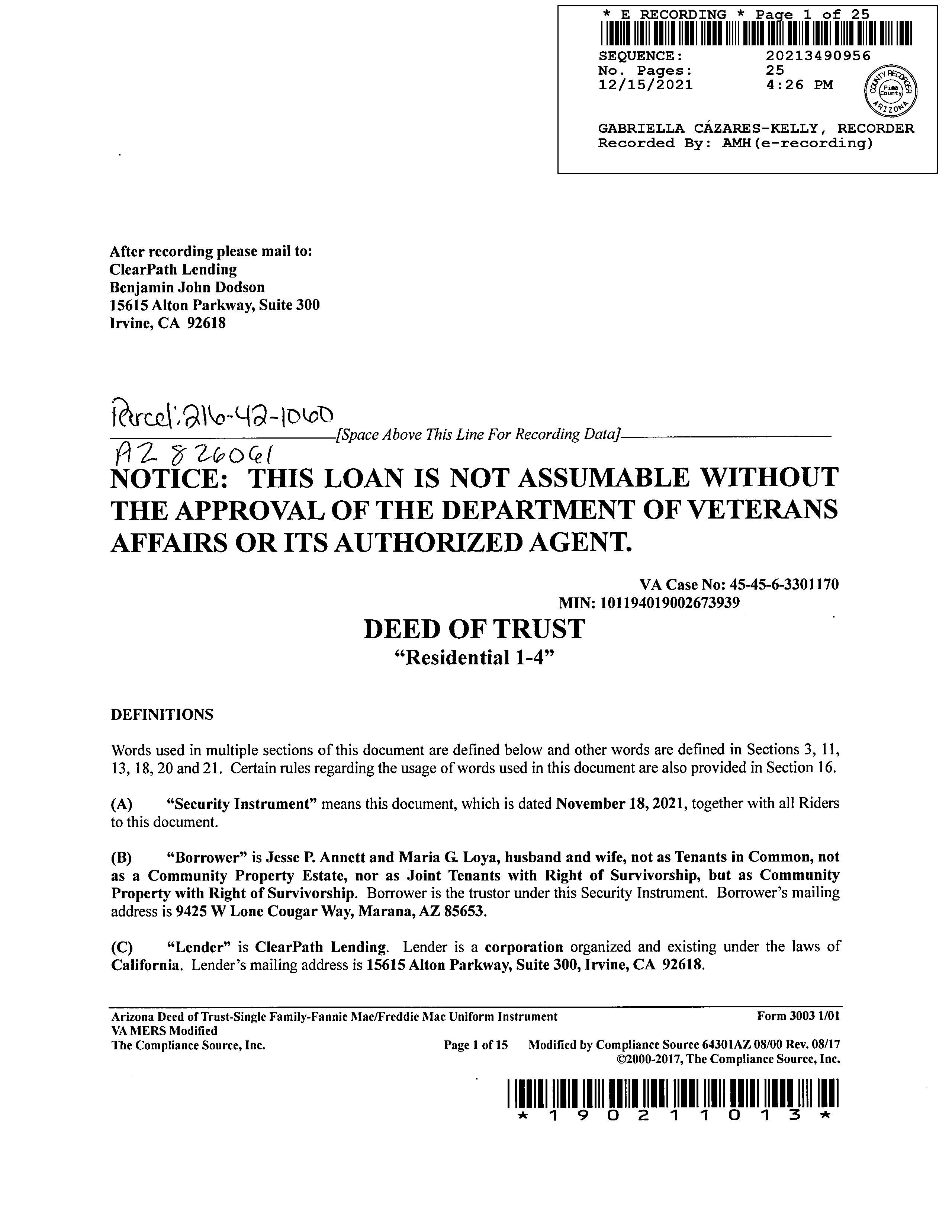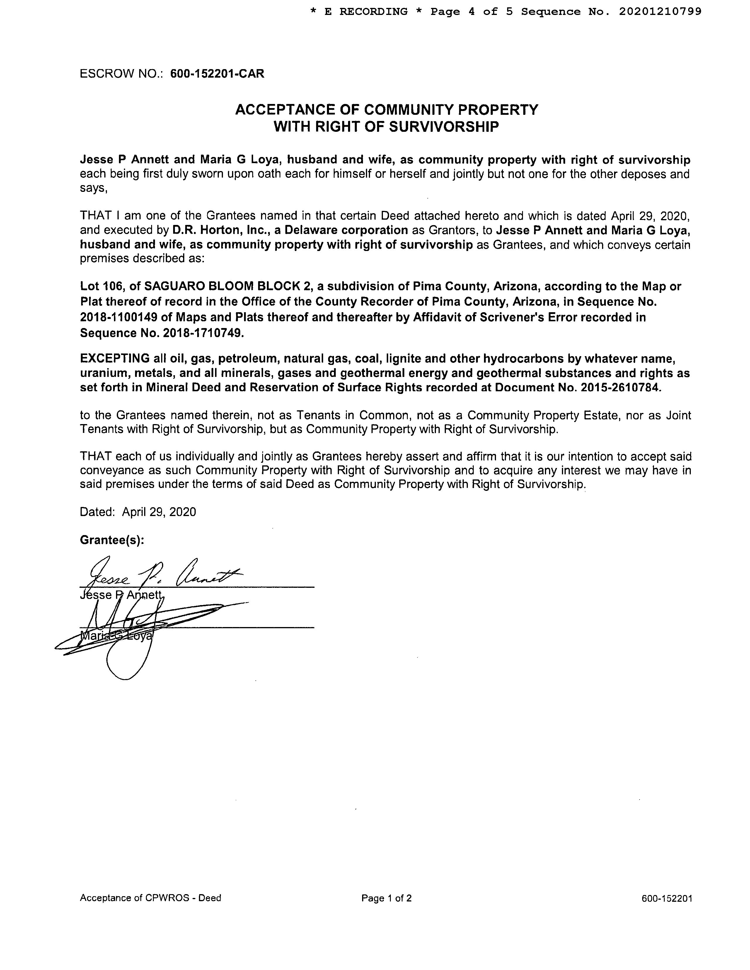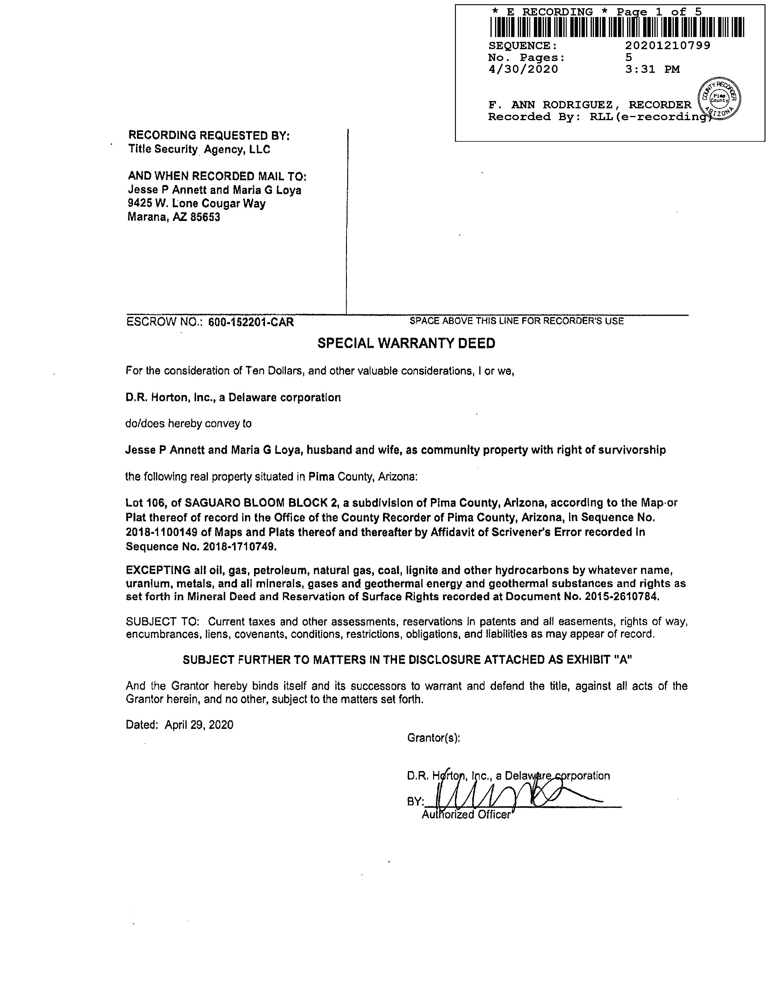 Owner Name: Annett Jesse P /Loya Maria G APN / Alternate APN: 216-42-1060 / Deed Type: Special Warranty Deed Land Use: Sfr Subdivision / Tract: Saguaro Bloom / Lot Size: 7,841 Year Built / Eff: 2020 / Rec. Date / Price: 04/30/2020 / $351,523 Living Area: 2,577 # of units:
