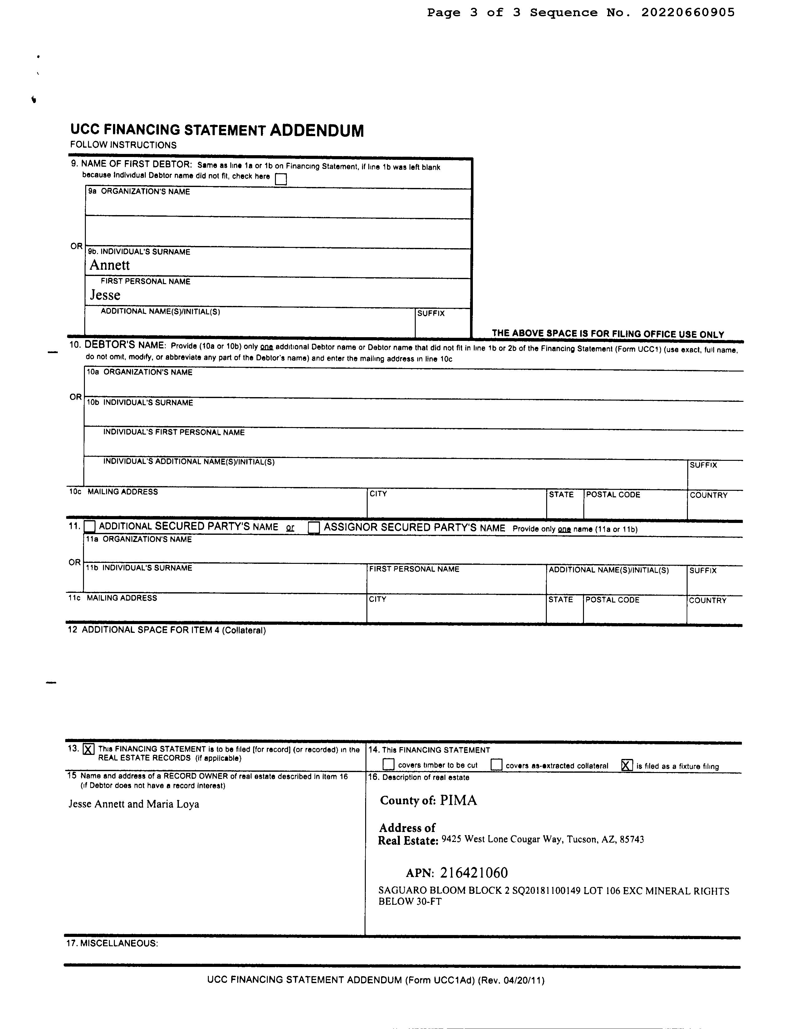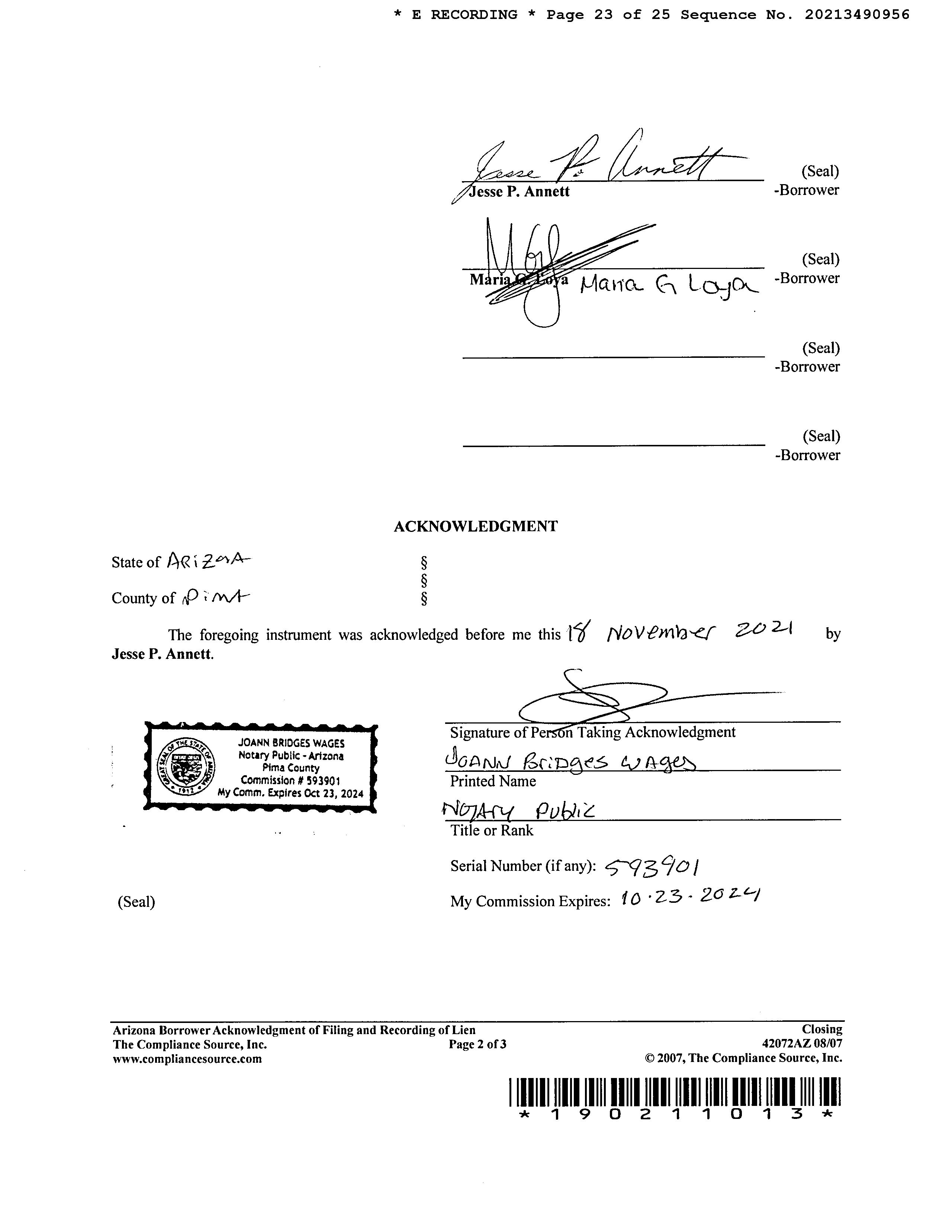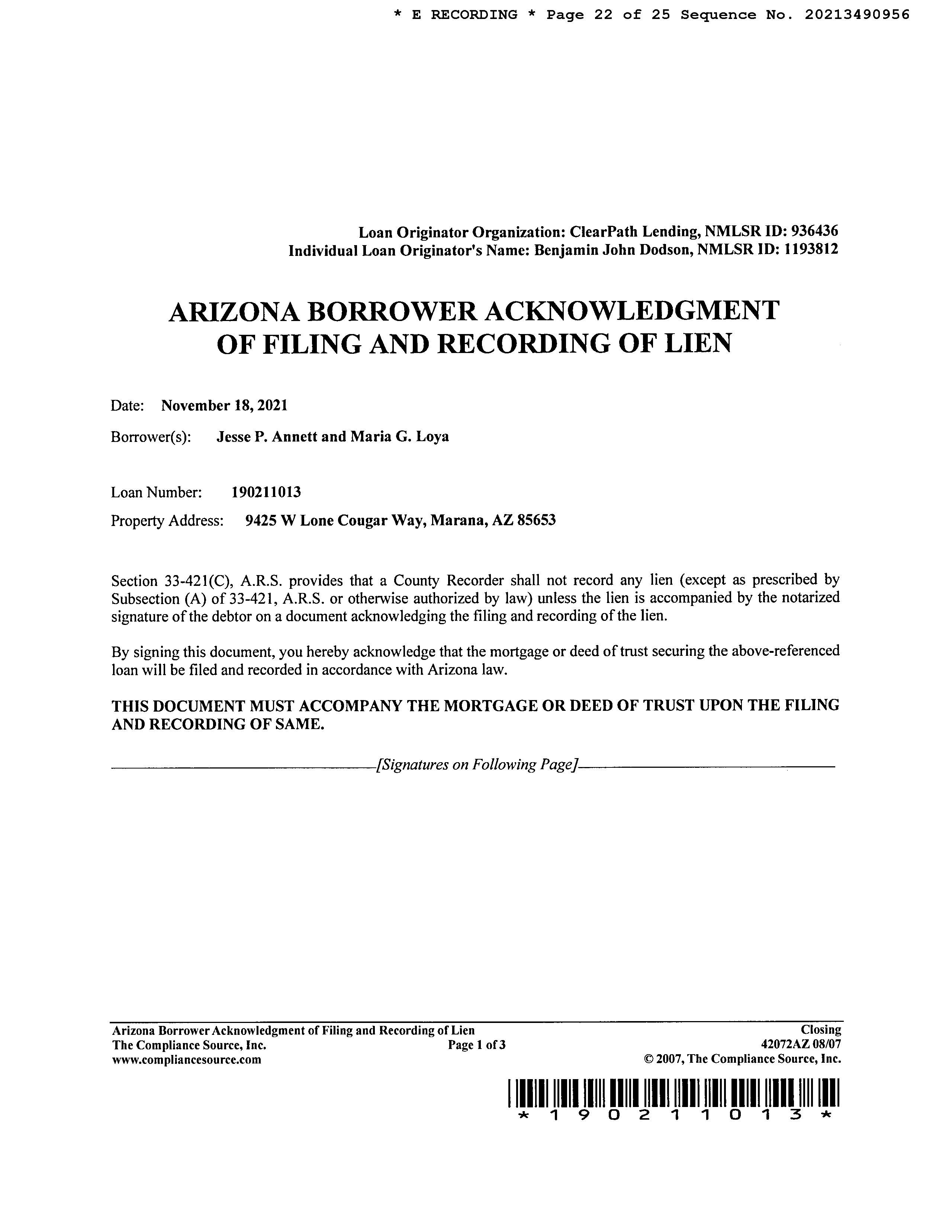 Owner Name: Annett Jesse P /Loya Maria G APN / Alternate APN: 216-42-1060 / Deed Type: Special Warranty Deed Land Use: Sfr Subdivision / Tract: Saguaro Bloom / Lot Size: 7,841 Year Built / Eff: 2020 / Rec. Date / Price: 04/30/2020 / $351,523 Living Area: 2,577 # of units: