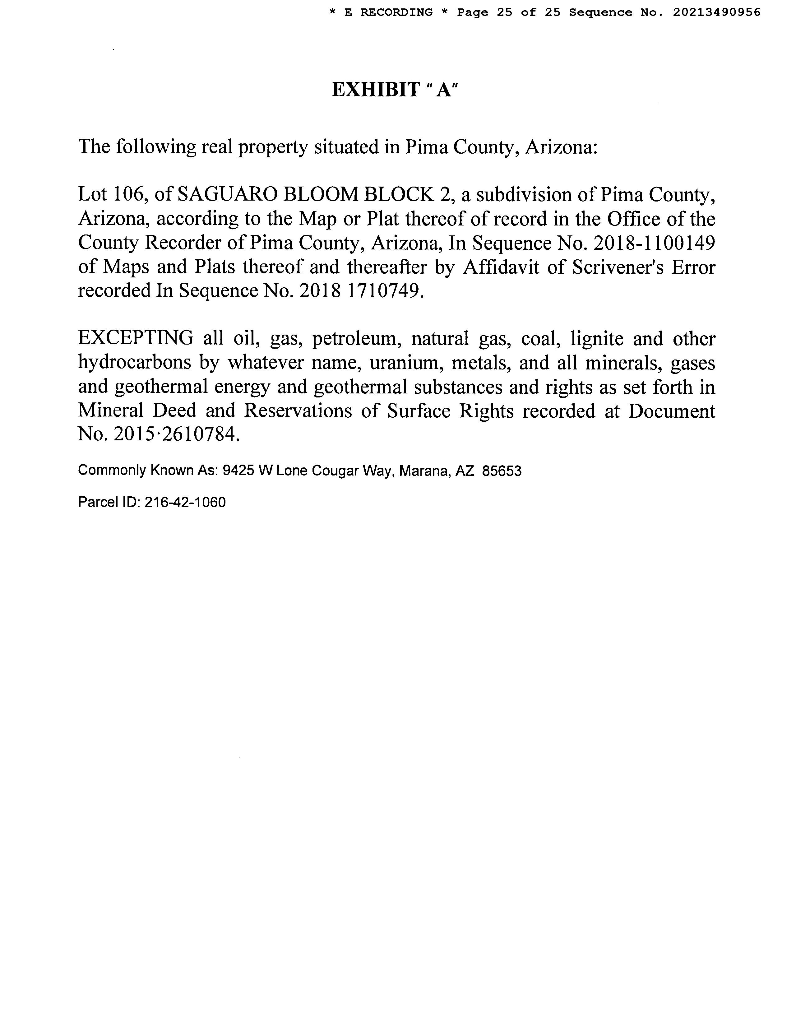 Legal Description : Saguaro Bloom Block 2 Sq20181100149 Lot 106 Exc Mineral Rights Below 30-ft County : Pima, Az Legal Block : 2
