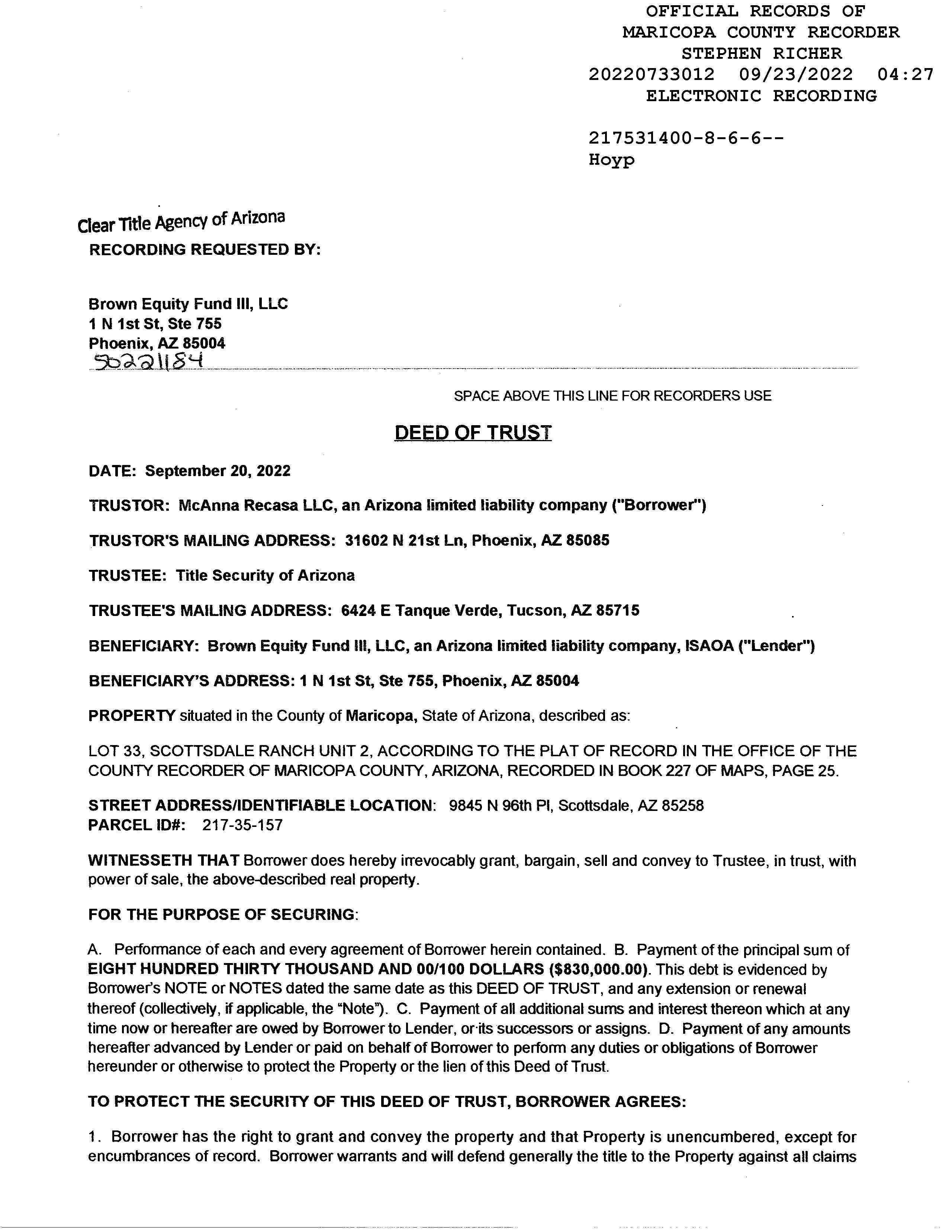 Owner Name: Mcanna Recasa Llc / APN / Alternate APN: 217-35-157 / Deed Type: Warranty Deed Land Use: Sfr Subdivision / Tract: Scottsdale Ranch Unit 2 / Lot Size: 11,206 Year Built / Eff: 1985 /
