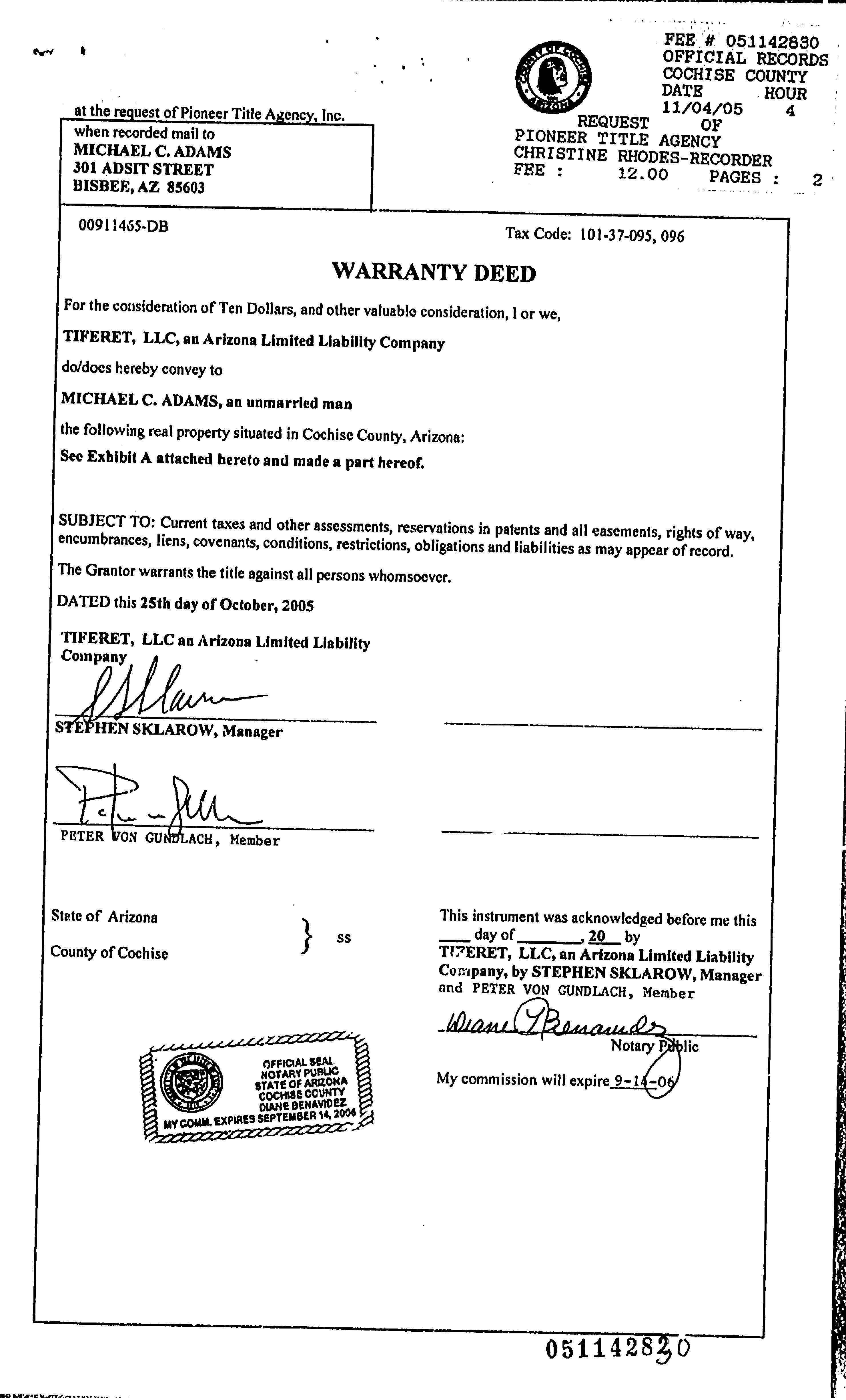 COCHISE, AZ Document:DED WAR 2005.42830 Page:1 of 2 Printed on:2/15/2023 3:55 PM Branch :FC0 User :JSTI