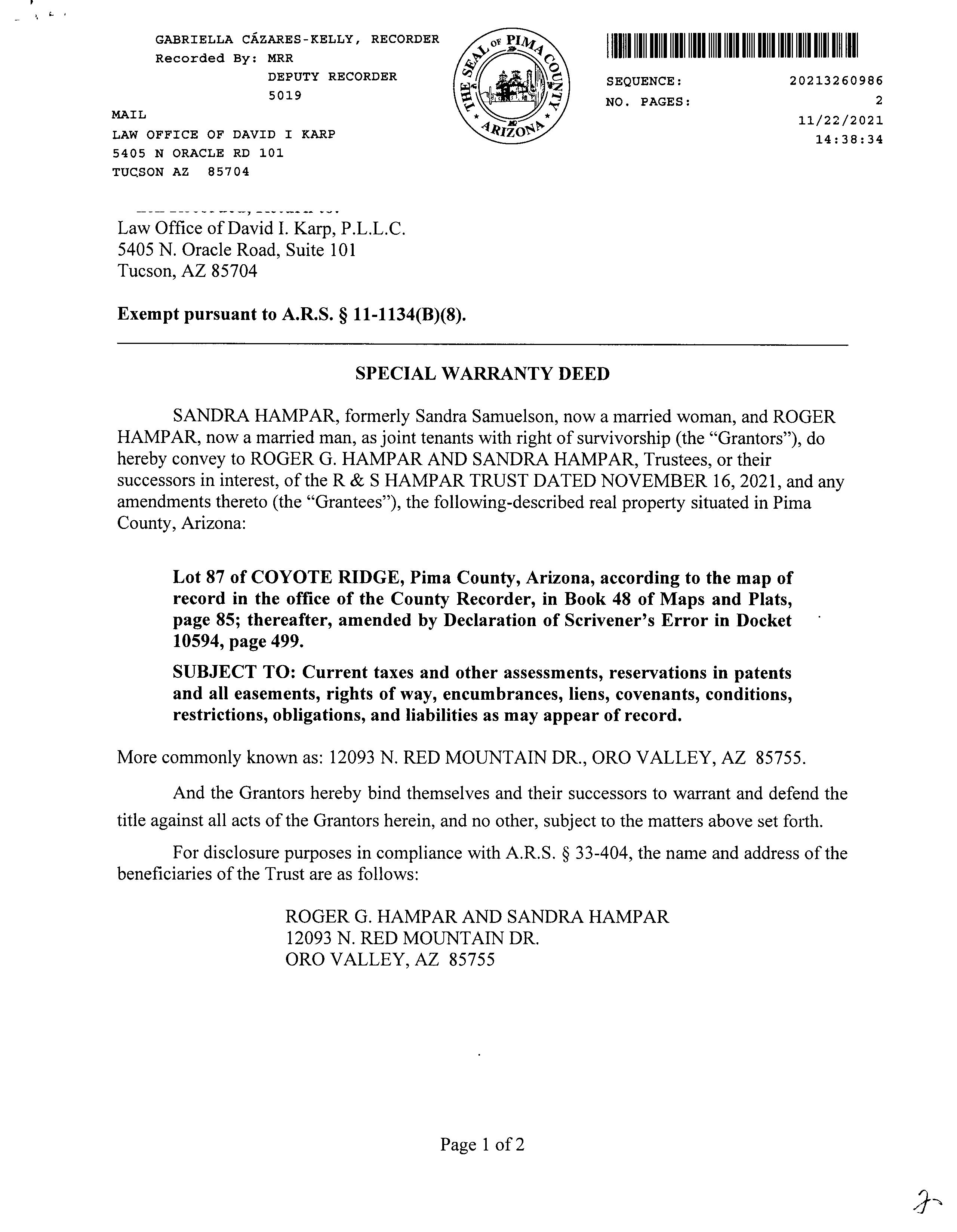 Mailing Address : 12093 N Red Mountain Dr, Oro Valley AZ 85755-6552 R138