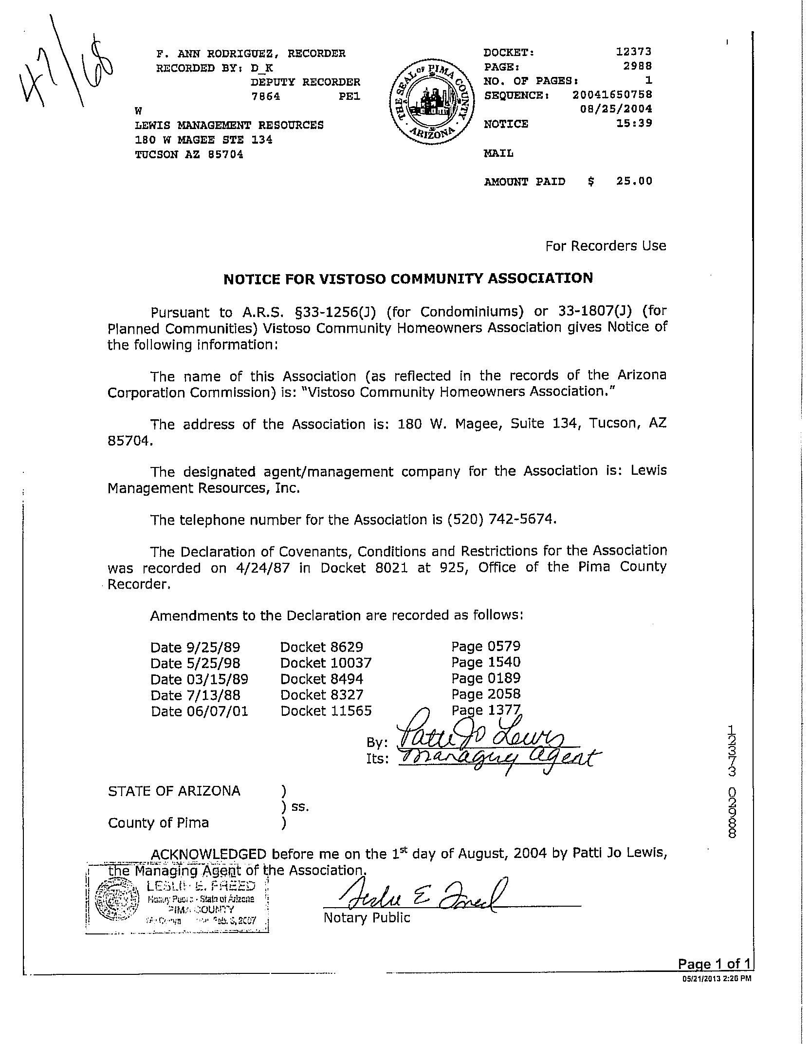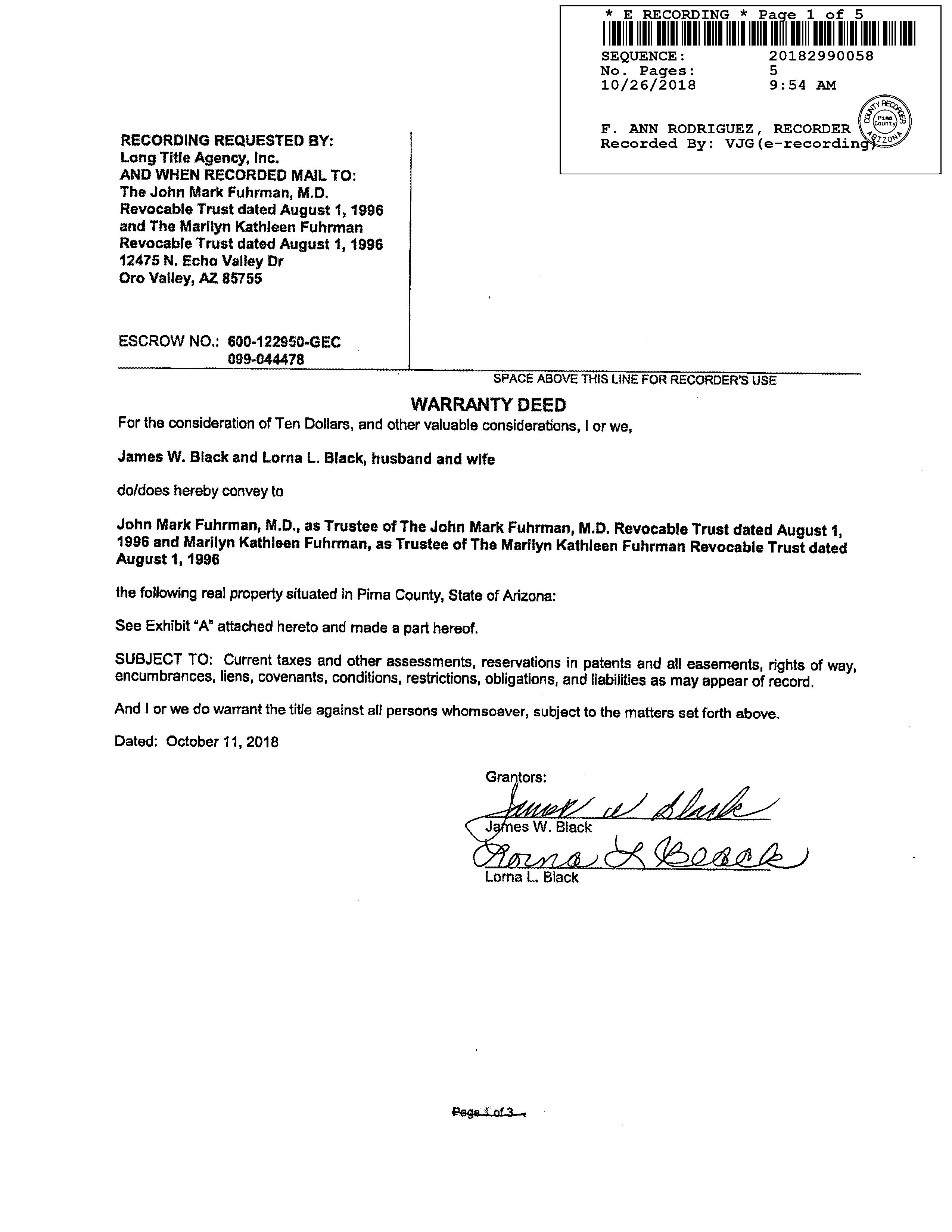 Subject Property: 12475 N Echo Valley Dr Oro Valley Az 85755 Owner Name: Fuhrman John Mark & /Marilyn Kathleen