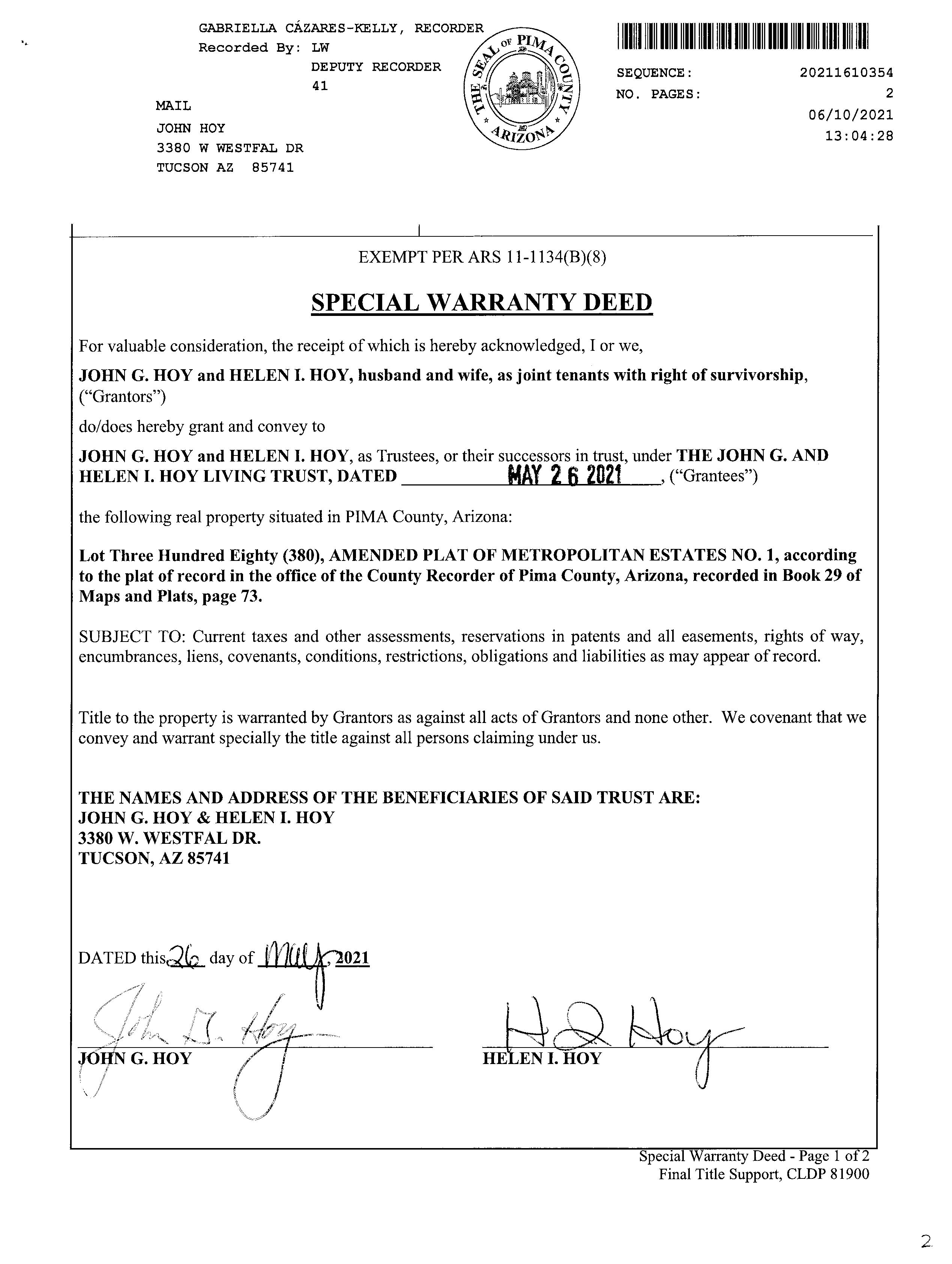 Owner Name: Hoy John G /Hoy Helen I