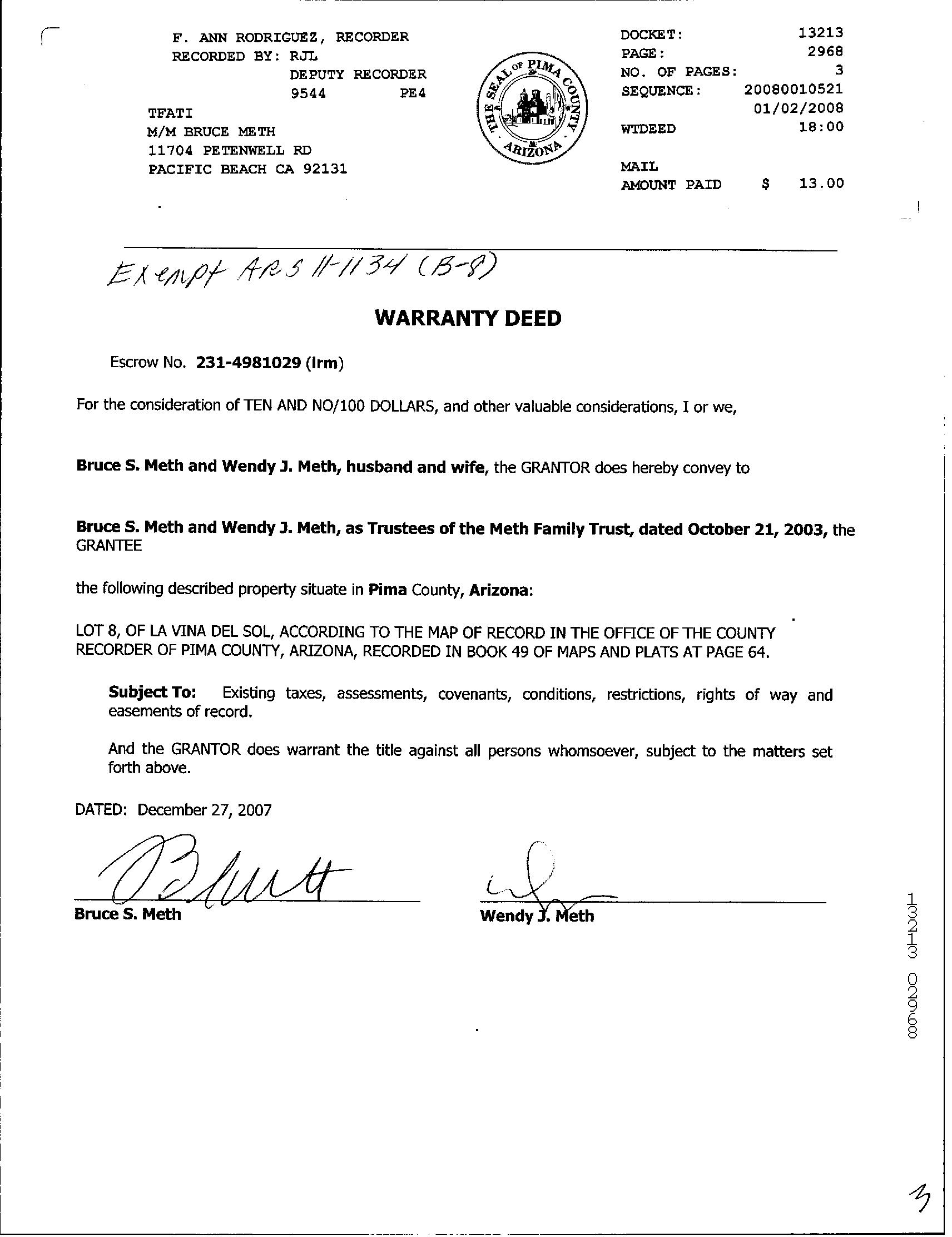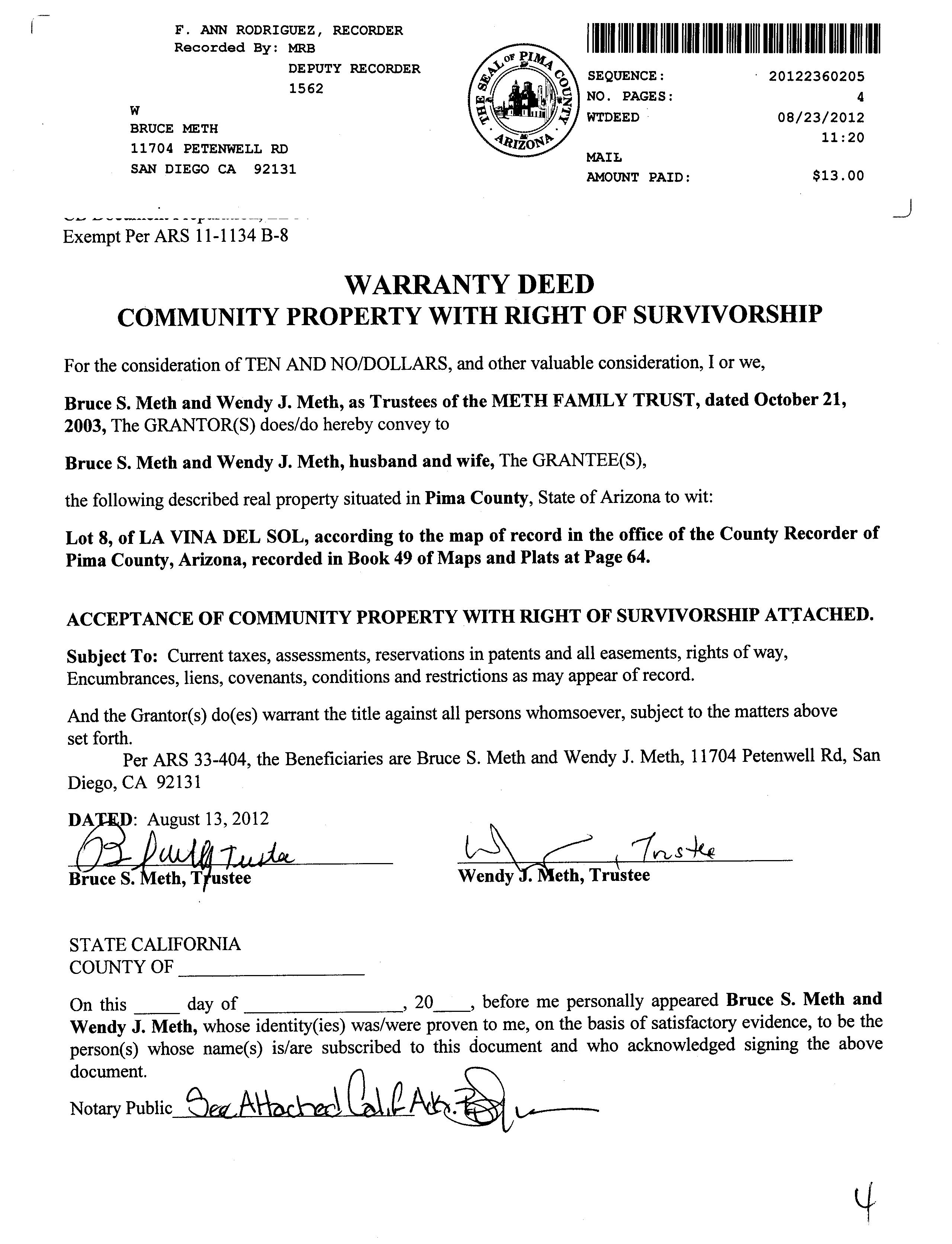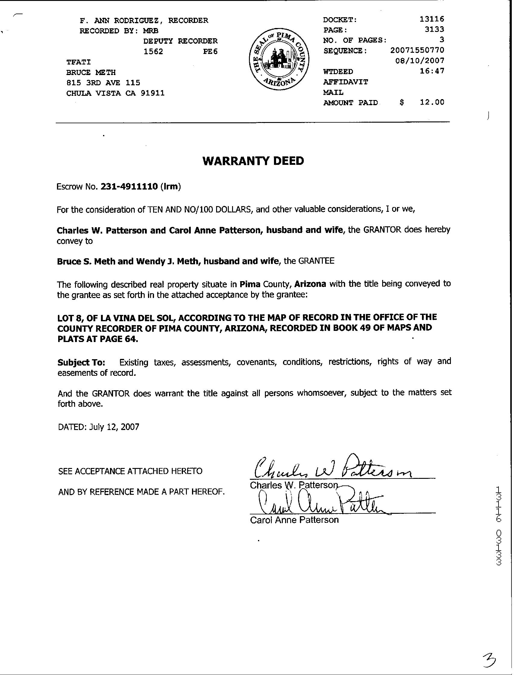 | Fax 520.495.6151 7479 E. Tanque Verde Tucson, AZ 85715 TUCSON INT'L AIRPORT Air Force WSilverbellRd SSantaRitaRd N M t L emmon Hwy ESascoRd W Avra Valley Rd E G and Va ey Dr NAguirre R d N L u c k e t R d N W e n t z R d N Wa terman Mounta i n R d N Anway Rd W El Tiro Rd N Trico Rd W Tucke Rd W Rudasi Rd W Manv l e Rd SSanJoaquinRd WBopp Rd W Snyder H Rd S M a r s t e a r R d W Park Rd W Hermans Rd W He mans Rd W Guy St W Bush Rd S G a r v e y R d N C a l e R i n c o n a d o S W i m o t R d S Shaw Rd S Sierrita Mountain Rd S K o b R d W Tw nButtes Rd W Mcgee Ranch Rd S E s t a n c a N Bea r C a n y o n R d W E Cam no De Cerro E Fairmount St S Swan Rd NFrontageRd W Emigh Rd W Fort Lowe Rd N P u m p S t a t ion dR Cont nental Ave N Trico Rd SOwlHeadGasLineRd N T r i c o R d W Bayard Rd S S a n d a r o R d N Dove Mountain Blvd SHelvetiaRd WAnamax Mine Rd W G a r c i a R a n hc R d Road424 WRagged Top Rd W Ruby S a Dr WBritten RanchRd W Pima Mine Rd ellRdS S Mcgee Ranch R d E Edw n Rd 8 0 NKINNEYRD N S A N D A R I O R D N ANWAY RD W VALENCIA RD W MOORE RD W INA RD N 1 S T A V E E SUNRISE DR E SNYDER RD NSILVERBELLRD N S O L D I E R T R L E RIVER RD E PRINCE RD E SPEEDWAY BLVD S FREEMAN RD E 22ND ST E 22ND ST W IRVINGTON RD S N O G A L E S H W Y W VALENCIA RD SMISSIONRD W SPEEDWAY BLVD S O L D S P A N I S H T RL W NARANJA DR W TWIN PEAKS RD W PICTURE ROCKS RD W MANVILLE RD SKINNEYRD W MILE WIDE RD E SAHUARITA RD N TRICO RD S S A N D A R I O R D S OLD N O G ALES HW Y S H O U G H T O N R D S L A C A N A D A DR W HELMET PEAK RD WAJOHWY N S W A N R D S KOLB RD S HOUGHTON RD W TANGERINE RD E GRANT RD S H O U G H T O N R D 9 5 WAJOHWY E VALENCIA RD NORACLE R D I10 I-19 77 77 86 86 286 19 10 10 Corona de Tucson Casas Adobes Catalina Green Valley Picture Rocks Three Points Vail Summit Tanque Verde Tucson Sahuarita Saddlebrooke Marana Oro Valley Rillito Summerhaven Willow Canyon Oracle Junction Cortaro Continental Littletown 2 3 5 7 8 9 10 11 13 12 6 1 Southern Arizona First American Title Branch Locator TUCSON INT'L AIRPORT Air Force FreemanRd WSilverbellRd N M t L emmon Hwy ESascoRd NF38 W Avra Val ey Rd S C u r y R d W Hanna Rd E Grand Va ey D W Houser Rd W Ph ps Rd E Co nman Rd NAguirre R d N L u c k e t R d N W e n t z R d N Wa terman Mounta i n R d N Anway Rd W El Tiro Rd N Trico Rd W Tucke Rd W Rudas Rd W Manv e Rd SSanJoaquinRd WBopp Rd W Snyde H Rd S M a r s e l a r R d W Pa k Rd W He mans Rd W Hermans Rd W Guy St W Bush Rd S G a v e y R d N C a l l e R i n c o n a d o S W i m o t R d S Shaw Rd S Sierrita Mountain Rd o b R d Rd W Woodru Rd N O v e r i e d R d W Rando ph Rd W Bartlett Rd N L a P a m a R d N Tweedy Rd E Randolph Rd W Kleck Rd E K eck Rd W Se ma Hwy S Trekell Rd S Henness Rd E Selma Hwy W Co nman Rd W Pretzer Rd S L a m b R d S La Palma Rd E M gan Rd E M gan Rd W A es Dr E Curtis Rd S E s a n c a D r EDesertDove Hearth Rd E Hemlock Dr N Bea r C a n y o n R d W E Cam no De Cerro E Fairmount St S Swan Rd NFrontageRd W Emigh Rd GoffRanchRd NBarkervilleRd W Fort Lowe Rd N P u m p S a t ion dR E Nona Rd Ch efButteRd Lovetta dR E Hanna Rd Tecolot e RanchRd FlorenceRdRomeroRd Con nenta Ave BIA-30 N Trico Rd S S u n a n d G n R d S Cattle Tank Rd E E s Rd E Hotts Rd E Nutt Rd Evalyn Rd SOwlHead R a n c h Rd GasLineRd S P ec a n R d I on Va ey Rd EDeepWellRanchRd S N i g h S k y St S B a d y P u mp Rd E Houser Rd E Ar ca Rd W Ea ey Rd N T r c o R d W Baya d Rd S S a n d a r i o R d W i l l owSpri n gsRd EHelmwheel Ranch Rd N Dove Mounta n Blvd BIA-35 W G a r c i a R a n hc R d E Dese H s Rd WRagged Top Rd W Pima Mine Rd W S i l v erbellRdS E Edw n Rd BIA34 SGuildRd 8 0 NKINNEYRD S PICACHO HWY E GREENE RESERVOIR RD S SUNLAND GIN RD W BATTAGLIA DR AZ-84 E BAUMGARTNER RD S S U N S H I N E B L V D N S A N D A R I O R D N ANWAY RD E HARMON RD W VALENCIA RD E RODEO RD W MOORE RD W INA RD N 1 S T A V E E SUNRISE DR E SNYDER RD NSILVERBELLRD N S O L D I E R T R L E RIVER RD E PRINCE RD E SPEEDWAY BLVD S FREEMAN RD E 22ND ST E 22ND ST W IRV NGTON RD S N O G A L E S H W Y W VALENC A RD SMISSIONRD W SPEEDWAY BLVD S O L D S P A N I S H T RL W NARANJA DR W TW N PEAKS RD W P CTURE ROCKS RD W MANVILLE RD SKINNEYRD W MILE WIDE RD E SAHUAR TA RD W HARMON RD W MCCARTNEY RD N TRICO RD S S A N D A R O R D PARK LINK DR S H O U G H T O N R D D A DR E MART N RD S THORNTON RD W HELMET PEAK RD S CHUICHU RD WAJOHWY N S W A N R D S KOLB RD S HOUGHTON RD W TANGER NE RD E GRANT RD S H O U G H T O N R D N P I N A L A V E 9 5 WAJOHWY E VALENCIA RD NORACLE R D I10 I-19 I-8 77 77 79 77 77 87 86 86 387 287 86 10 19 8 10 10 10 La Palma Chuichu Arizona City Corona de Tucson Casas Adobes Catalina Dudleyville Oracle Casa Grande Picture Rocks Three Points Vail Summit Tanque Verde Eloy Tucson Sahuarita Cactus Forest Picacho Red Rock Saddlebrooke Marana Oro Valley Haivana Nakya Rillito Summerhaven Willow Canyon Randolph Toltec Oracle Junction Cortaro Schuchk Littletown 2 4 3 5 8 9 10 11 13 12 6 1 TUCSON INT'L AIRPORT Air Force WSilverbellRd SSantaRitaRd N M t L emmon Hwy W Avra Valley Rd guirre R d N L u c k e t R d N W e n z R d N Wa terman Mounta i n R d N Anway Rd W El Tiro Rd N Trico Rd W Tucke Rd W Rudas Rd W Manv e Rd SSanJoaquinRd WBopp Rd W Snyder H Rd S M a r s e l a r R d W Park Rd W Hermans Rd W He mans Rd W Guy St W Bush Rd S G a r v e y R d N C a l e R n c o n a d o S W m o R d S Shaw Rd S Sierrita Mountain Rd S K o b R d W TwinButtes Rd W Mcgee Ranch Rd N Bea r C a n y o n R d W E Cam no De Cerro E Fairmount St S Swan Rd NFrontageRd W Emigh Rd W Fort Lowel Rd N P u m p S t a t ion dR N Trico Rd N T c o R d W Baya d Rd S S a n d a r o R d N Dove Mountain Blvd SHelvetiaRd WAnamax M ne Rd W G a c i a R a n hc R d Road424 ed Top Rd W Ruby S ar D WBritten RanchRd W Pima Mine Rd S Mcgee Ranch R d 8 0 NKINNEYRD N S A N D A R I O R D N ANWAY RD W VALENC A RD W MOORE RD W INA RD N 1 S T A V E E SUNR SE DR E SNYDER RD NSILVERBELLRD N S O L D I E R T R L E RIVER RD E PRINCE RD E SPEEDWAY BLVD S FREEMAN RD E 22ND ST E 22ND 