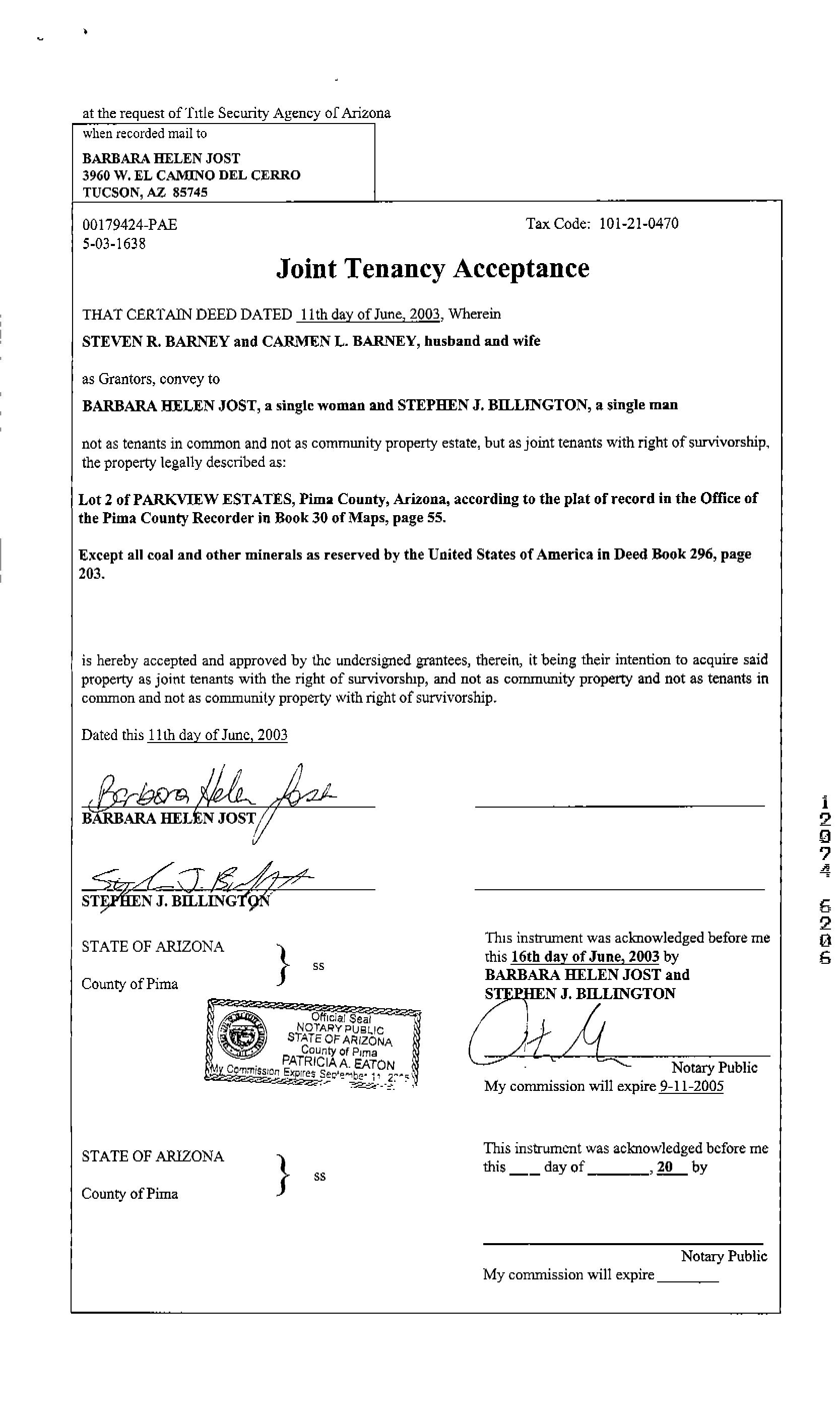 Owner Name : Jost Barbara Helen / Billington Stephen J