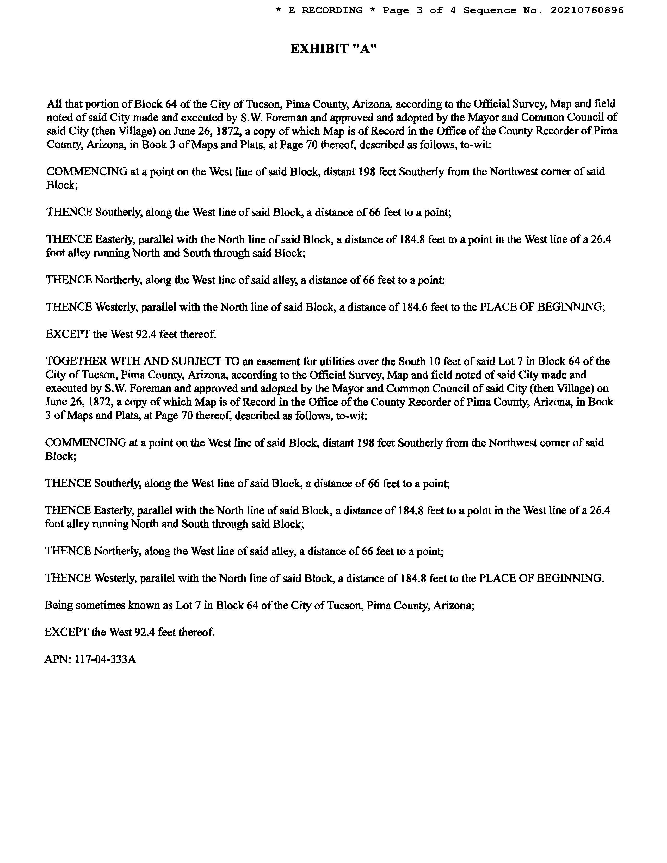Legal Description : Tucson Lot 7 Blk 64 Exc W92.4'