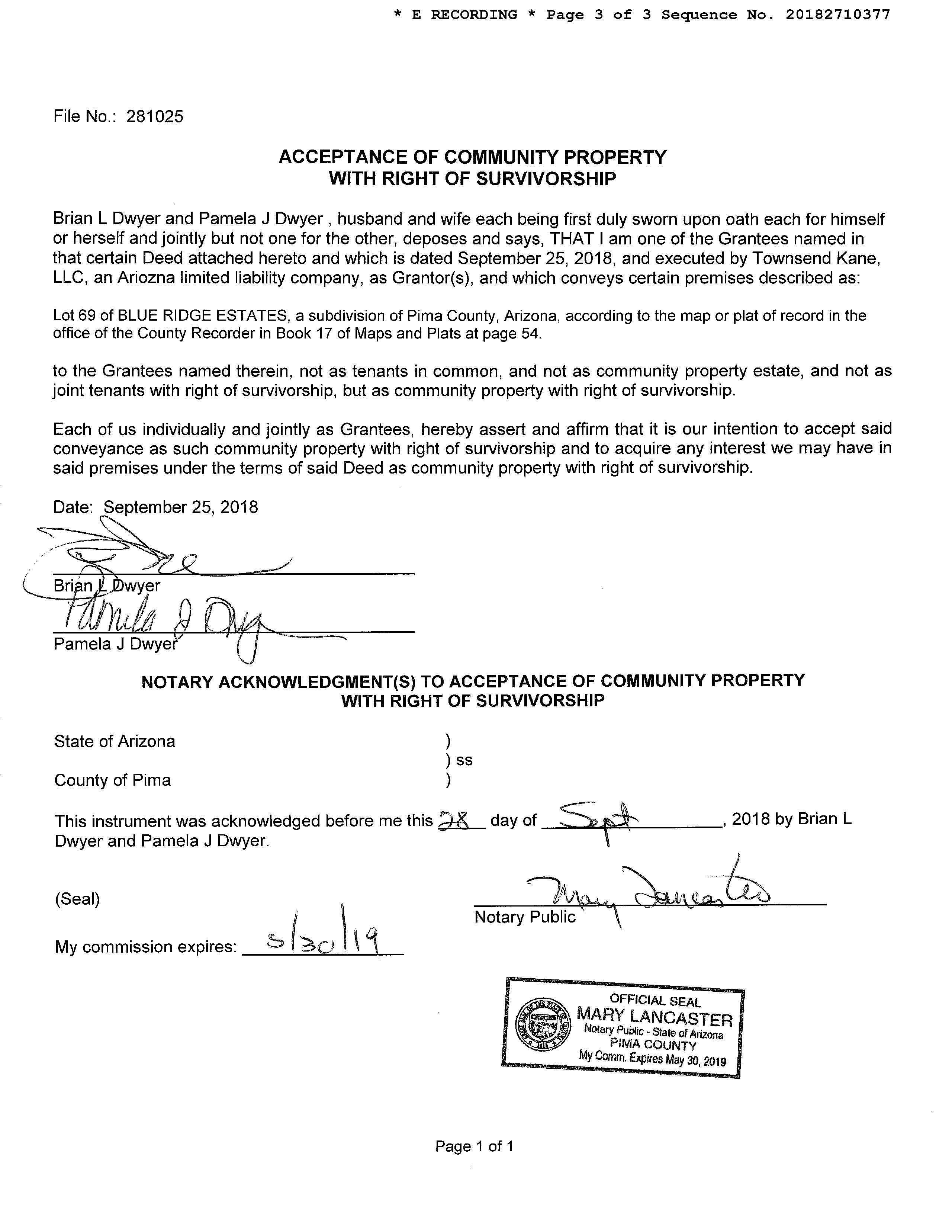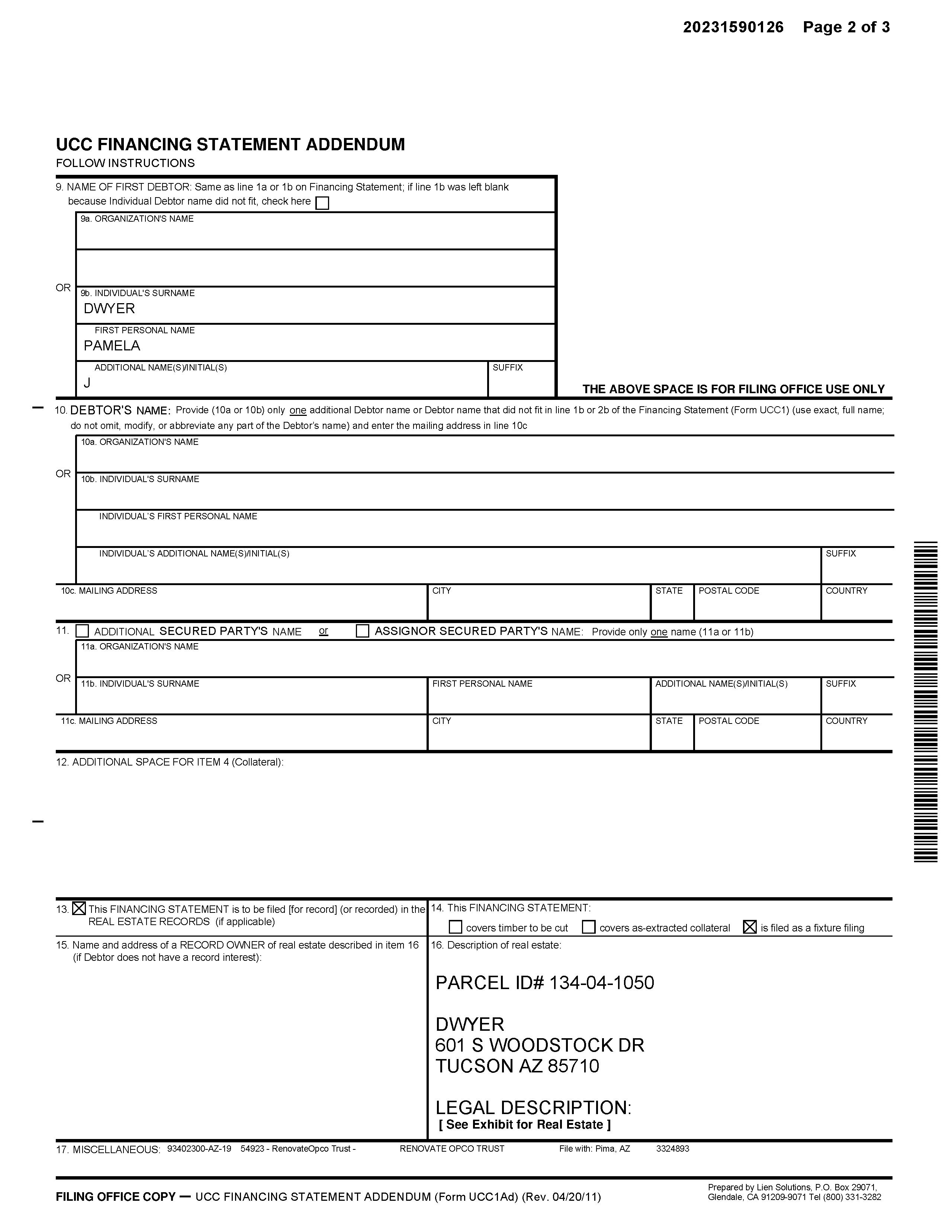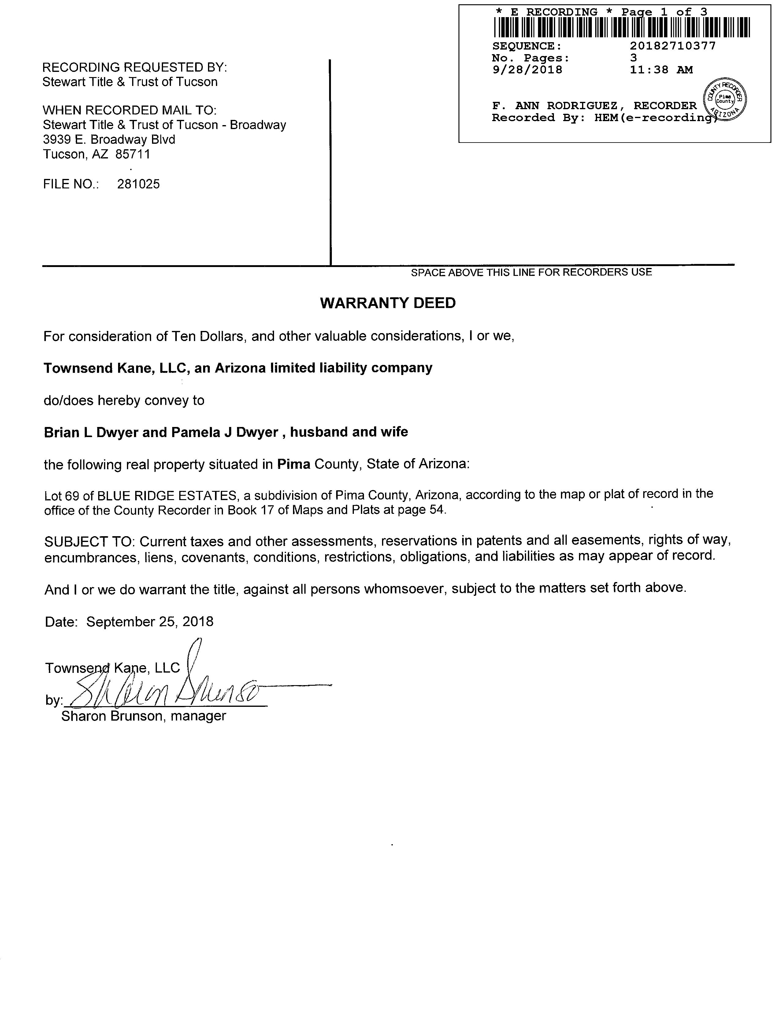 Subject Property: 601 S Woodstock Dr Tucson Az 85710 Owner Name: Dwyer Brian L /Dwyer Pamela J