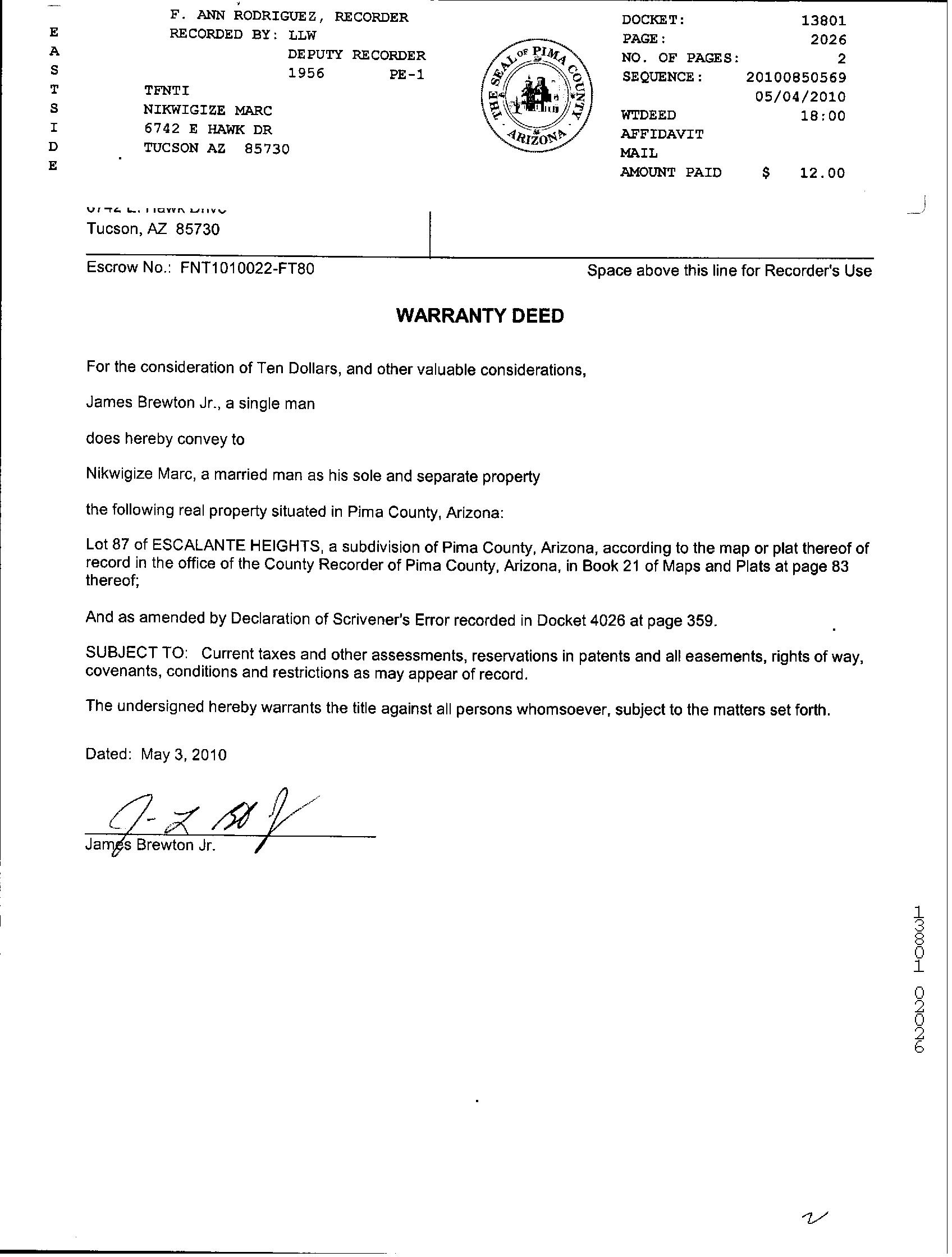 Owner Name: Marc Nikwigize / APN / Alternate APN: 136-23-2320 / Deed Type: Warranty Deed