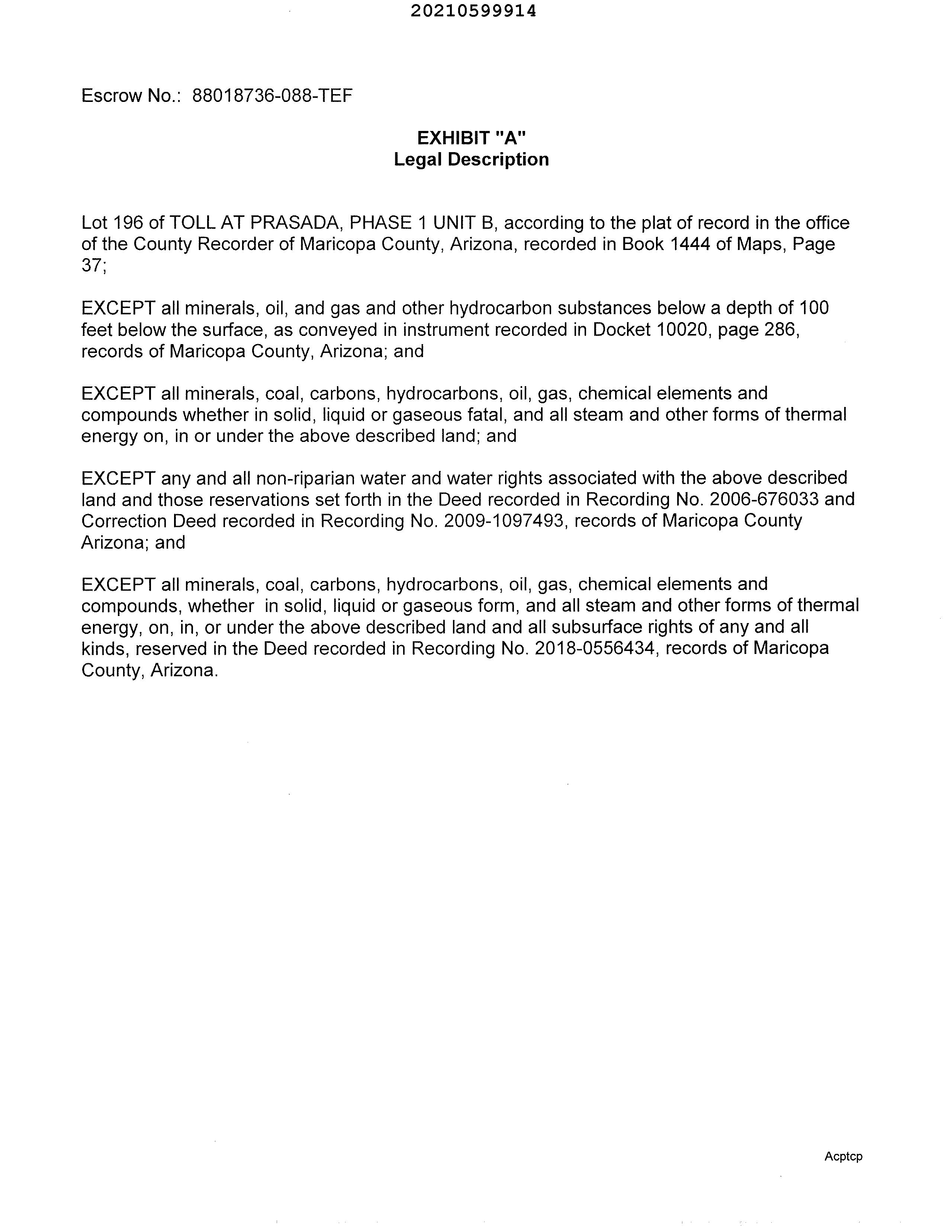 Legal Description : Lot 196 Toll At Prasada Phase 1 Unit B Mcr 1444-37