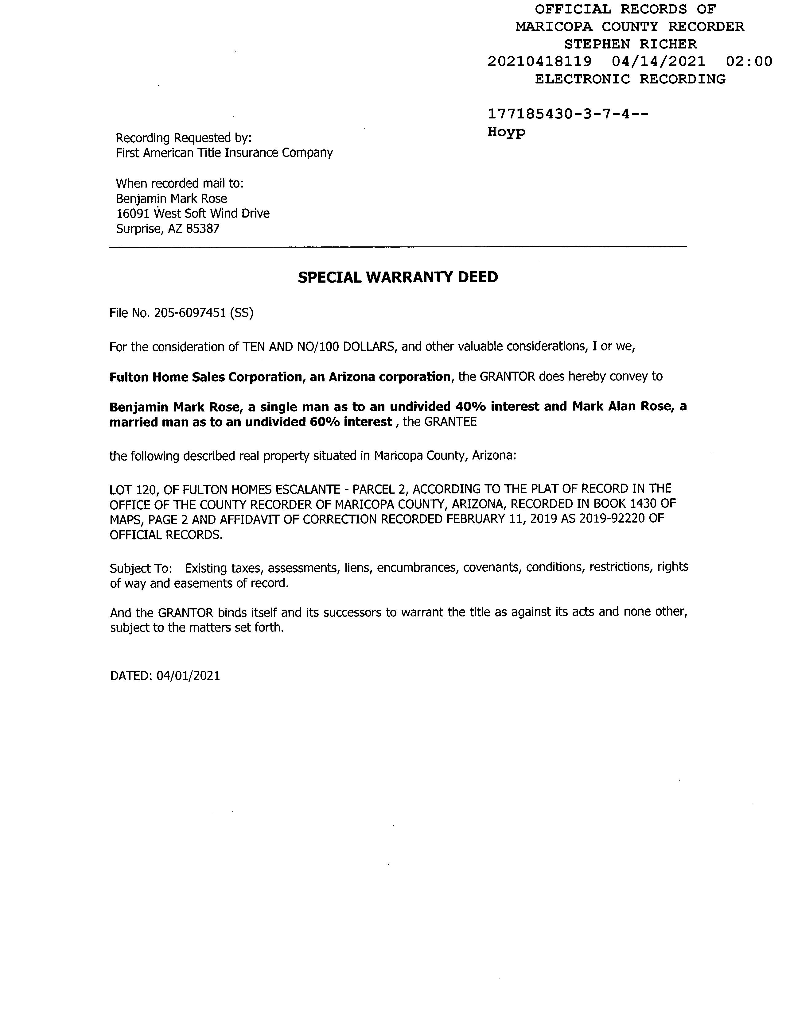 Owner Name: Rose Benjamin Mark /Rose Mark Alan