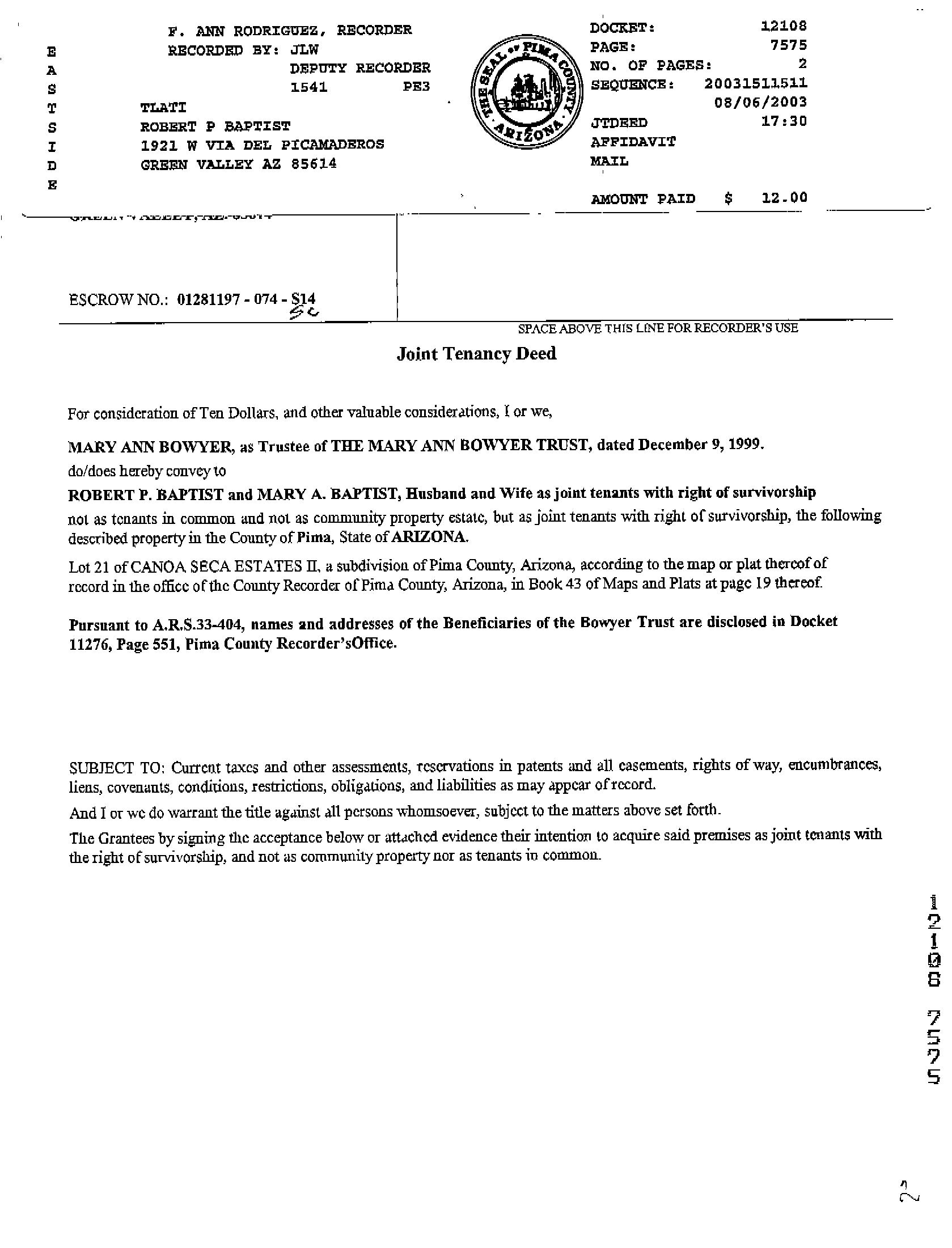 Recording/Sale Date : 08/06/2003 / 07/31/2003 Deed Type : Joint Tenancy Deed