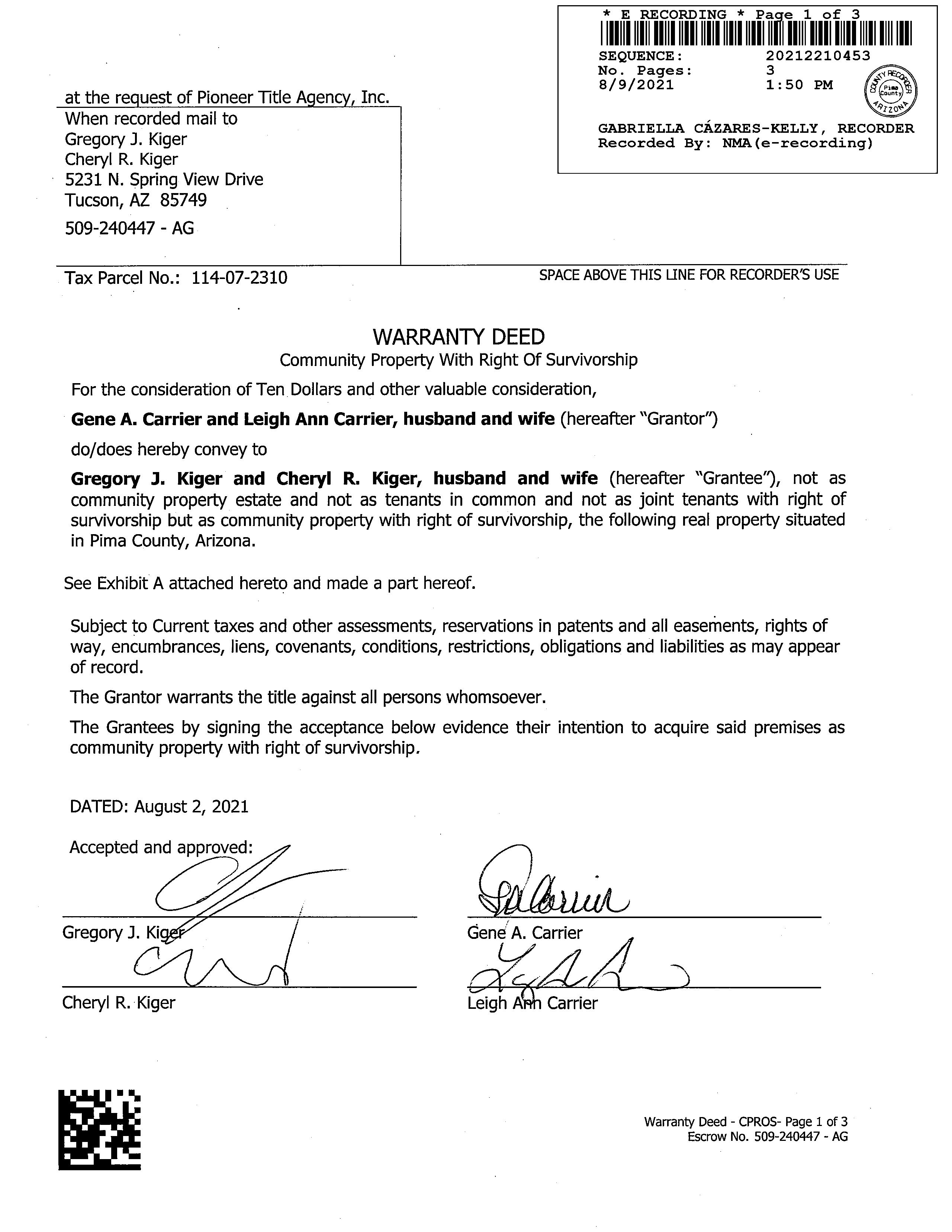 Owner Name: Kiger Gregory J /Kiger Cheryl R