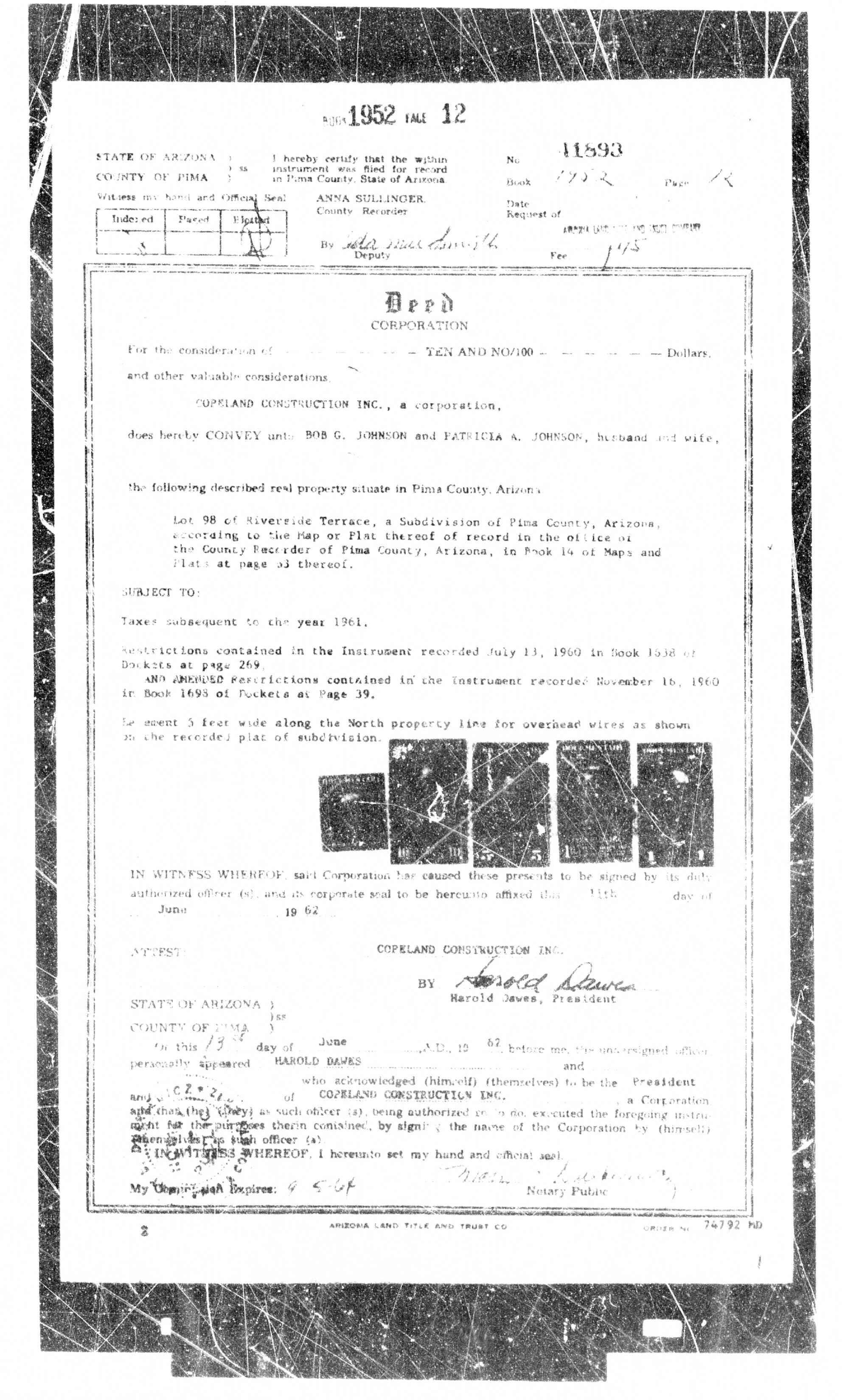 Subject Property: 1750 W Hudson Dr Tucson Az 85704 Owner Name: Johnson Bob G /Johnson Patricia A APN / Alternate APN: 104-02-0900 / Deed Type: Deed (reg) Land Use: Sfr Subdivision / Tract: Riverside Terrace / Lot Size: 18,657 Year Built / Eff: 1962 / Rec. Date / Price: 06/18/1962 / $ Living Area: 1,695 # of units: Document #: 1952-12 Bedrooms: Pool: Pool Total Tax Value: $235,532 Bath(F/H): / #1 5314 N Mesquite Bosque Way Tucson Az 85704 Owner Name: Kosinski Luke / APN / Alternate APN: 104-01-2590 / Deed Type: Warranty Deed Land Use: Sfr Subdivision / Tract: Riverside Xing / Lot Size: 4,920 Year Built / Eff: 2000 / Rec. Date / Price: 02/16/2023 / $335,000 Living Area: 1,600 # of units: Document #: 470422 Bedrooms: Pool: Total Tax Value: $191,014 Bath(F/H): / #2 1650 W Hudson Dr Tucson Az 85704 Owner Name: Ksw Properties Llc / APN / Alternate APN: 104-02-0850 / Deed Type: Warranty Deed Land Use: Sfr Subdivision / Tract: Riverside Terrace / Lot Size: 15,955 Year Built / Eff: 1961 / Rec. Date / Price: 06/24/2022 / $340,000 Living Area: 1,650 # of units: Document #: 1750149 Bedrooms: Pool: Total Tax Value: $202,094 Bath(F/H): / #3 5356 N Mesquite Bosque Way Tucson Az 85704 Owner Name: Yamasa Co Ltd / APN / Alternate APN: 104-01-2660 / Deed Type: Warranty Deed Land Use: Sfr Subdivision / Tract: Riverside Xing / Lot Size: 4,519 Year Built / Eff: 2000 / Rec. Date / Price: 03/28/2022 / $337,000 Living Area: 1,600 # of units: Document #: 870676 Bedrooms: Pool: Total Tax Value: $191,040 Bath(F/H): / #4 1652 W Roller Coaster Rd Tucson Az 85704 Owner Name: Wolford Benjamin P /Asencio Christina E APN / Alternate APN: 104-02-146A / Deed Type: Warranty Deed Land Use: Sfr Subdivision / Tract: Riverside Terrace / Lot Size: 15,048 Year Built / Eff: 1962 / Rec. Date / Price: 12/14/2022 / $375,000 Living Area: 1,660 # of units: Document #: 3480248 Bedrooms: Pool: Total Tax Value: $204,451 Bath(F/H): / Customer Name : Chantel Cortez Customer Company Name : FIRST AMERICAN TITLE Prepared On : 03/02/2023 © 2023 CoreLogic. All rights reserved