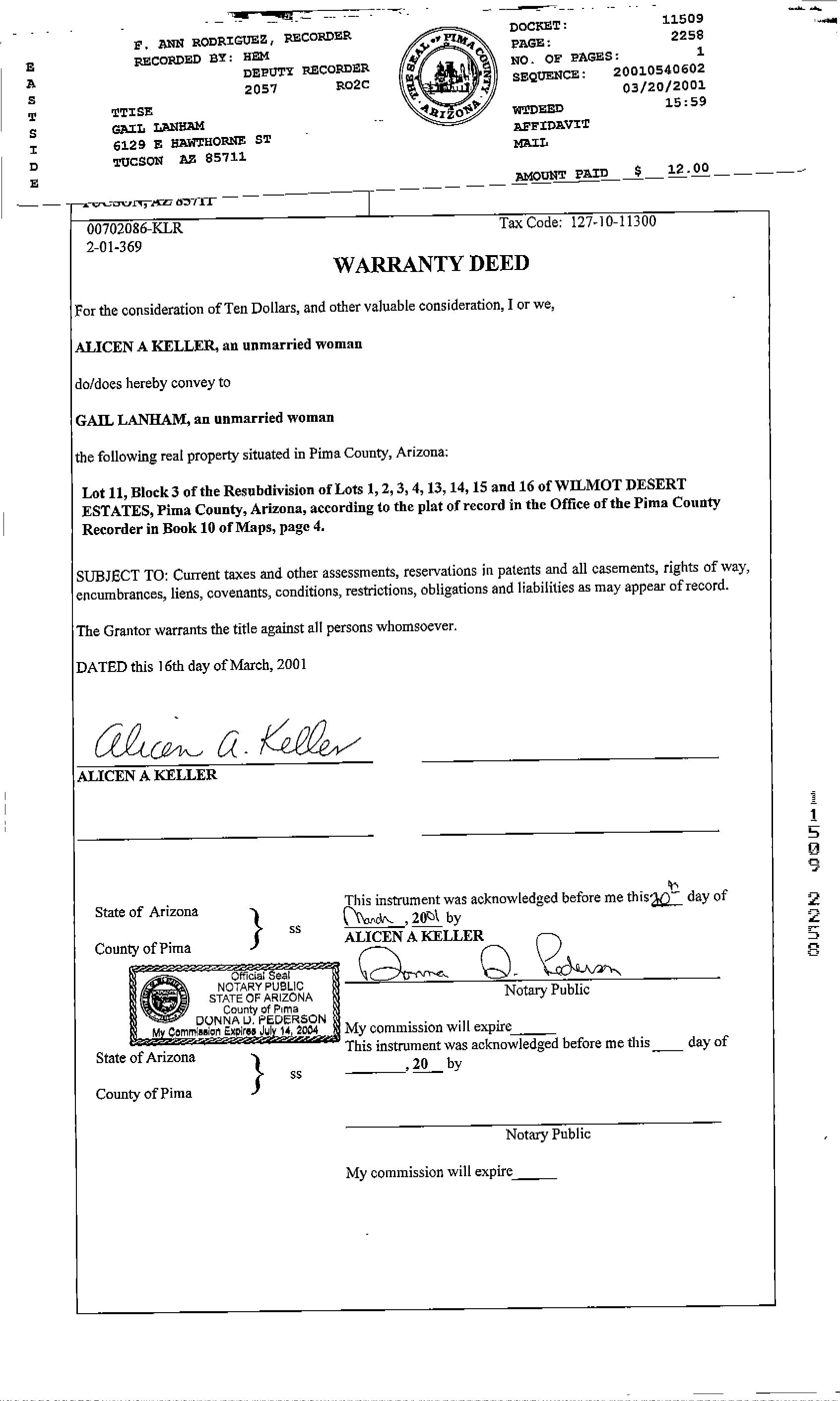 Owner Name : Pfeffer Donald John Subdivision : Catalina Heights Anx