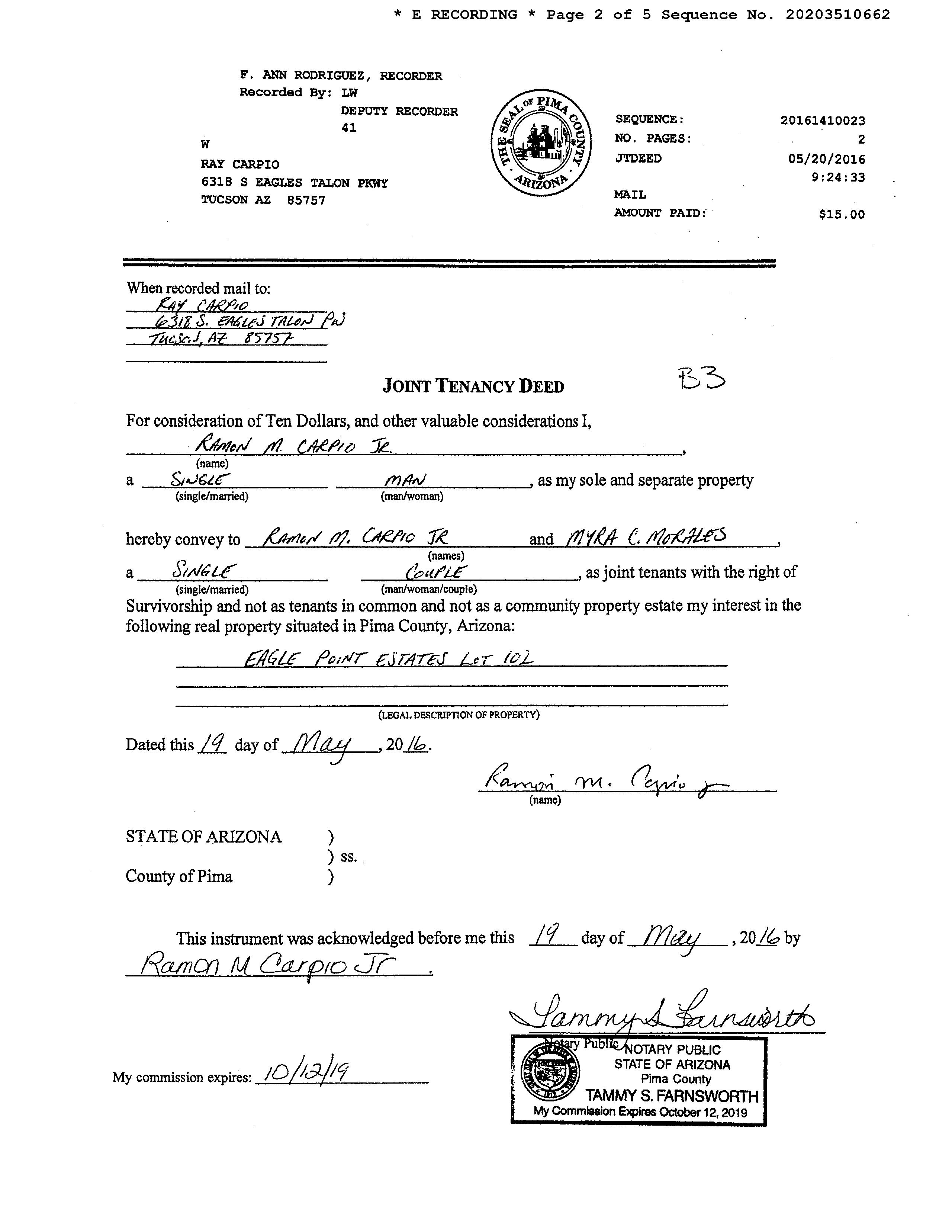 Ynaann M APN / Alternate APN: 210-15-5490 / Deed Type: Joint Tenancy Deed Land Use: Sfr Subdivision / Tract: Sonoran Ranch Estates / Lot Size: 8,786 Year Built / Eff: 2005 / Rec. Date / Price: 04/12/2023 / $345,000 Living Area: 1,945 # of units: Document #: 1020552 Bedrooms: Pool: Pool Total Tax Value: $191,158 Bath(F/H): /