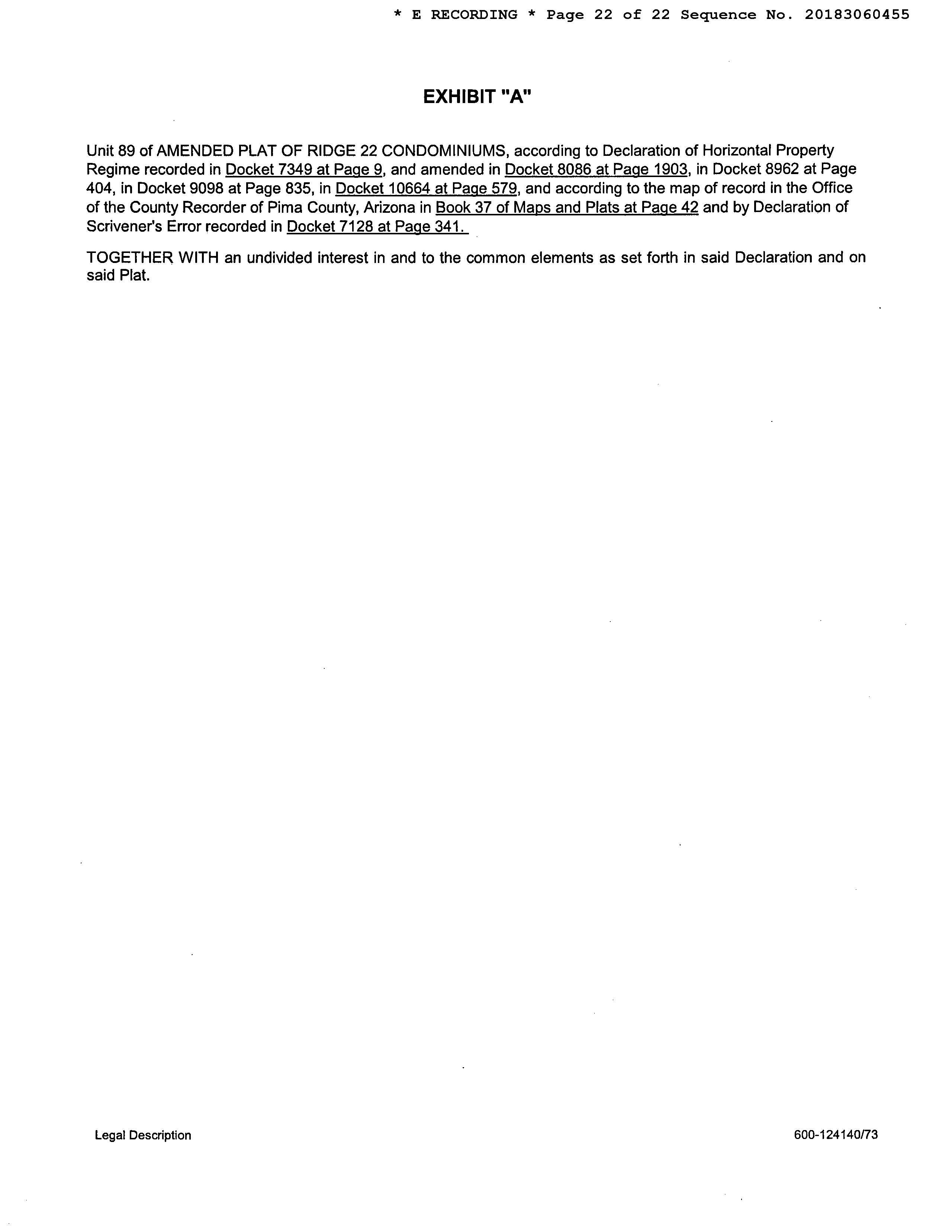 Legal Description : Ridge Twenty Two Condominiums Amended Unit 89 County : Pima, Az APN : 135-07-5540