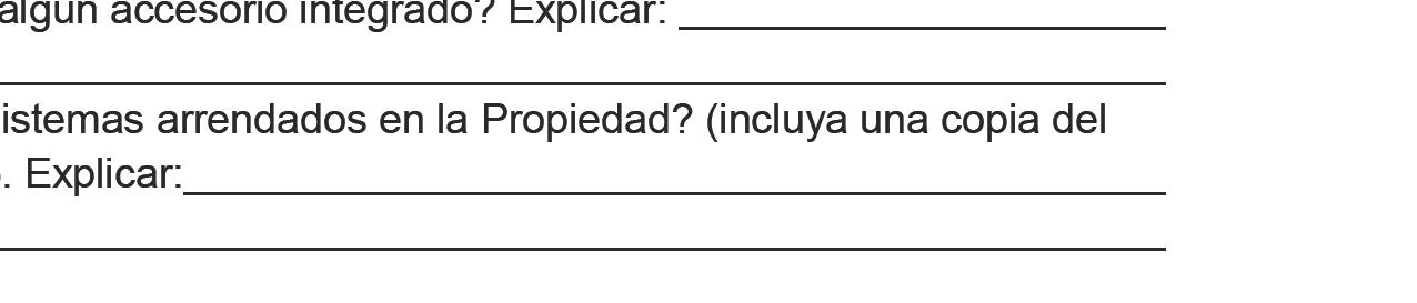 • Sistemas rociadores buzón de correo • bocinas empotradas • Mosquiteros para puertas y ventas, celosías Si son propiedad del Vendedor, la venta también incluye los siguientes conceptos: sistemas fijos de poder alterno que suministran al • equipo y cubiertas para piscina y spa/jacuzzis • sistemas y alarmas de seguridad y contra incendios al inmueble (es decir, solar) a nivel incluyendo los sistemas de limpieza • sistemas de purificación de agua mecánicos u otros Bienes muebles existentes adicionales incluidos en esta venta (si se marcan): refrigerador (descripción): lavadora (descripción): 58. secadora (descripción): equipo, cubiertas y otros sistemas mecánicos o de limpieza para spa/jacuzzi por encima del nivel de tierra (descripción): bienes muebles adicionales no abordados de otro modo (descripción): bienes muebles adicionales no abordados de otro modo (descripción): Los bienes muebles existentes adicionales que se incluyan no se considerarán como parte del Inmueble y se transferirán sin valor monetario, libres y exentos de toda responsabilidad u obligación. Los artículos arrendados NO se incluirán en esta venta. El Vendedor notificará acerca de todos los artículos arrendados en un plazo de tres (3) días después de que se acepte el Contrato. El Comprador notificará acerca de cualquier artículo arrendado que no se apruebe dentro del Período de 67. inspección o en un plazo de cinco (5) días después de recibir el aviso, lo que suceda al último SI ESTA VENTA SE REALIZA COMPLETAMENTE EN EFECTIVO, La Sección 2 no aplica, pase a la sección 3.