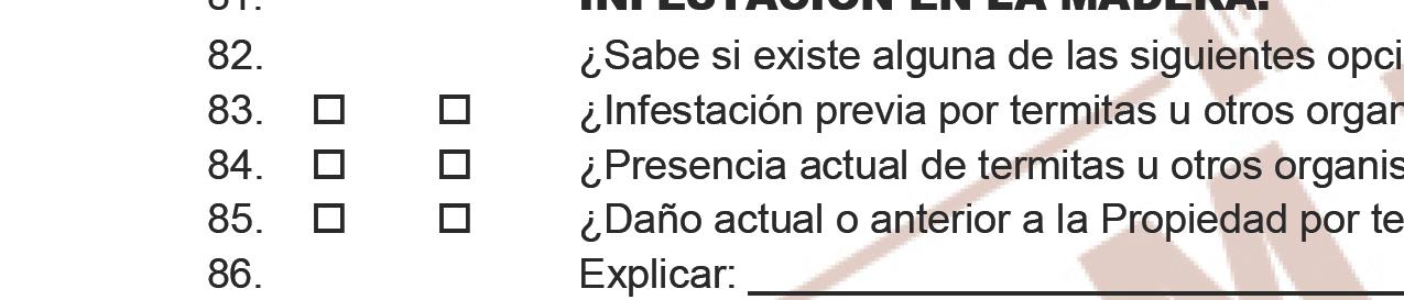 43. PARA BRINDAR NOTIFICACIÓN POR ESCRITO AL VENDEDOR ACERCA DE LOS CONCEPTOS NO APROBADOS 44. INFORMACIÓN QUE EL COMPRADOR DEBE RECIBIR POR LEY 1. Una copia de los estatutos y reglas de la asociación 2. Una copia de la declaración de Estipulaciones, Condiciones y Restricciones (Covenants, Conditions and Restrictions, CC&R). 3. Una declaración fechada que incluya: 48. (a) El número telefónico y dirección del contacto principal de la asociación, el cual puede ser un gerente de la asociación, una compañía 49. de gestión de asociación, un ejecutivo de la asociación o cualquier otra persona que designe la Junta Directiva (b) El monto de la evaluación de gastos comunes y la evaluación de gastos comunes por pagar, evaluaciones especiales u 51. otras evaluaciones, cuotas o cargos pendientes y pagaderos por parte del Vendedor. (c) Una declaración que aclare si una parte de la unidad está cubierta por aseguramiento que mantenga la asociación. (d) El monto total del dinero que retiene la asociación a modo de reserva. (e) Si la asociación proporciona la declaración, una declaración que aclare si los registros de la asociación reflejan cualquier 55. alteración o mejora a la unidad que violen la declaración. La asociación no está obligada a brindar información acerca de alteraciones o mejoras que ocurrieron más de 6 años antes de la venta propuesta. El Vendedor permanece obligado a divulgar alteraciones o mejoras al Inmueble que violen la declaración. La asociación puede tomar acciones contra 58. el Comprador por infracciones aparentes al momento de la compra que no se reflejen en los registros de la asociación (f) Si el Vendedor proporciona la declaración, una declaración que aclare si el Vendedor tiene conocimiento de cualquier alteración o mejora a la unidad que violen la declaración. (g) Una declaración de nombres y números de casos de litigios pendientes respecto al Inmueble o a la asociación, incluyendo el monto de cualquier reclamación monetaria 4. Una copia del presupuesto operativo actual de la asociación Una copia del informe financiero anual más reciente de la asociación. Si el informe tiene más de diez páginas, la asociación ofrecerá un resumen del informe en lugar del informe completo Una copia del estudio de reservas más reciente de la asociación, si lo hay Cualquier otra información que exija la ley. Una declaración para que el Comprador acuse y firme, conforme a la Ley de Arizona. la los reservado