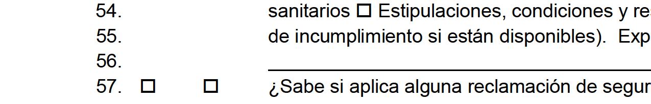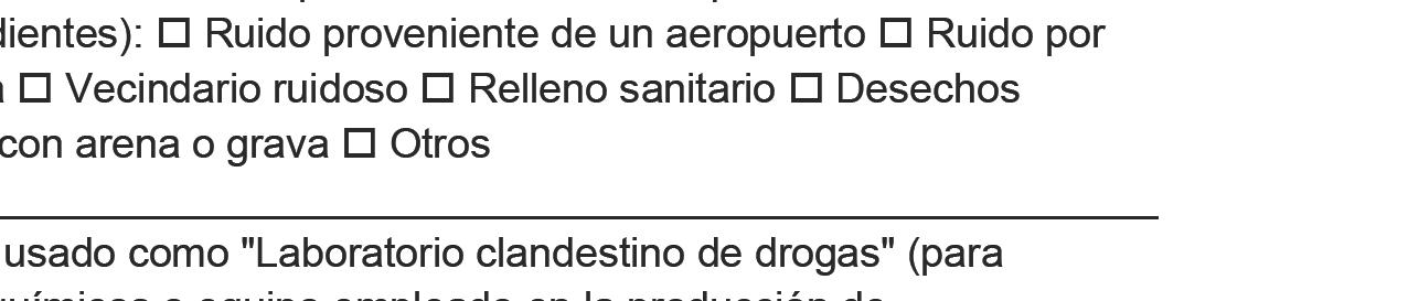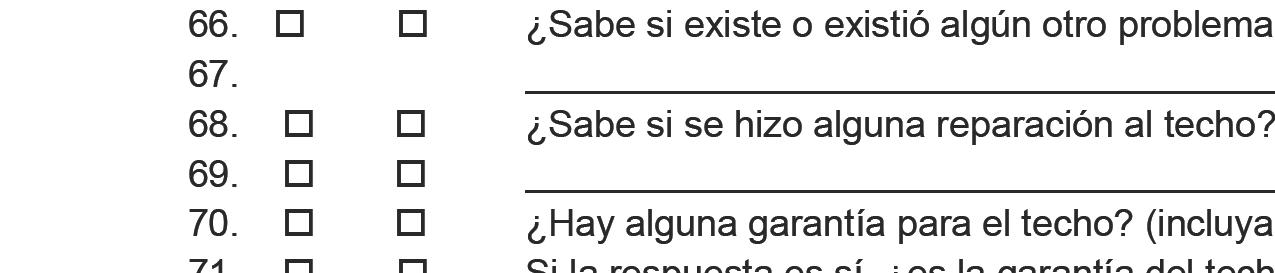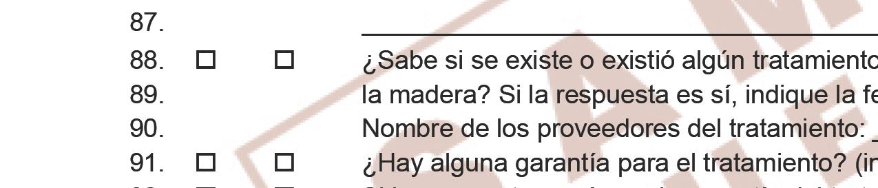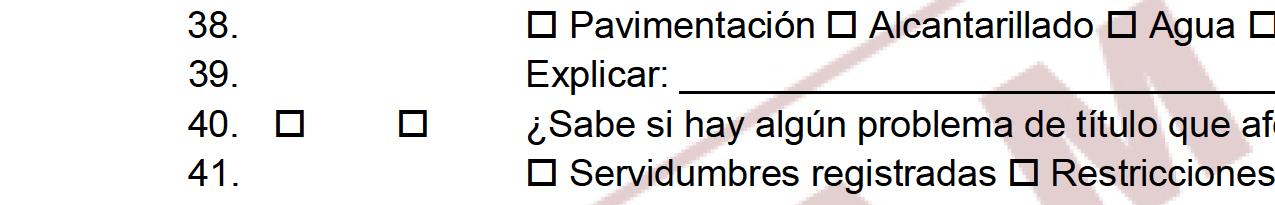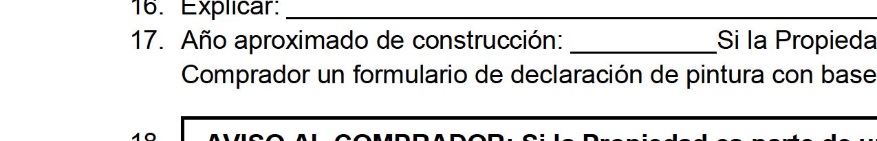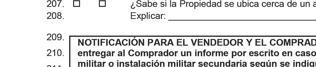 • Sistemas rociadores buzón de correo • bocinas empotradas • Mosquiteros para puertas y ventas, celosías Si son propiedad del Vendedor, la venta también incluye los siguientes conceptos: sistemas fijos de poder alterno que suministran al • equipo y cubiertas para piscina y spa/jacuzzis • sistemas y alarmas de seguridad y contra incendios al inmueble (es decir, solar) a nivel incluyendo los sistemas de limpieza • sistemas de purificación de agua mecánicos u otros Bienes muebles existentes adicionales incluidos en esta venta (si se marcan): refrigerador (descripción): lavadora (descripción): 58. secadora (descripción): equipo, cubiertas y otros sistemas mecánicos o de limpieza para spa/jacuzzi por encima del nivel de tierra (descripción): bienes muebles adicionales no abordados de otro modo (descripción): bienes muebles adicionales no abordados de otro modo (descripción): Los bienes muebles existentes adicionales que se incluyan no se considerarán como parte del Inmueble y se transferirán sin valor monetario, libres y exentos de toda responsabilidad u obligación. Los artículos arrendados NO se incluirán en esta venta. El Vendedor notificará acerca de todos los artículos arrendados en un plazo de tres (3) días después de que se acepte el Contrato. El Comprador notificará acerca de cualquier artículo arrendado que no se apruebe dentro del Período de 67. inspección o en un plazo de cinco (5) días después de recibir el aviso, lo que suceda al último SI ESTA VENTA SE REALIZA COMPLETAMENTE EN EFECTIVO, La Sección 2 no aplica, pase a la sección 3.