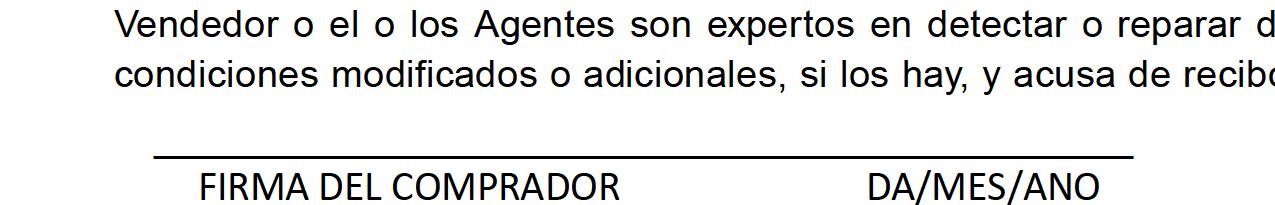 § 33-1806). El Comprador acusa además que el o los agentes no verificaron la información contenida en el presente. Por ende, el Comprador acuerda eximir 95. al Vendedor y a los Agentes en caso de que las CUOTAS PAGADERAS AL CIERRE DE GARANTÍA sean incorrectas o estén incompletas 96. El suscrito acepta los términos y condiciones adicionales establecidos anteriormente y acusa de recibo una copia de los mismos 97. 98. ^FIRMA DEL COMPRADOR