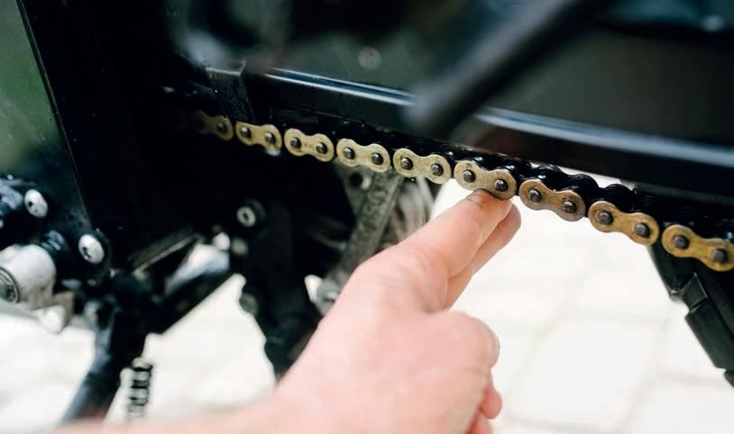 Check the pressures when the tyres are cold because the pressure will read higher when they’re hot. See that the tread depth of both tyres is greater than 1.0mm, as this is the minimum for motorcycle tyres in the UK. Clear out any small stones from within the tread and ensure there’s nothing penetrating the tyre.