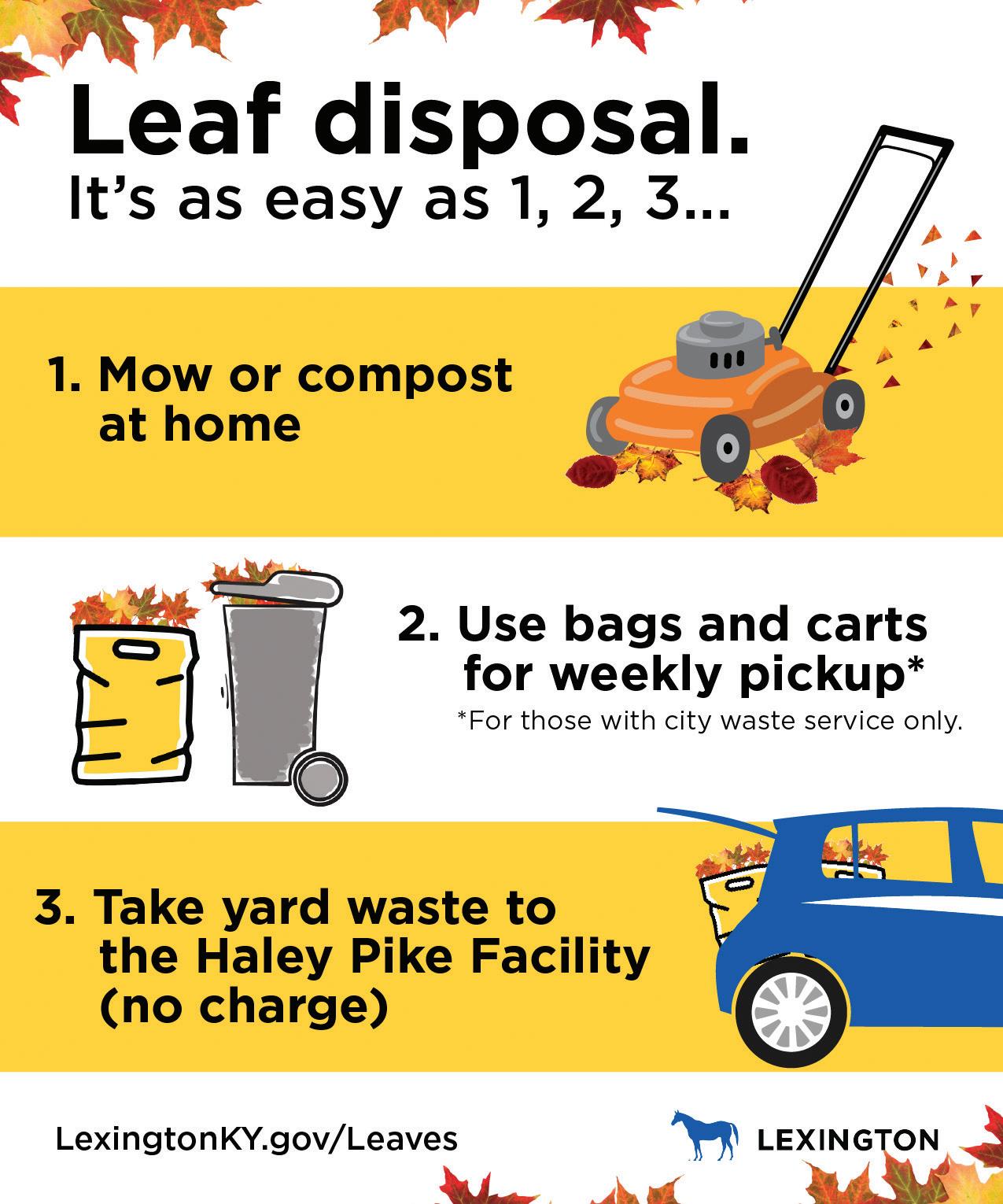 For those who dispose of their leaves in bags or yard carts, residents with city waste service will have weekly pick-up of yard waste on regular service days. Waste Management employees will collect gray yard carts each week, except the week of Thanksgiving. Yard waste bags will be collected each week. Though carts will not be collected Thanksgiving week, yard waste bags will be picked up. All Fayette