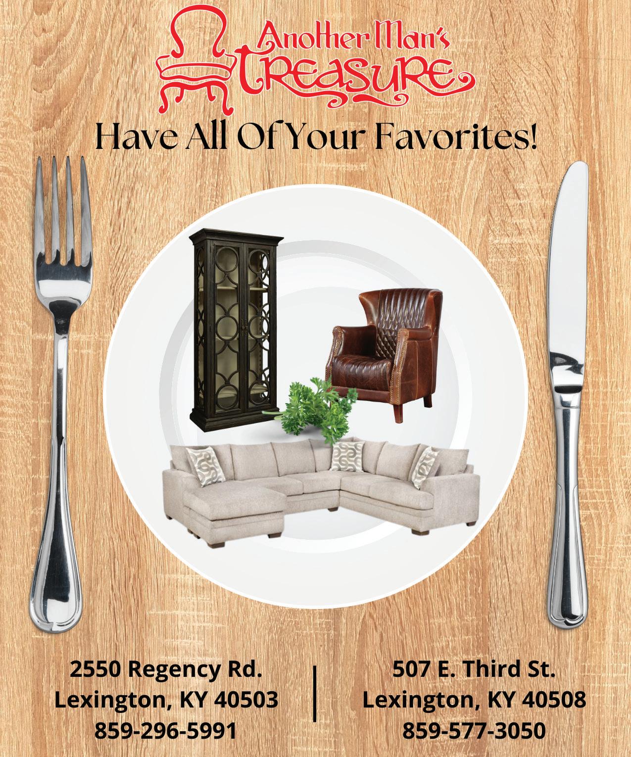 acemagazinelex.com | November 2022 | 5 P9 ARCHIVE Sharing 33 years of archives in our 2022 print editions The Blessing of the Hounds at the Iroquois Hunt Club P17 ACE EATS OUT Zundo opens and Peach Cobbler is coming to town P6 BUSINESS NEWS Remembering grocery legend Walt Barbour P16 ACE EATS IN Reality Truck: Tis the Season to enter the Friendship Bread Relocation Program ANTIQUES & FINE FURNISHINGS 925 Liberty Road Lexington, KY 40505 859-258-2232 www.libertyhilllexington.com libertyhillantiques@gmail.com Enjoy 10-40% Off Select Items for the Month of June JUNE SALE! Antiques • Fine Art • Mirrors, Fine Reproductions • Lamps Chandeliers • China • Crystal Silver • Garden Furniture • Rugs Pillows • Table Linens • Barware Waterford and Baccarat crystal Herend, Spode, Haviland and Bing and Gronndahl china Chapman, Frederick Cooper and Ralph Lauren lamps Henkel Harris, Hickory Chair, C. R. Laine, Sherrill, Stanford, Lee Industries, Kittinger, Maitland-Smith, La Barge, and Carvers’ Guild furniture Fine English and American antiques Paintings and prints Silver gifts and accessories WE ARE EXPANDING! Soon opening an additional 3000 square feet of showroom! 925 Liberty Road Lexington, KY 40505 859-258-2232 www.libertyhilllexington.com libertyhillantiques@gmail.com ace@firstmedialex.com