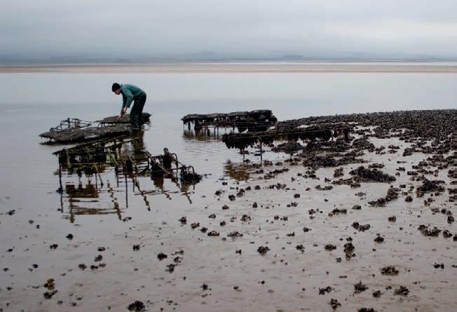Opposite from top: Mussels; David Jarrad This page from top: Farmer collecting oysters from beds near Holy Island (Lindisfarne) in Northumbria, England; Fresh oysters; Fishmonger shucking fresh oysters on the Isle of Skye
