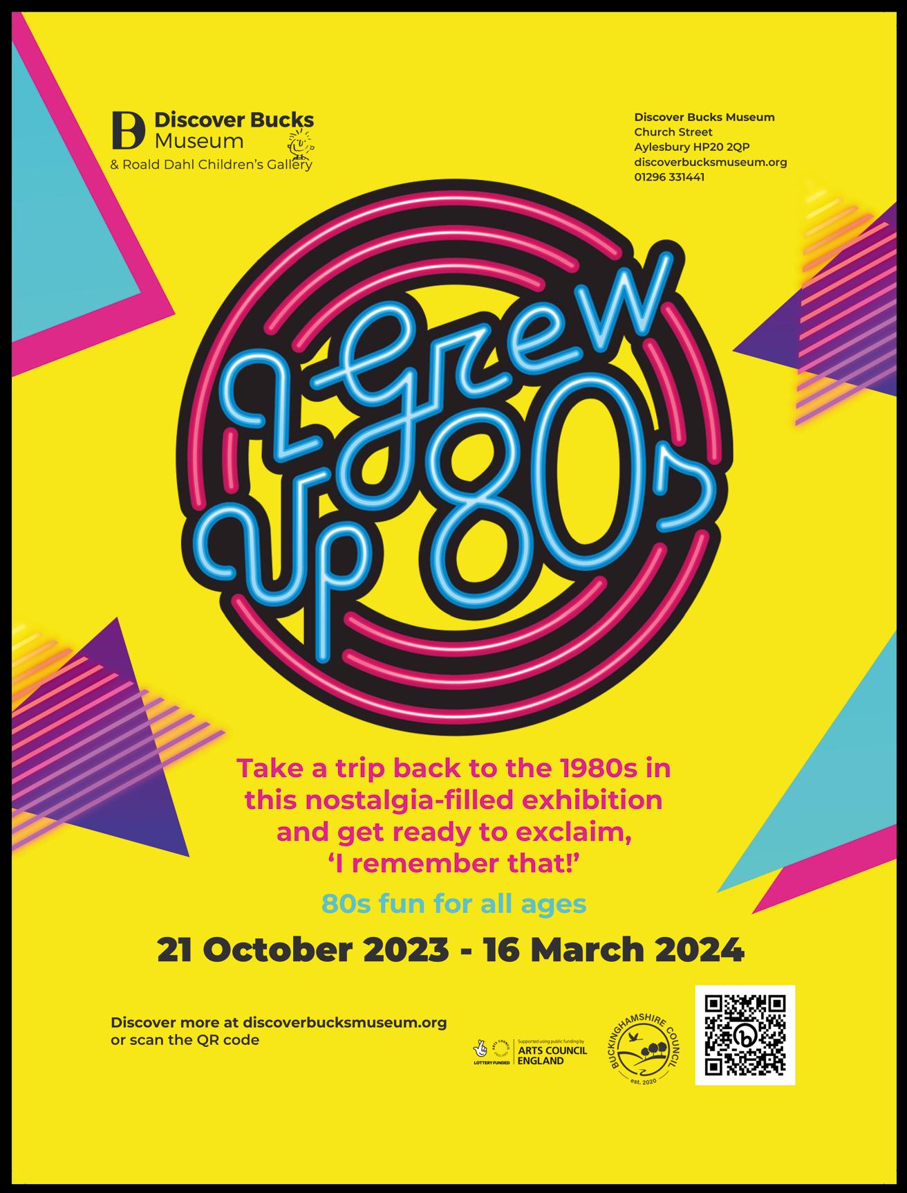 We have a full programme of special 80s events including 80s Quiz and Disco Night with Dan Blaze on 25 November 2023 and much more! I Grew Up 80s opens on 21 October 2023 and runs until 16 March 2024. For more information, opening times and ticket prices visit discoverbucksmuseum.org