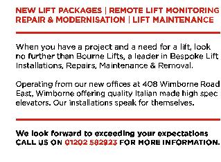 Operating from our new offices at 408 Wimborne Road East, Wimborne offering quality Italian made high spec elevators. Our installations speak for themselves. We look forward to exceeding your expectations CALL US ON 01202 582923 FOR MORE INFORMATION BESPOKE LIFT INSTALLATION, ENGINEERING AND MAINTENANCE 07808 813804 | 01202 582923 matt@bournelifts.co.uk www.bournelifts.co.uk 408 WIMBORNE RD E, WIMBORNE BH22 9ND