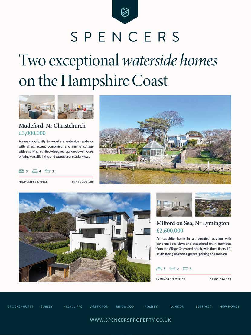 complete with waterside restaurants and cafes. Merlins is built and finished to a superb standard with its principal rooms and large balconies focussed on its exceptional views across the village to the waters of the Solent and the Isle of Wight. A lift provides access to all floors and there remains scope for a purchaser to select their own kitchen and final décor. Guide price £2,600,000 Spinnaker House is unrivalled in its proximity to the shore with direct access to the waters of Christchurch Harbour from steps at the end of the garden. From both the house and its south facing garden one can take in the exceptional, everchanging views across this glorious natural habitat as well as enjoy the harbour from your own dinghy or paddle board. The house offers extensive accommodation totalling over 3,700 square feet including an independent 2 bedroom cottage ideal as space for guests or to generate a rental income. A summer house at the end of the garden provides the perfect spot to admire the view as the sun goes down. Guide Price £3,000,000. spencersproperty.co.uk