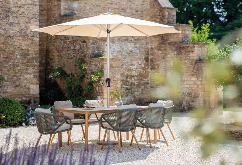 that blends beautifully with nature. Featuring a sleek ceramiceffect table, eight rope-weave chairs with season-proof cushions in Driftwood, and a matching parasol with base.