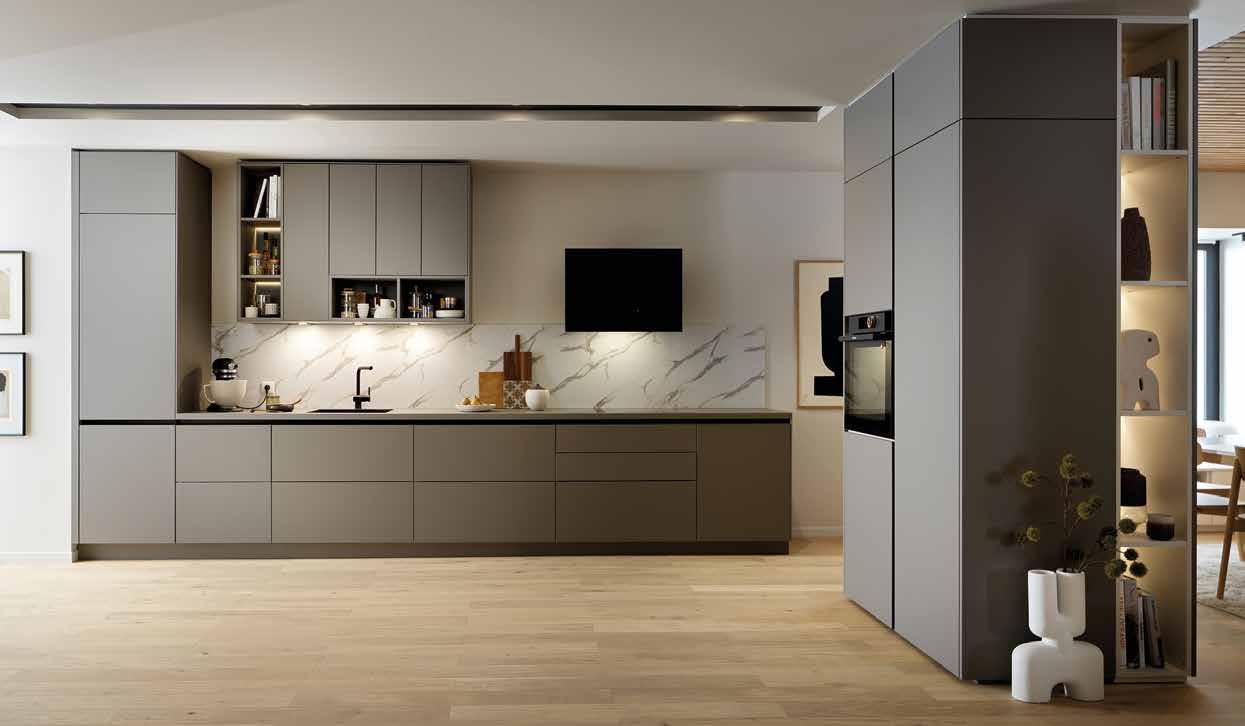 Every home is different. Every home is unique. Schmidt knows and understands this, which is why its furniture collections are designed to complement every area of the home, from kitchens, dining areas and utility rooms to living spaces, bedrooms and the home office. Thanks to Schmidt’s innovative bespoke interior design, there is something to suit every space and every lifestyle. The Arcos handleless range features a ultra-matt finish with high density particle board fronts and a choice of seven colours shown here in Nano Claystone, a no-fingerprint finish, with matching Claystone laminate worksurfaces and a Marmor laminate splashback with a veined marble effect. The recessed handle enhances a sense of space and a seamless flow throughout, while black appliances, sink and tap complement the grey furniture beautifully while adding an on-trend modern detail. The full-height cabinets with built-in
