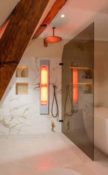 mental benefits, helping to ease muscle tension, improve circulation and create a sense of total relaxation at the end of a long day. Alongside this, innovations such as a Sunshower are becoming increasingly sought after. Combining gentle infrared heat with low-level UV light, a Sunshower can support muscle recovery, promote wellbeing and provide a subtle mood boost, all within the comfort of your own shower space. When paired with chromotherapy lighting, which uses colour to influence mood and energy levels, the result is a truly immersive experience. Soft, warm tones can help you unwind in the evening, while cooler hues can energise you in the morning, allowing your bathroom to adapt to your routine.