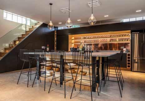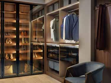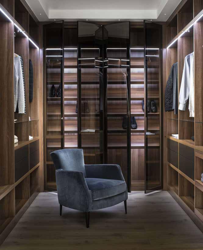 use. Where space allows, seating is included, while features such as coffee stations or even mini bars elevate the experience, turning the dressing room into an extension of the home’s living spaces. Material choices are key to setting the tone.